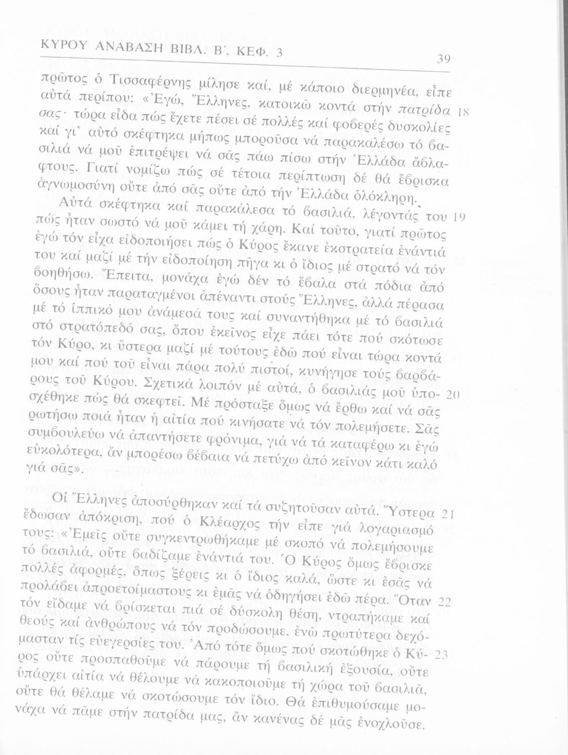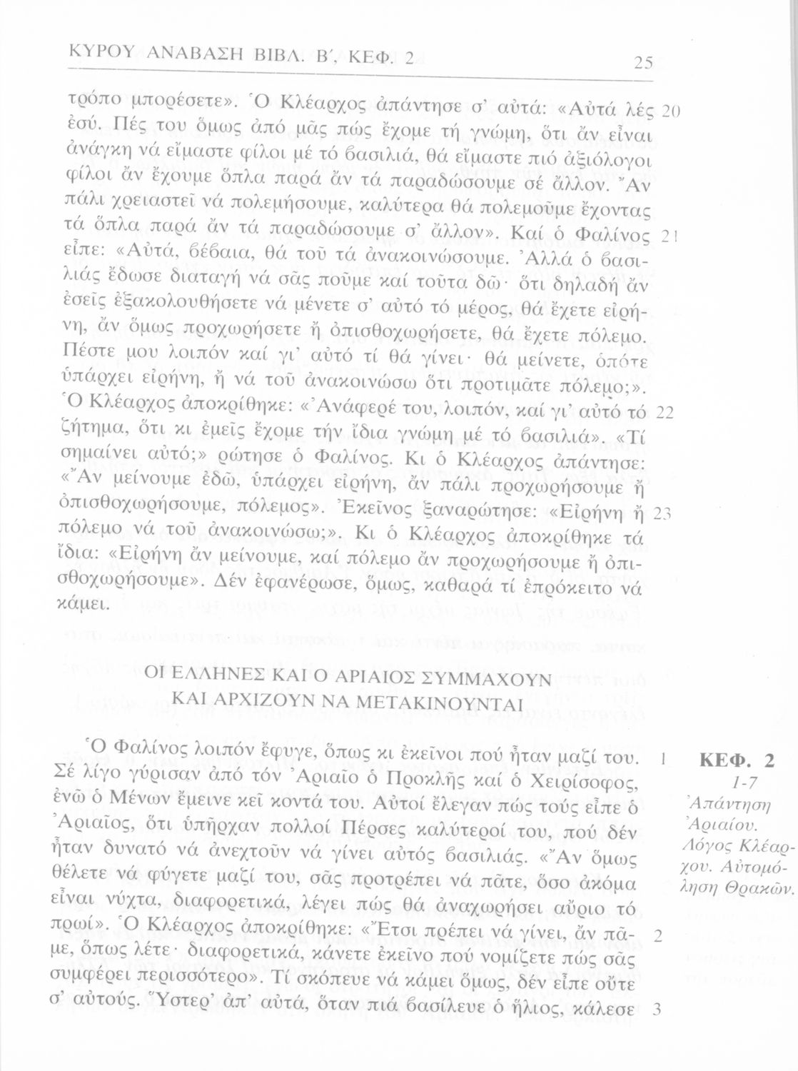 Σχολικό εγχειρίδιο Αρχαίων Ελληνικών α΄ Γυμνασίου που περιλαμβάνει μετάφραση του έργου του Ξενοφώντα Κύρου Ανάβασις, εισαγωγικά σχόλια για τη ζωή και το έργο του, και ερμηνευτικές παρατηρήσεις.
