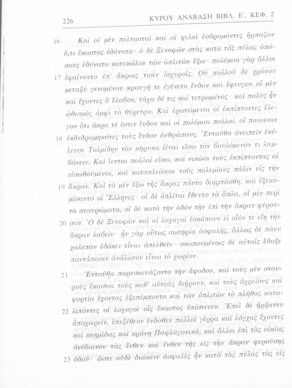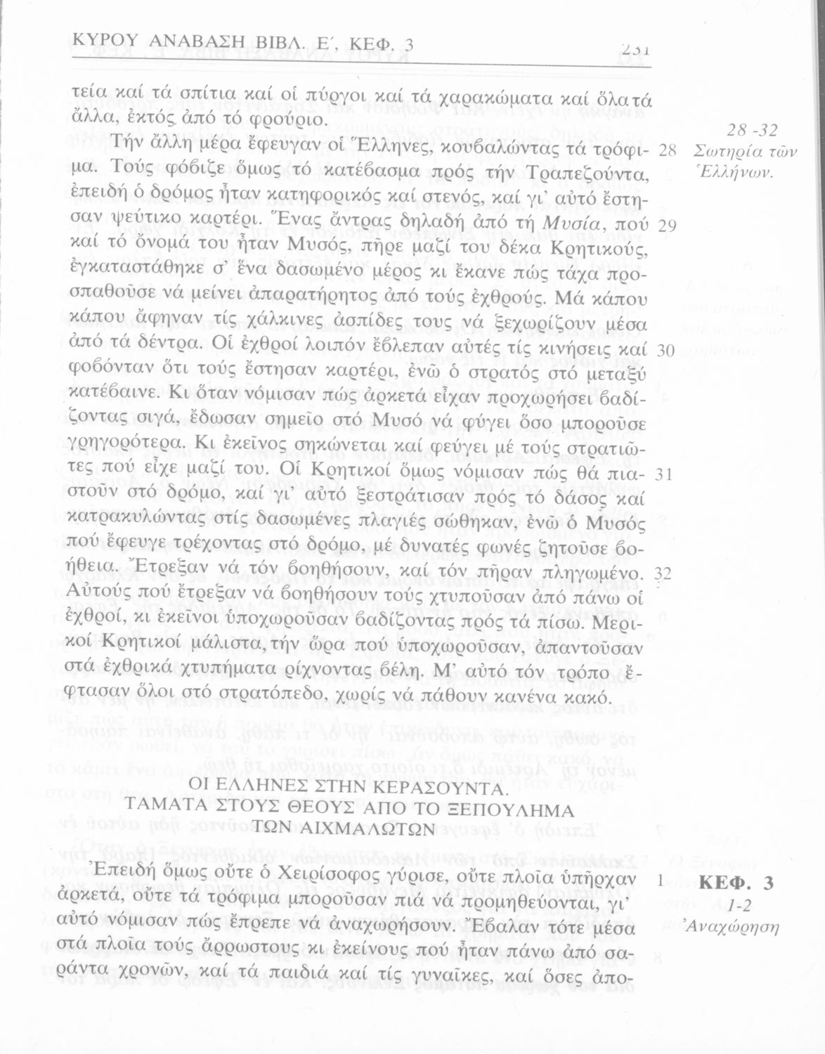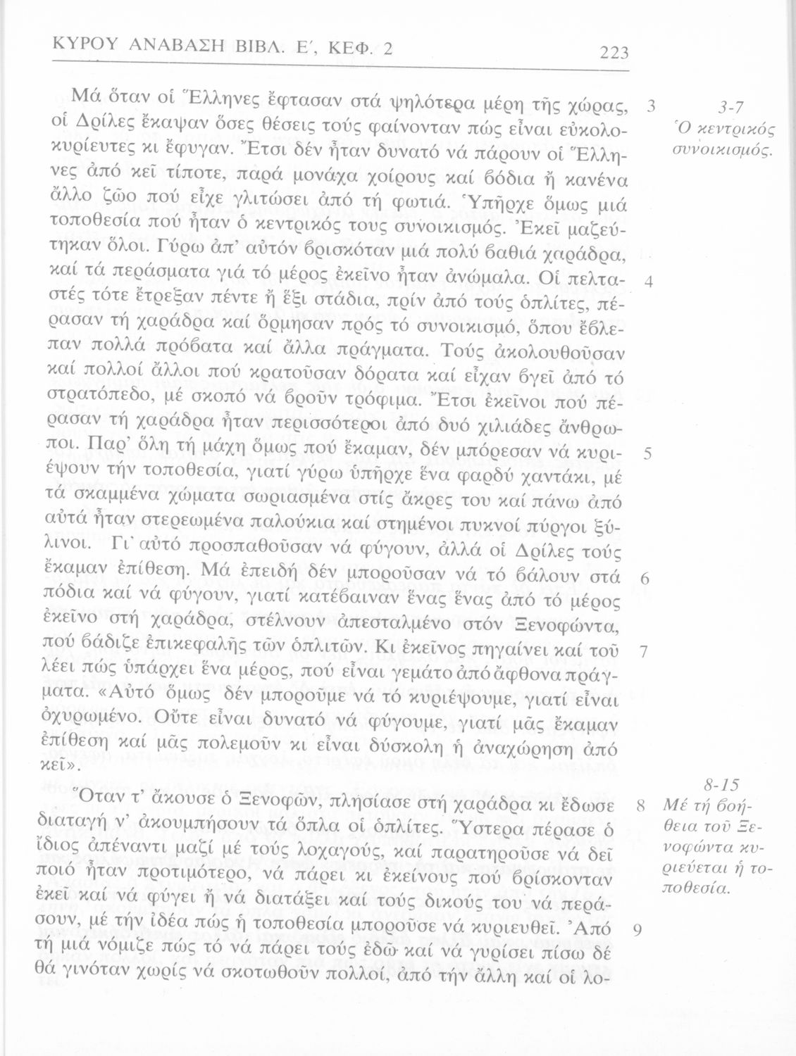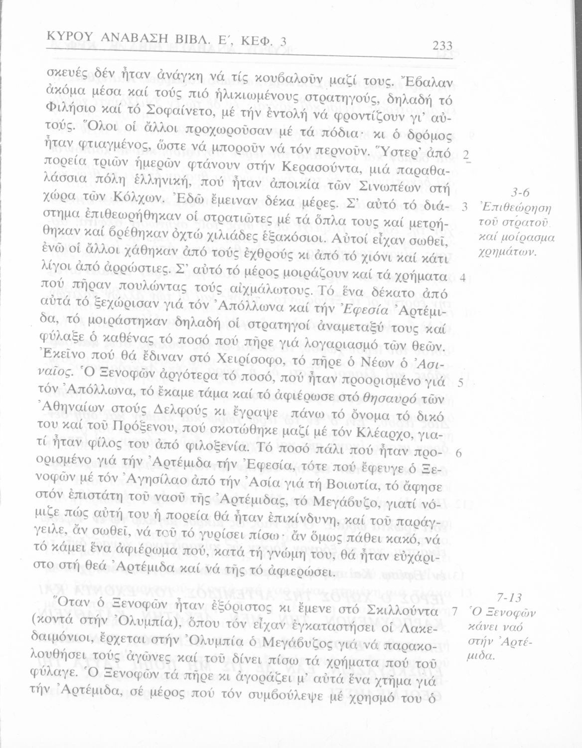 Σχολικό εγχειρίδιο Αρχαίων Ελληνικών. Από τα εφτά μέρη της "Κύρου Ανάβασις" του Ξενοφώντα που περιέχονται στο εγχειρίδιο το Πρώτο και το Έβδομο αναφέρονται περιληπτικά. Στο βιβλίο περιλαμβάνονται εισαγωγικό σημείωμα για τη ζωή και το έργο του Ξενοφώντα, σημειώσεις πάνω στα κείμενα ενώ διανθίζεται από εικόνες, χάρτες και διαγράμματα.
