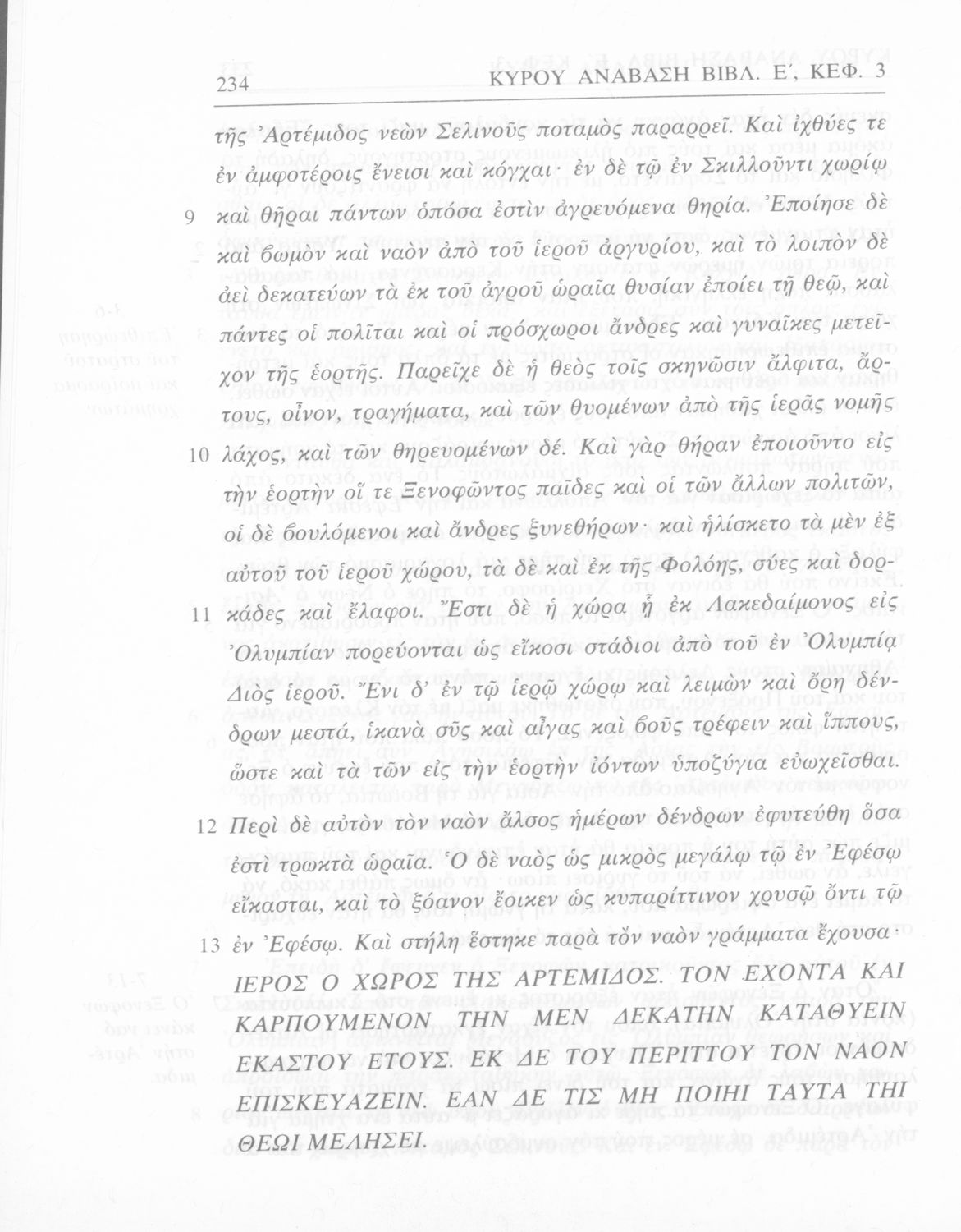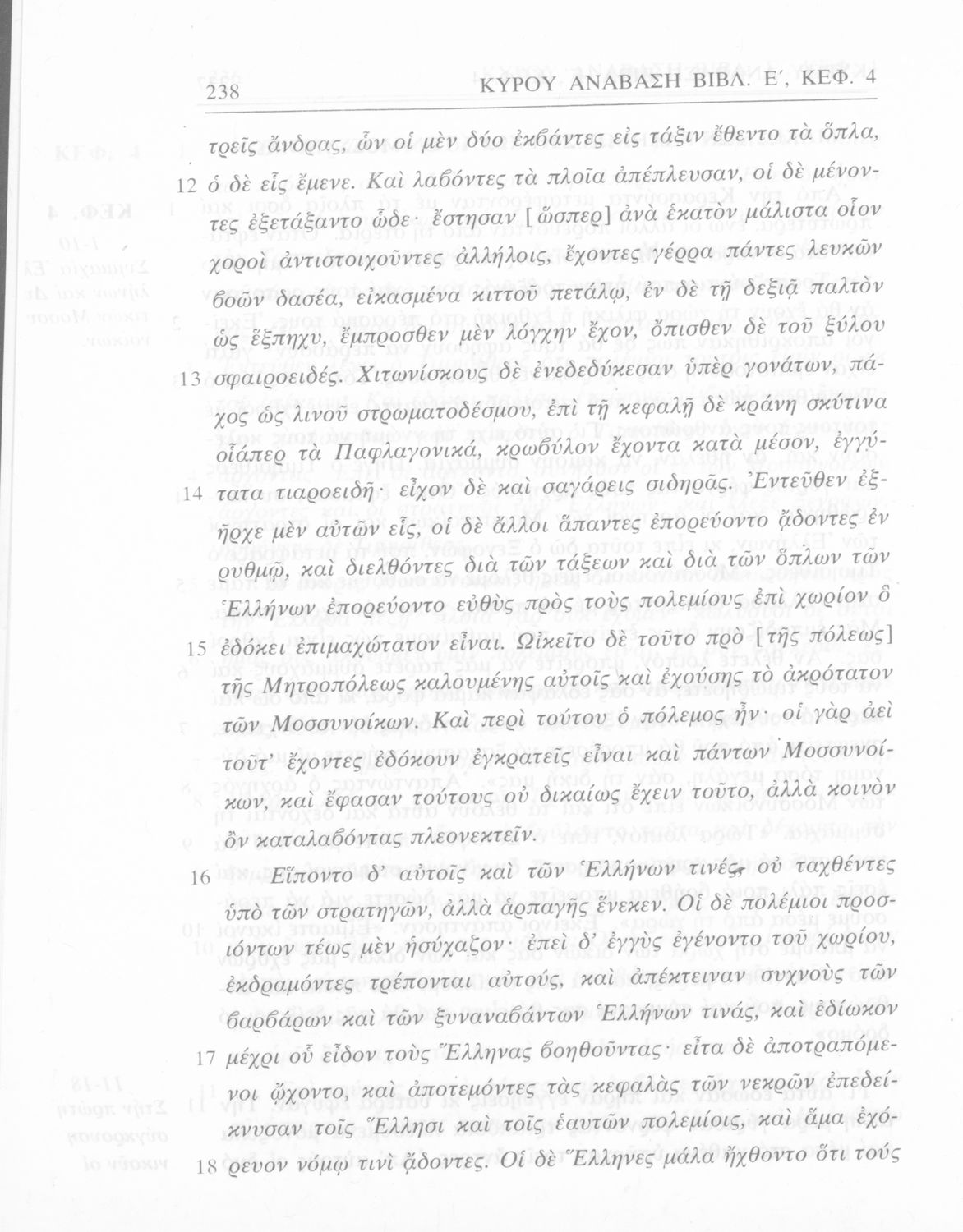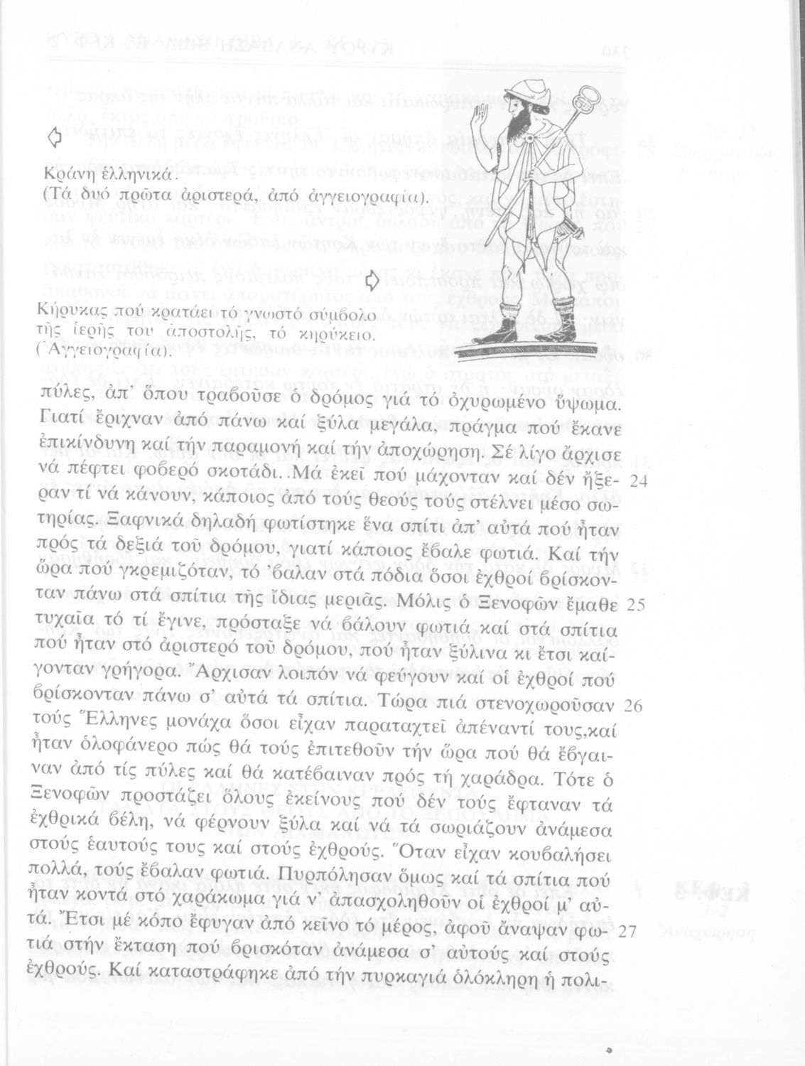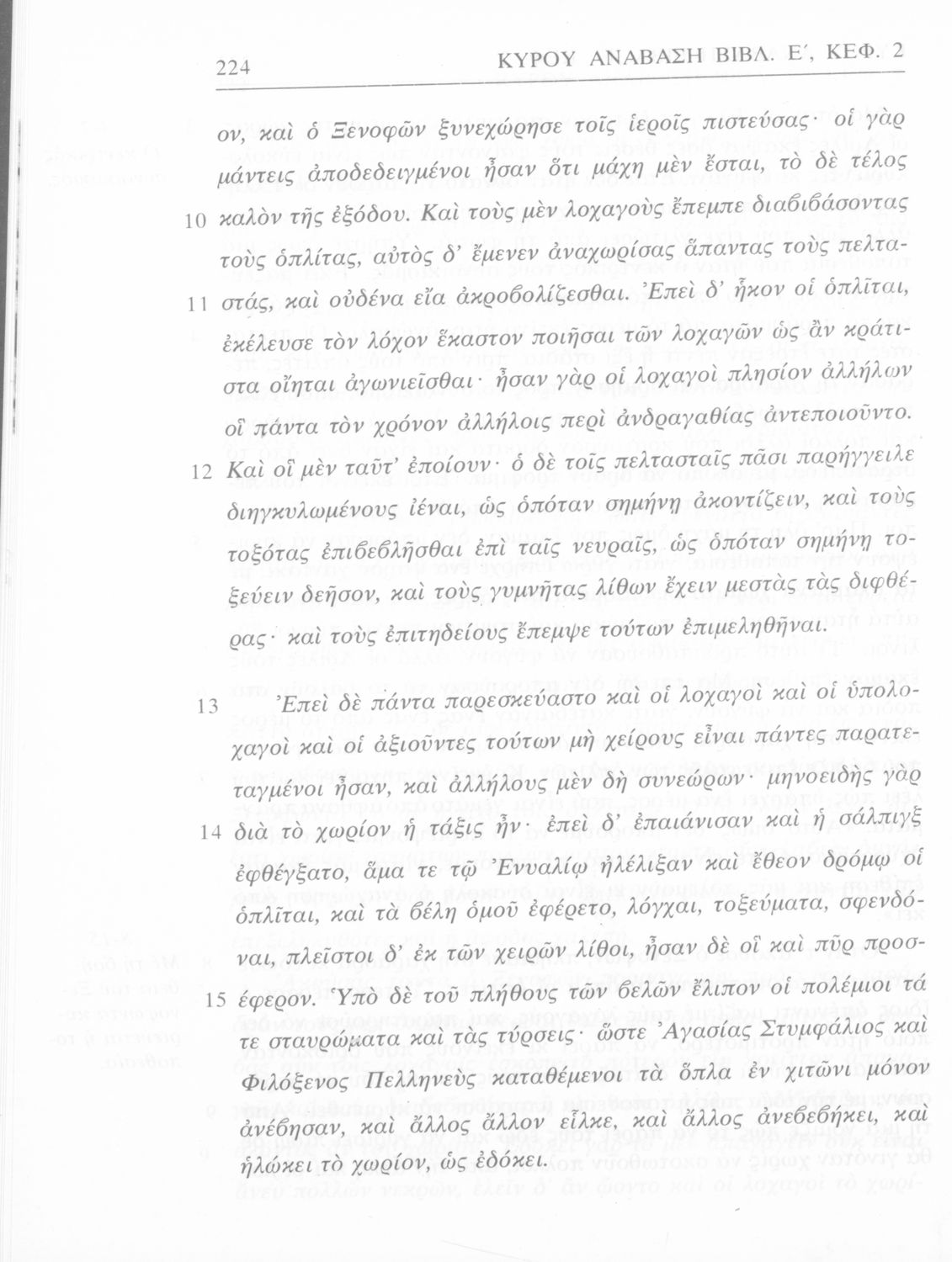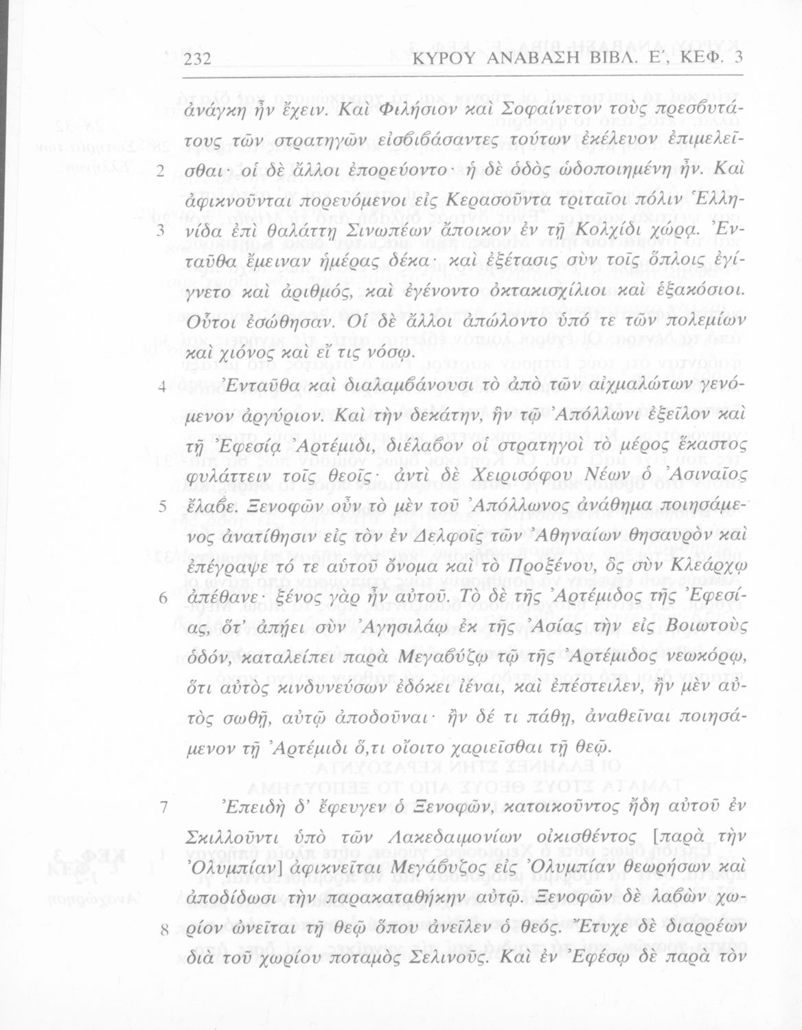 Σχολικό εγχειρίδιο Αρχαίων Ελληνικών. Από τα εφτά μέρη της "Κύρου Ανάβασις" του Ξενοφώντα που περιέχονται στο εγχειρίδιο το Πρώτο και το Έβδομο αναφέρονται περιληπτικά. Στο βιβλίο περιλαμβάνονται εισαγωγικό σημείωμα για τη ζωή και το έργο του Ξενοφώντα, σημειώσεις πάνω στα κείμενα ενώ διανθίζεται από εικόνες, χάρτες και διαγράμματα.