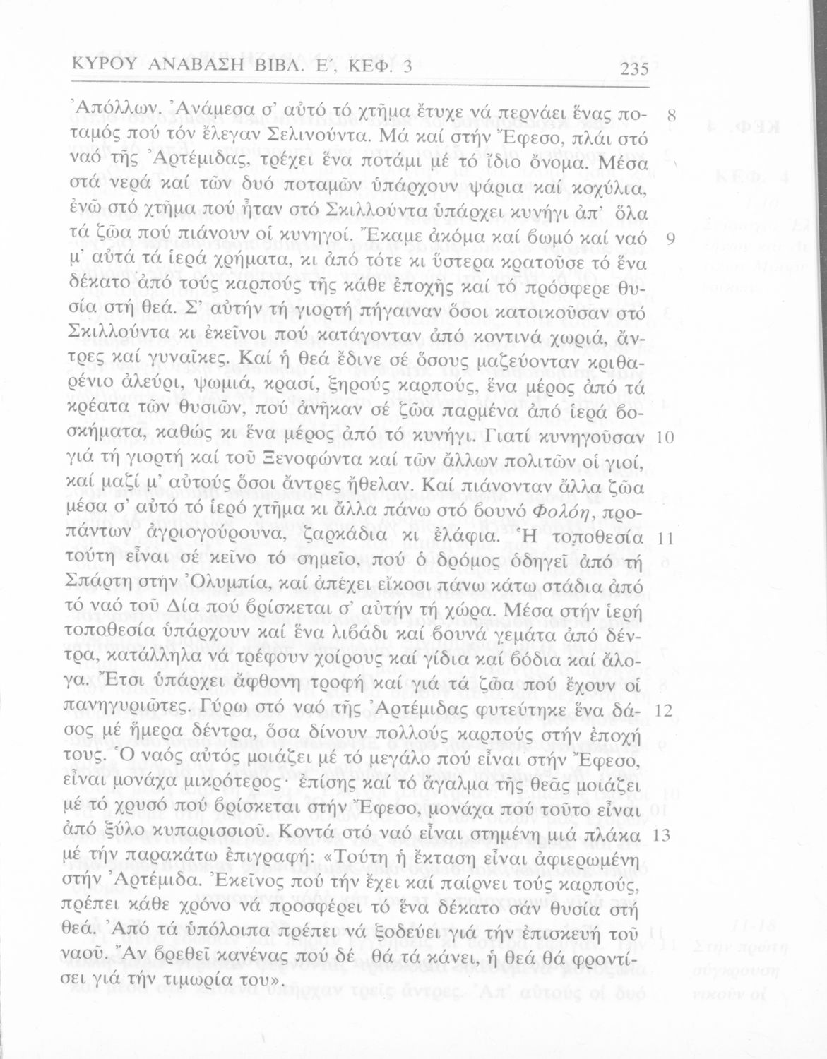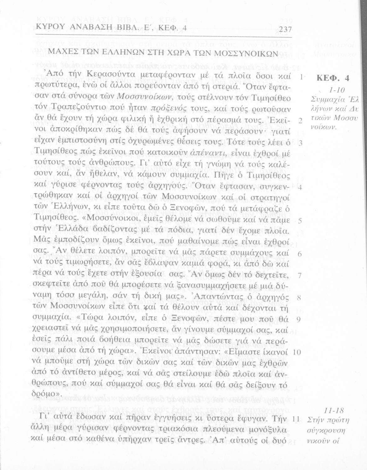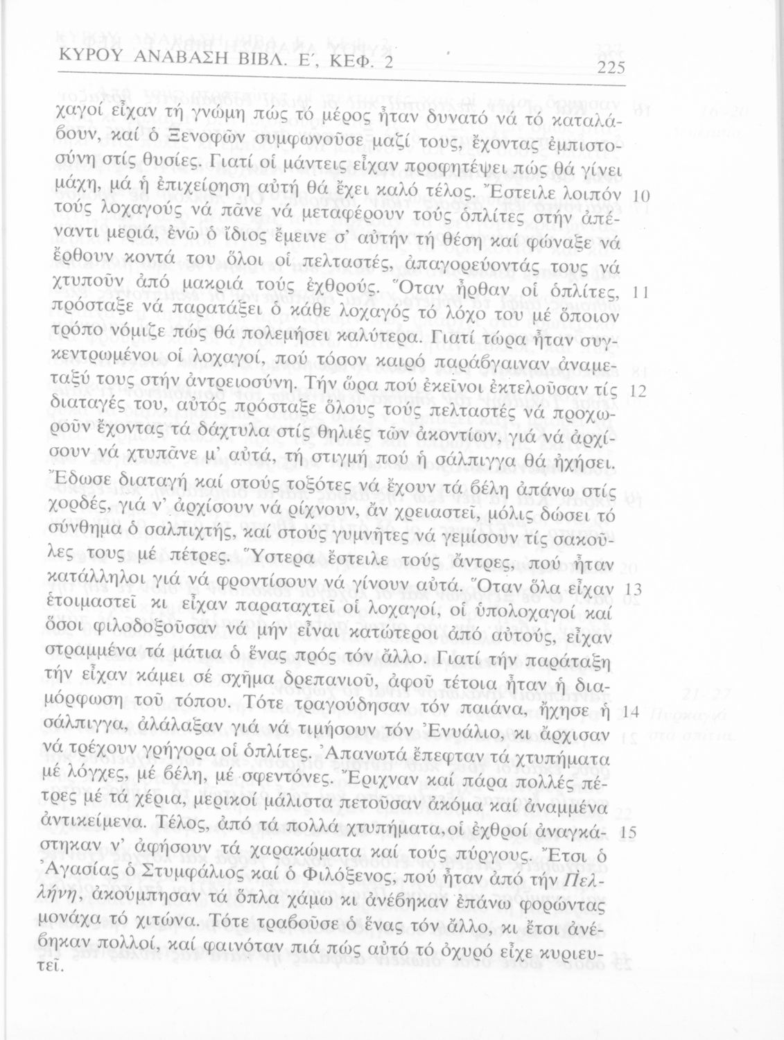 Σχολικό εγχειρίδιο Αρχαίων Ελληνικών α΄ Γυμνασίου που περιλαμβάνει μετάφραση του έργου του Ξενοφώντα Κύρου Ανάβασις, εισαγωγικά σχόλια για τη ζωή και το έργο του, και ερμηνευτικές παρατηρήσεις.