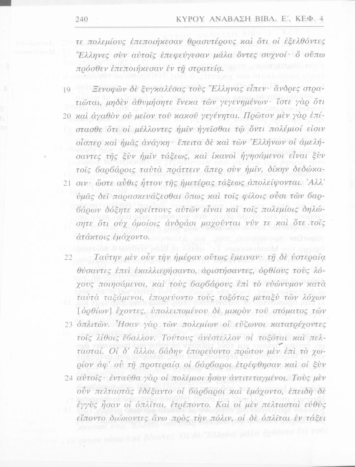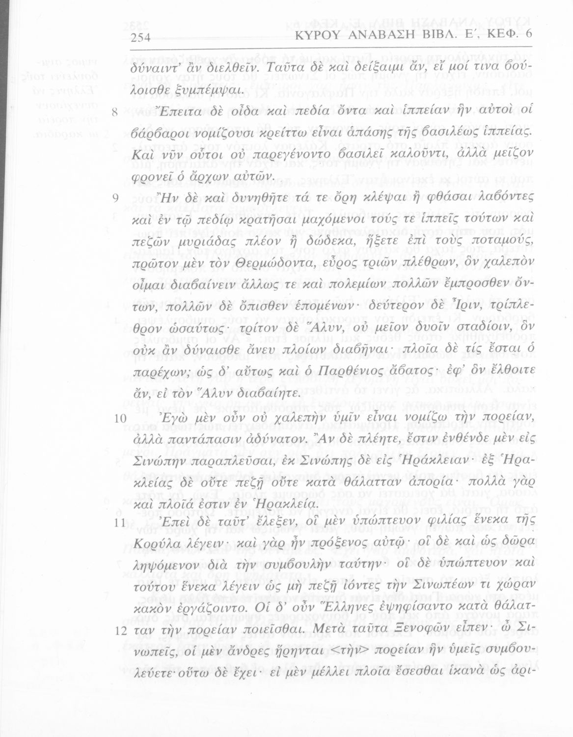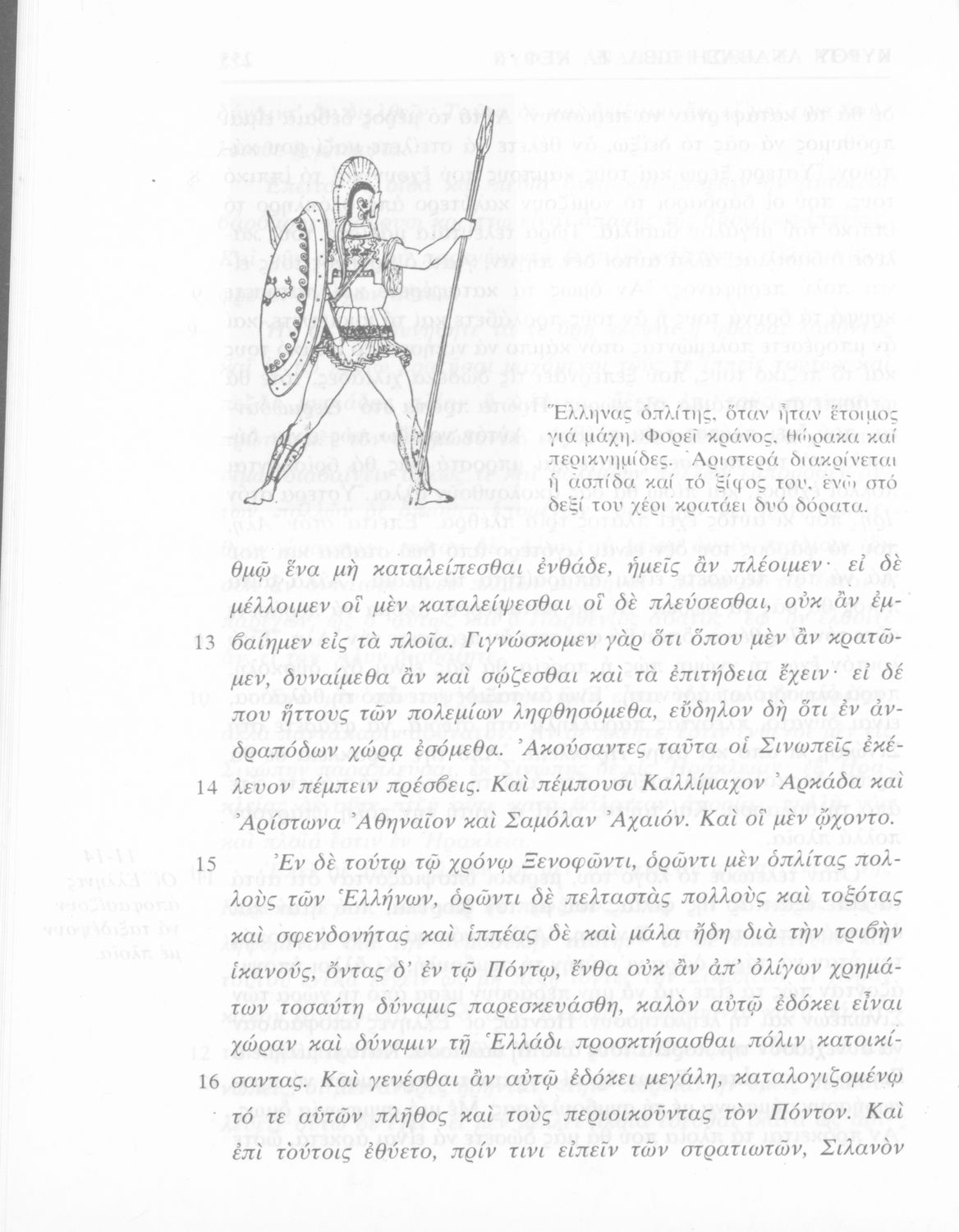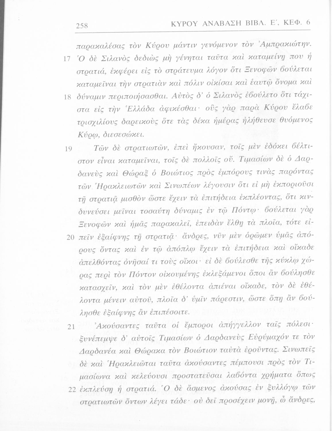 Σχολικό εγχειρίδιο Αρχαίων Ελληνικών. Από τα εφτά μέρη της "Κύρου Ανάβασις" του Ξενοφώντα που περιέχονται στο εγχειρίδιο το Πρώτο και το Έβδομο αναφέρονται περιληπτικά. Στο βιβλίο περιλαμβάνονται εισαγωγικό σημείωμα για τη ζωή και το έργο του Ξενοφώντα, σημειώσεις πάνω στα κείμενα ενώ διανθίζεται από εικόνες, χάρτες και διαγράμματα.
