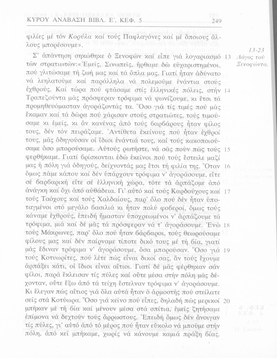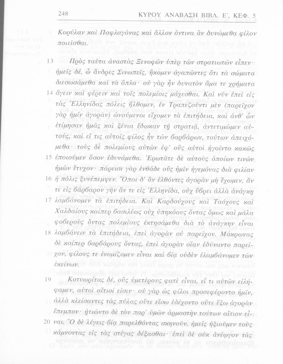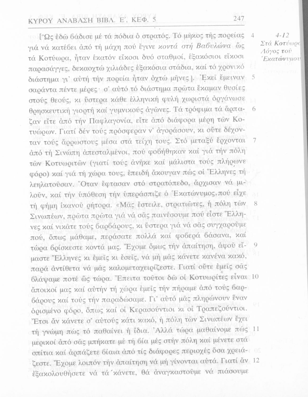 Σχολικό εγχειρίδιο Αρχαίων Ελληνικών. Από τα εφτά μέρη της "Κύρου Ανάβασις" του Ξενοφώντα που περιέχονται στο εγχειρίδιο το Πρώτο και το Έβδομο αναφέρονται περιληπτικά. Στο βιβλίο περιλαμβάνονται εισαγωγικό σημείωμα για τη ζωή και το έργο του Ξενοφώντα, σημειώσεις πάνω στα κείμενα ενώ διανθίζεται από εικόνες, χάρτες και διαγράμματα.