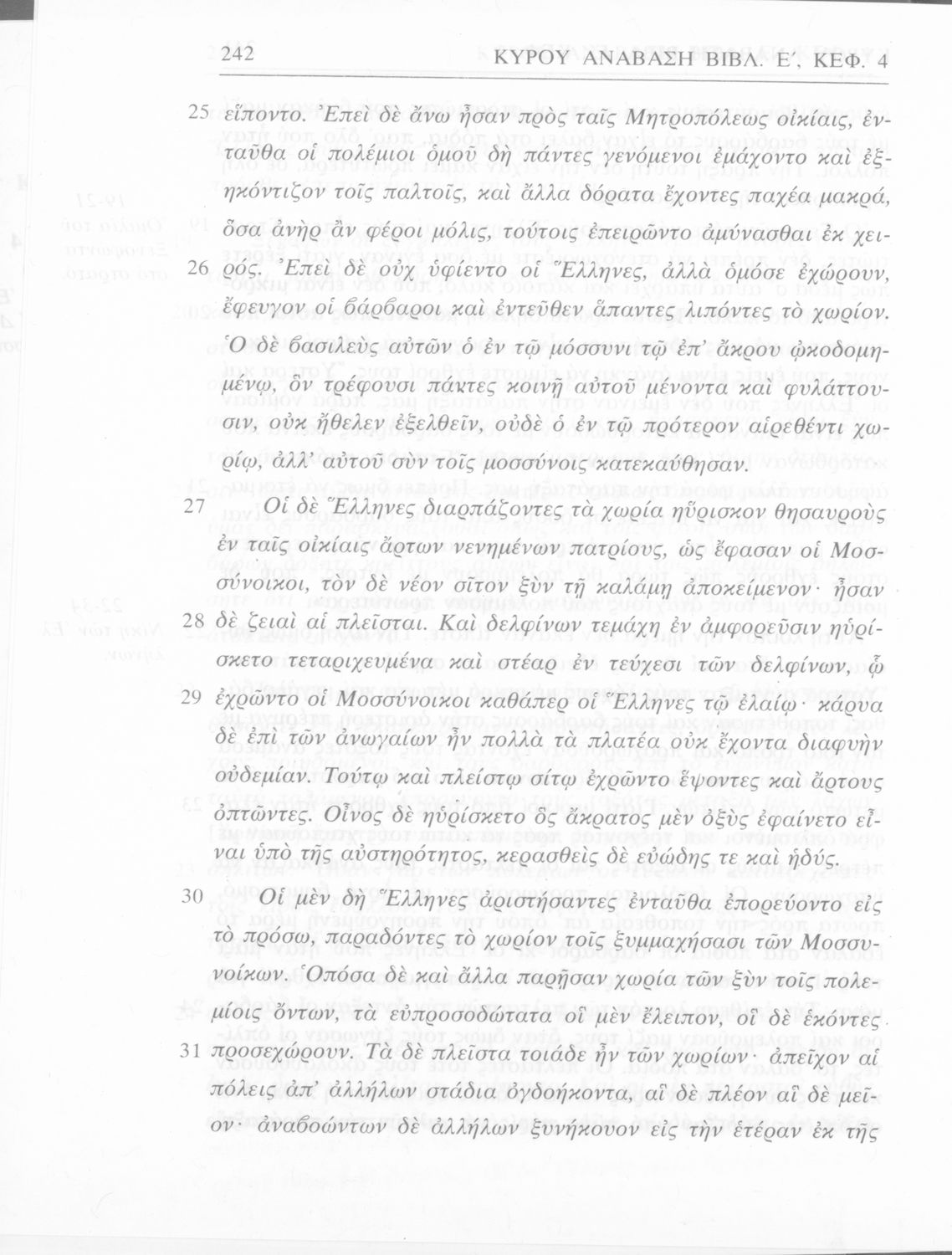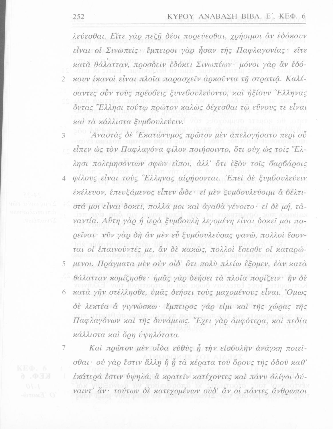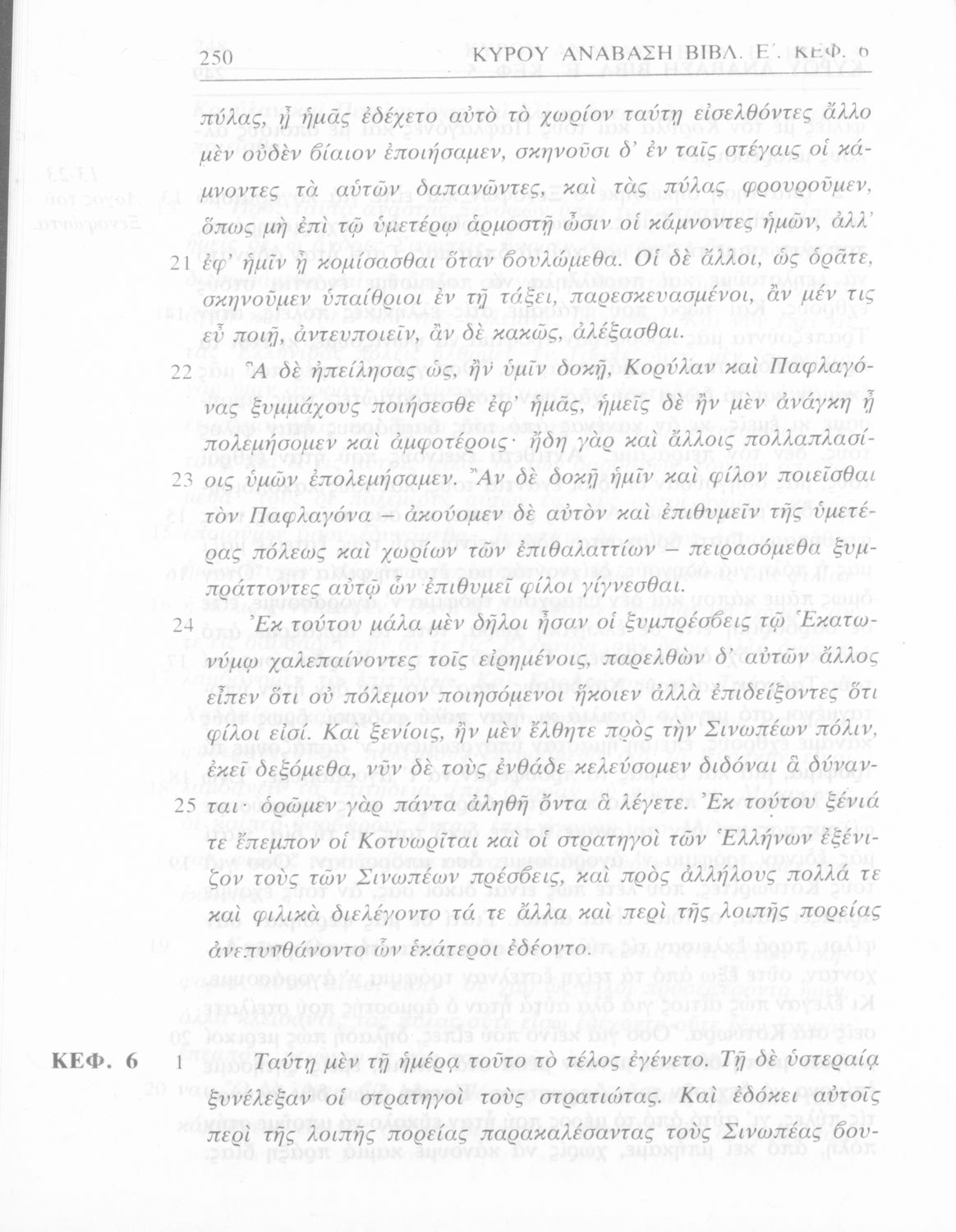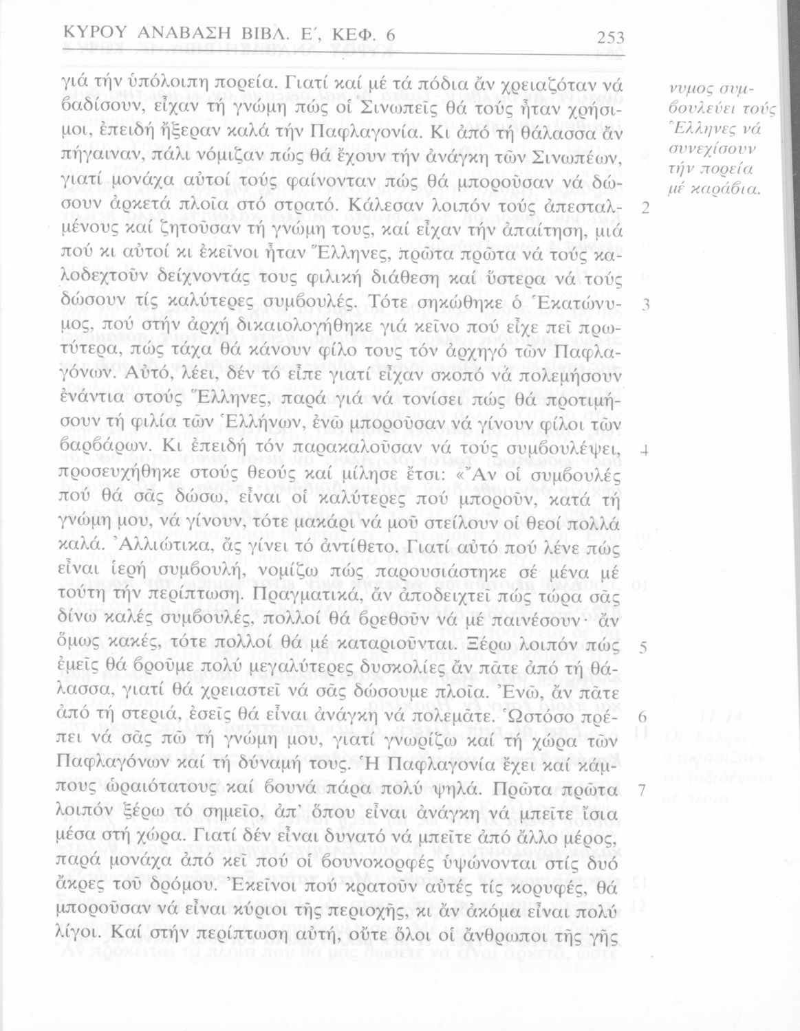 Σχολικό εγχειρίδιο Αρχαίων Ελληνικών. Από τα εφτά μέρη της "Κύρου Ανάβασις" του Ξενοφώντα που περιέχονται στο εγχειρίδιο το Πρώτο και το Έβδομο αναφέρονται περιληπτικά. Στο βιβλίο περιλαμβάνονται εισαγωγικό σημείωμα για τη ζωή και το έργο του Ξενοφώντα, σημειώσεις πάνω στα κείμενα ενώ διανθίζεται από εικόνες, χάρτες και διαγράμματα.