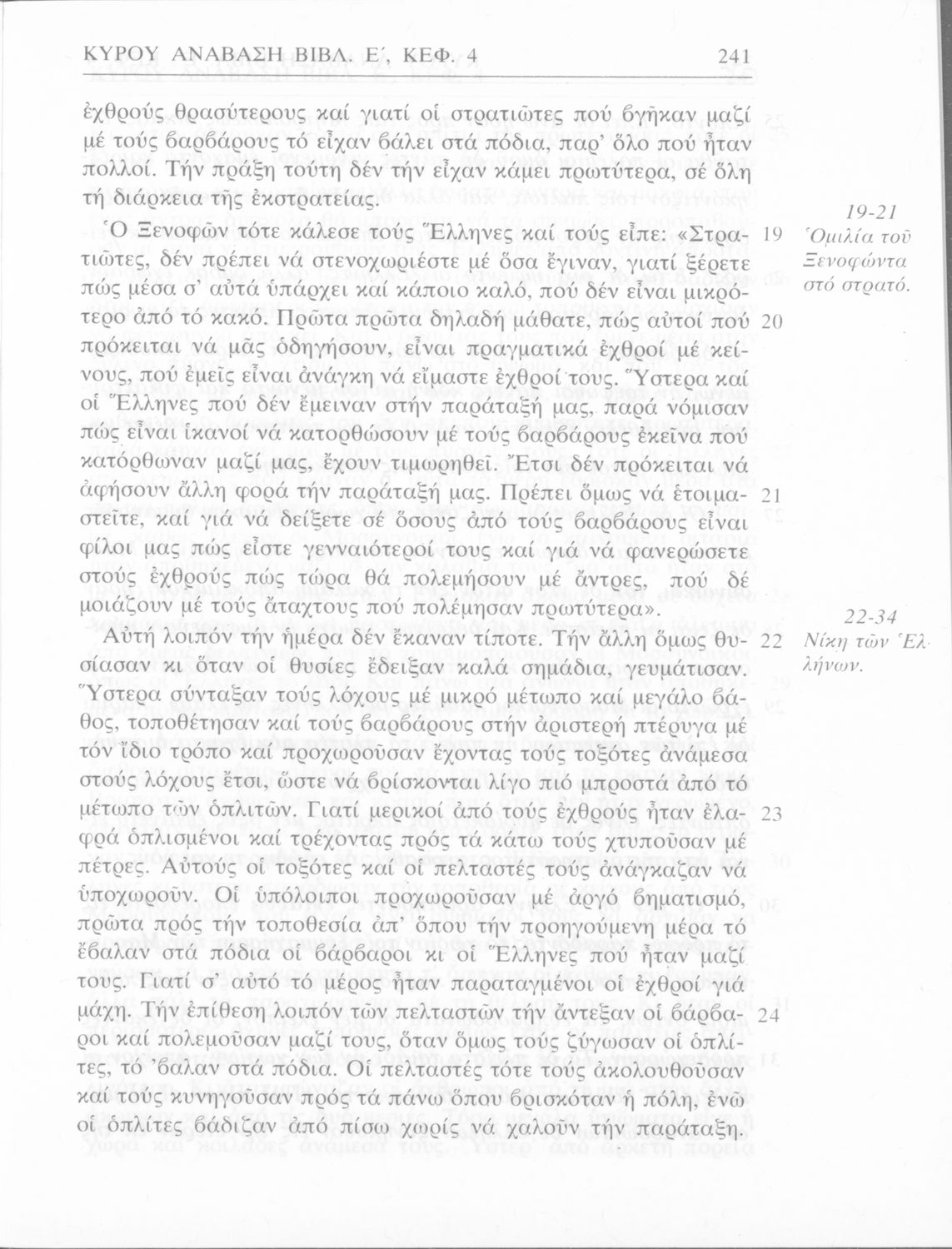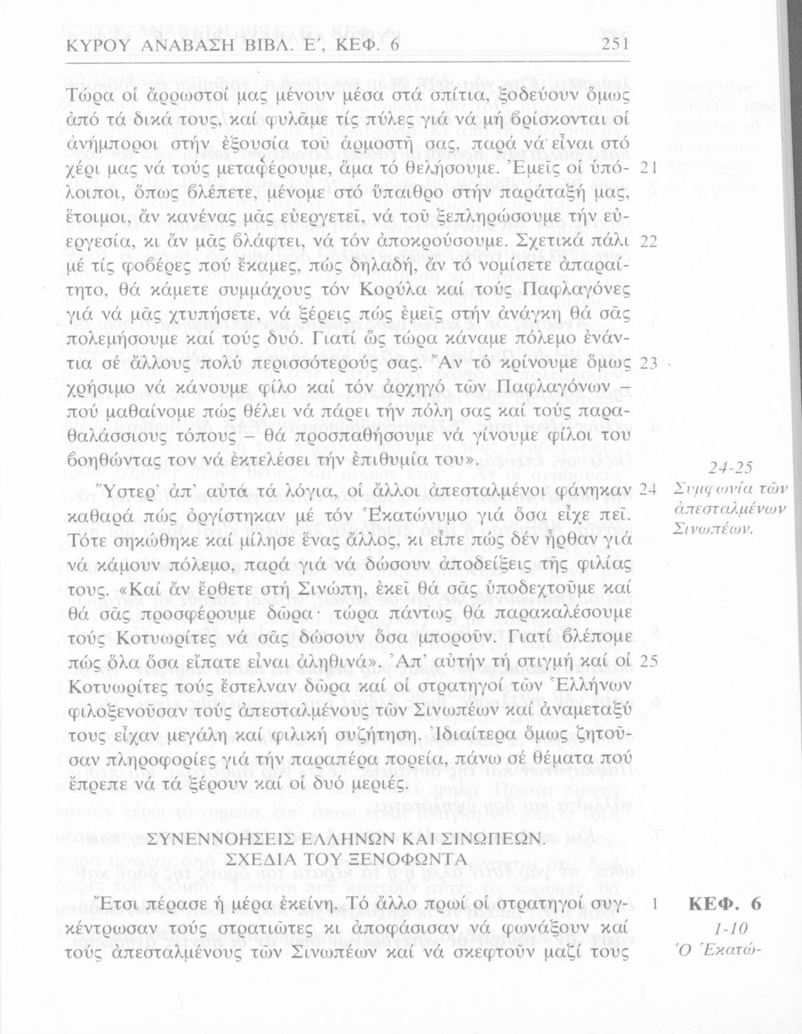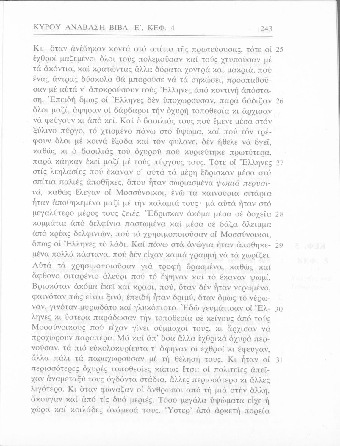 Σχολικό εγχειρίδιο Αρχαίων Ελληνικών α΄ Γυμνασίου που περιλαμβάνει μετάφραση του έργου του Ξενοφώντα Κύρου Ανάβασις, εισαγωγικά σχόλια για τη ζωή και το έργο του, και ερμηνευτικές παρατηρήσεις.