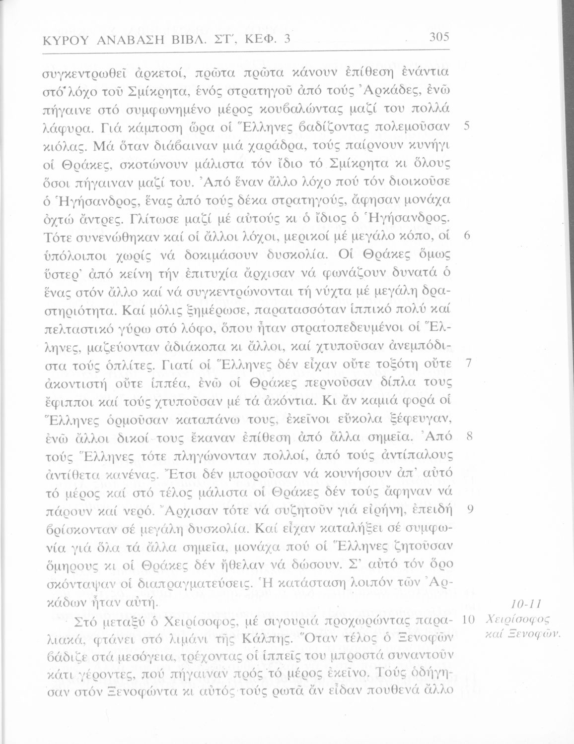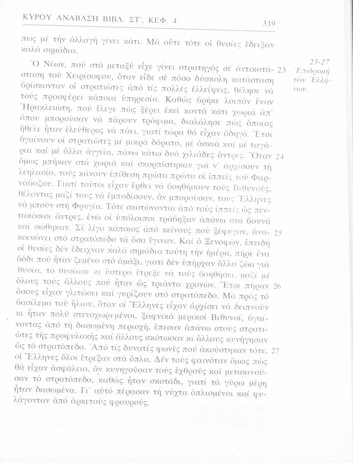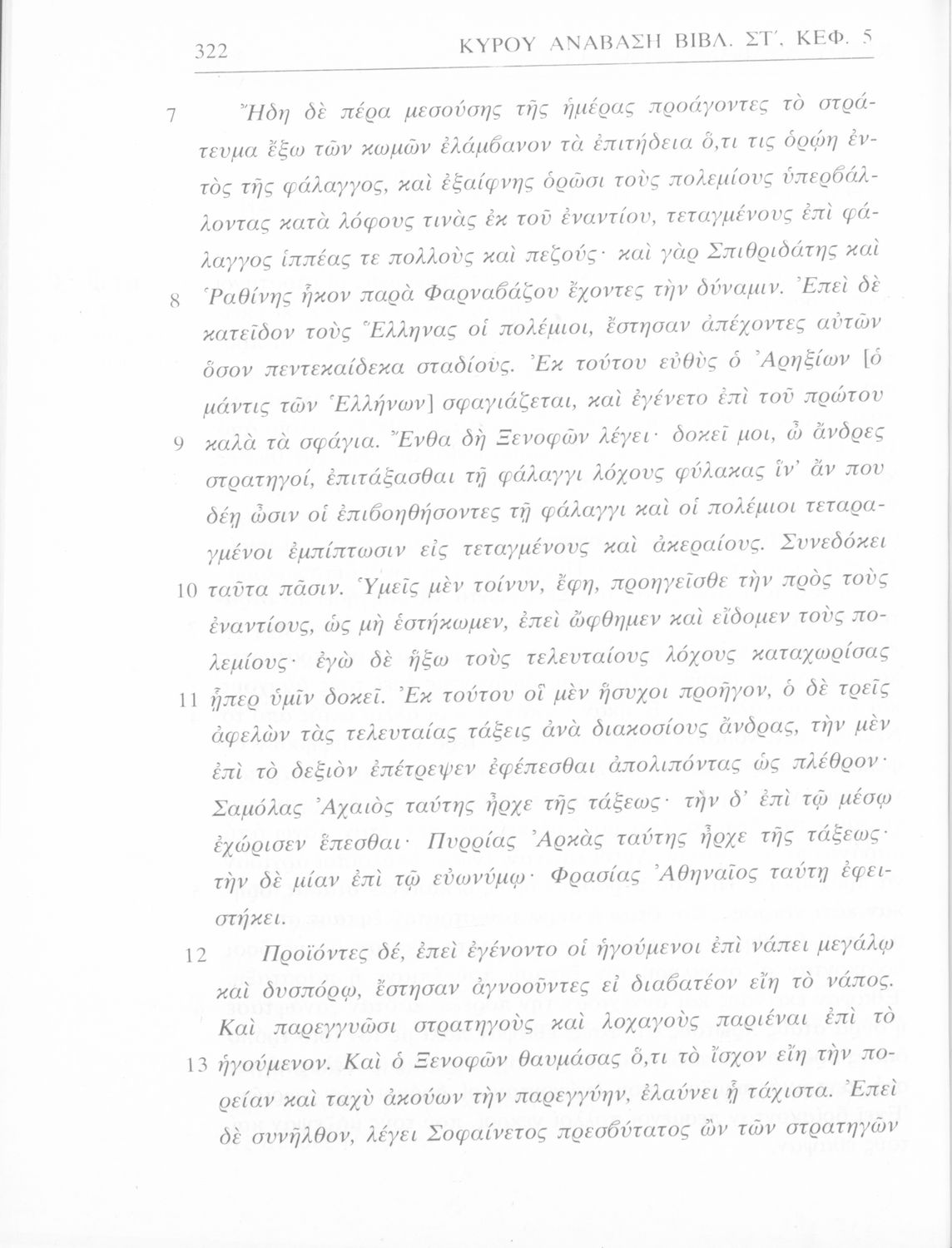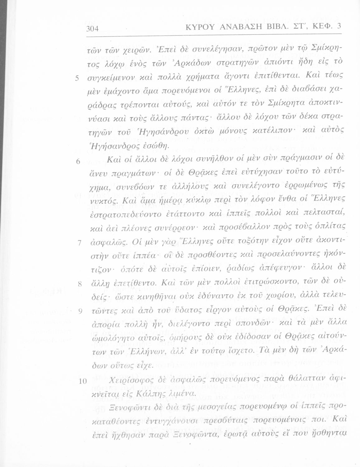 Σχολικό εγχειρίδιο Αρχαίων Ελληνικών. Από τα εφτά μέρη της "Κύρου Ανάβασις" του Ξενοφώντα που περιέχονται στο εγχειρίδιο το Πρώτο και το Έβδομο αναφέρονται περιληπτικά. Στο βιβλίο περιλαμβάνονται εισαγωγικό σημείωμα για τη ζωή και το έργο του Ξενοφώντα, σημειώσεις πάνω στα κείμενα ενώ διανθίζεται από εικόνες, χάρτες και διαγράμματα.