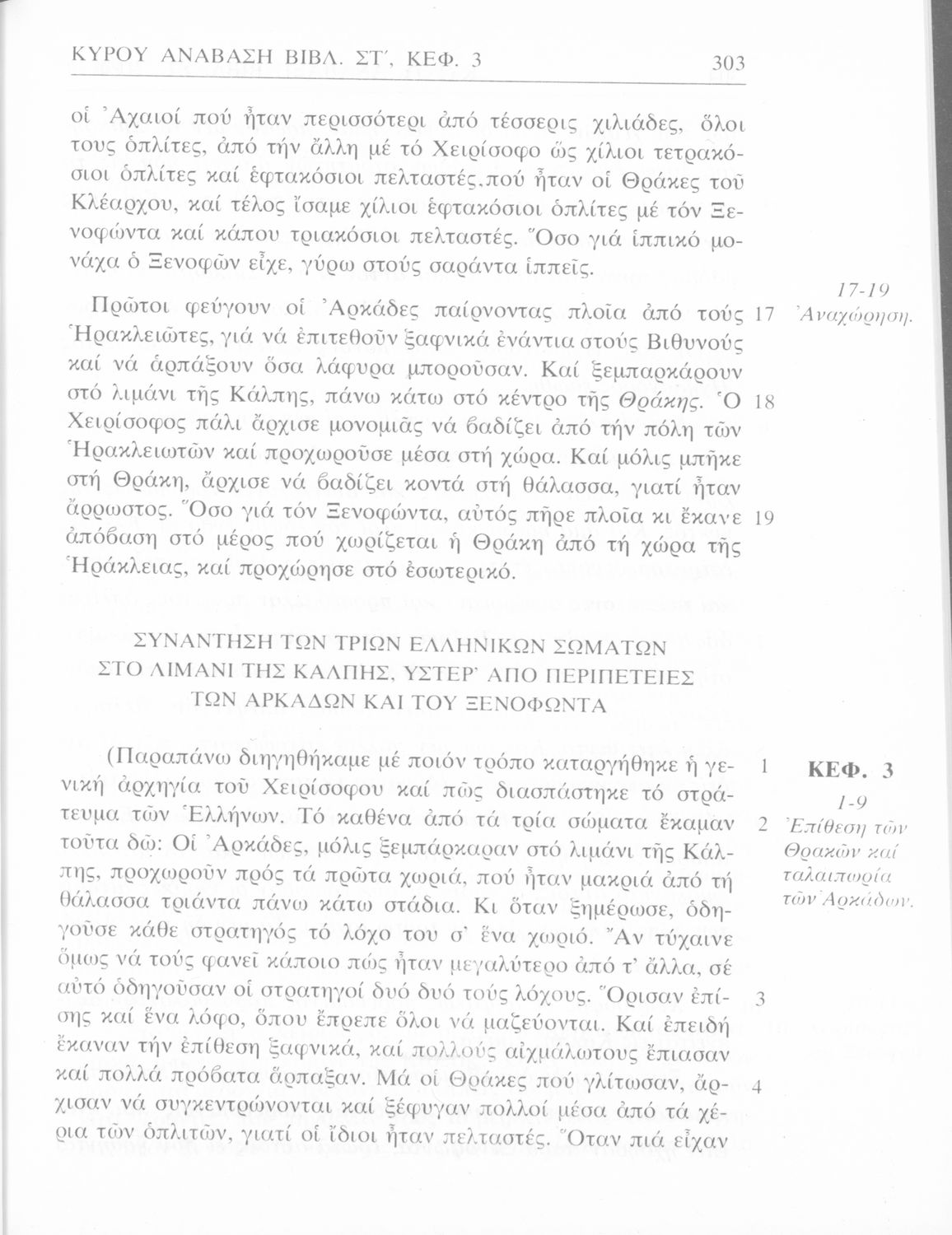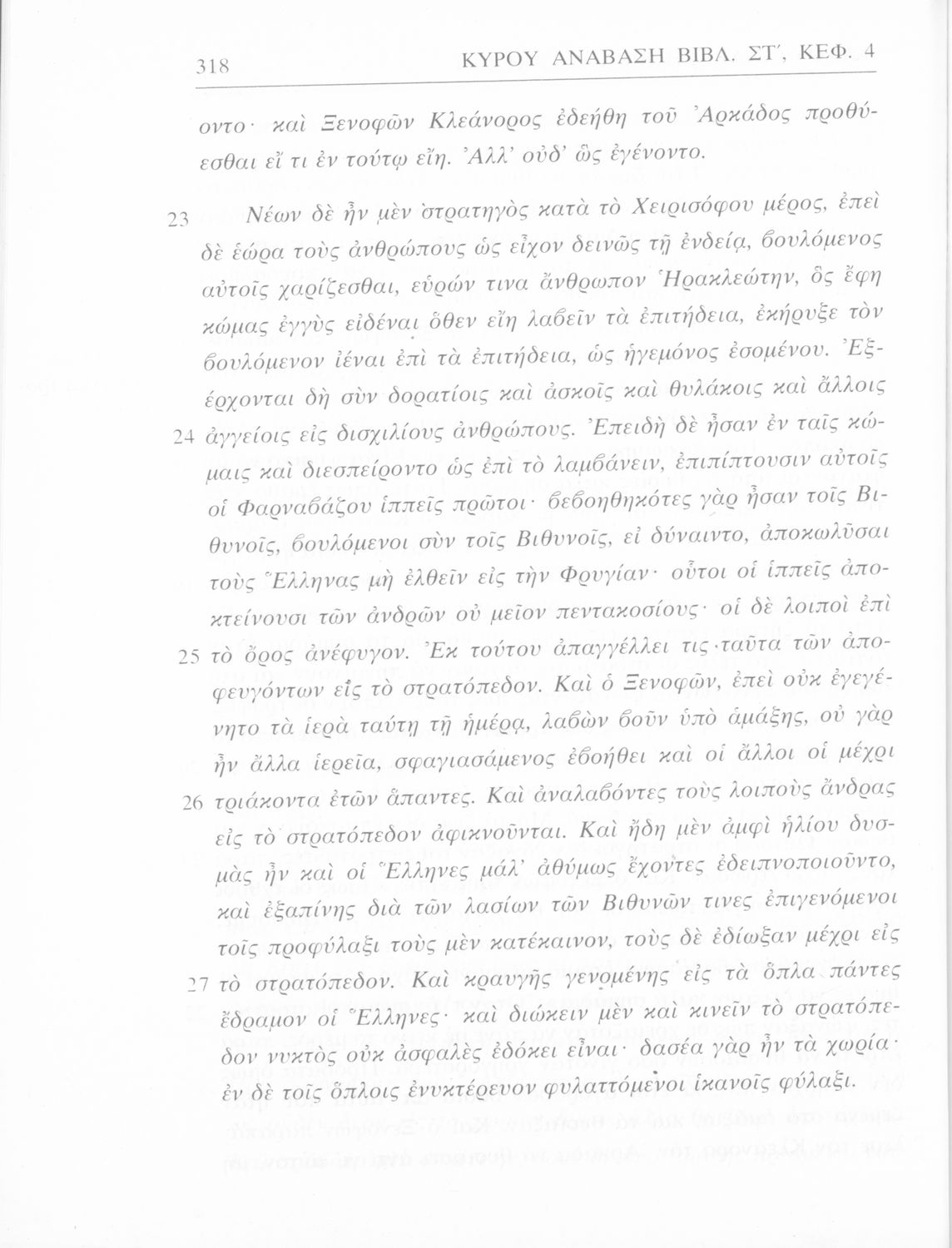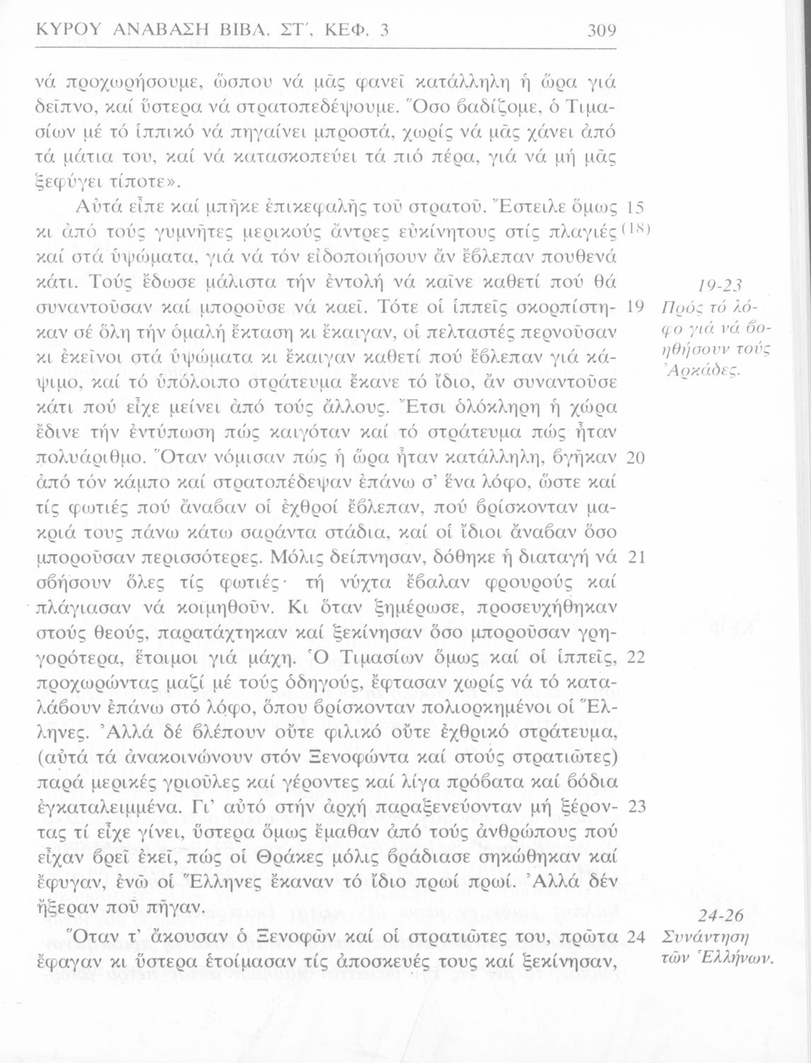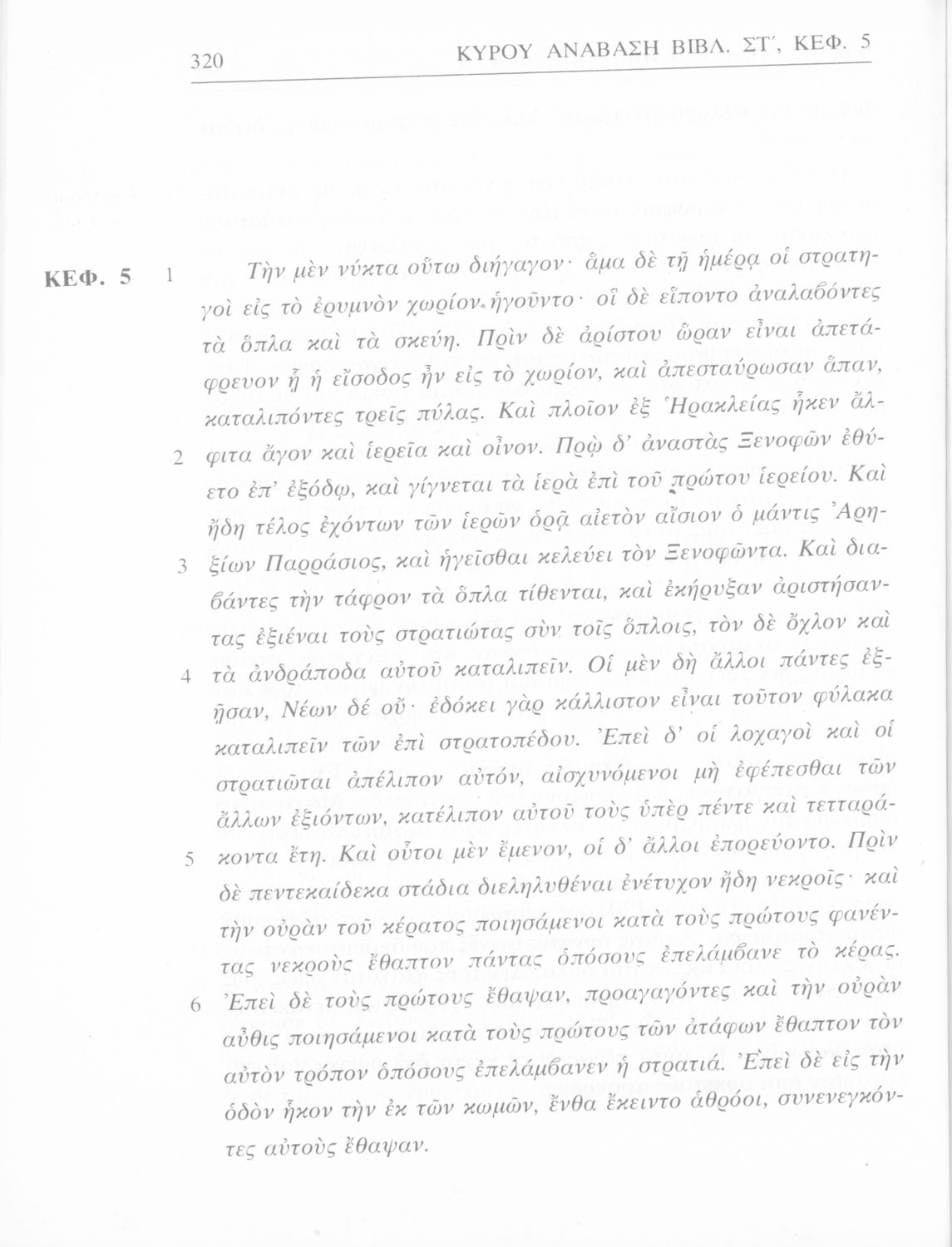 Σχολικό εγχειρίδιο Αρχαίων Ελληνικών. Από τα εφτά μέρη της "Κύρου Ανάβασις" του Ξενοφώντα που περιέχονται στο εγχειρίδιο το Πρώτο και το Έβδομο αναφέρονται περιληπτικά. Στο βιβλίο περιλαμβάνονται εισαγωγικό σημείωμα για τη ζωή και το έργο του Ξενοφώντα, σημειώσεις πάνω στα κείμενα ενώ διανθίζεται από εικόνες, χάρτες και διαγράμματα.