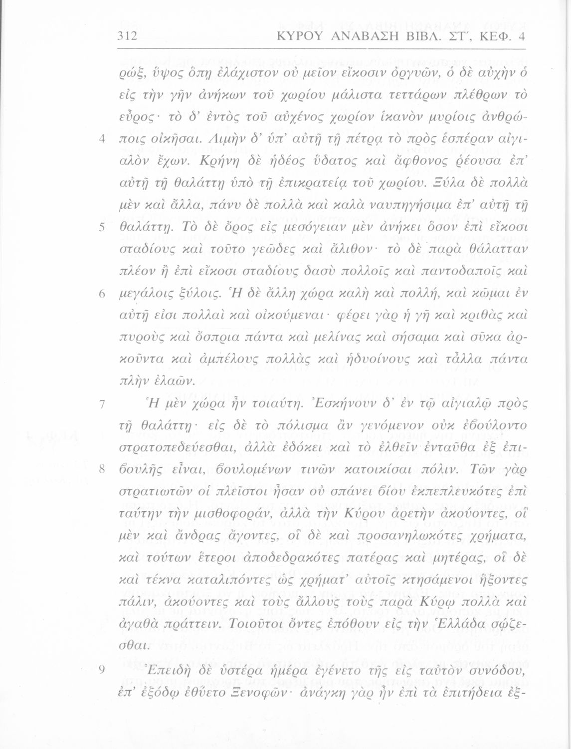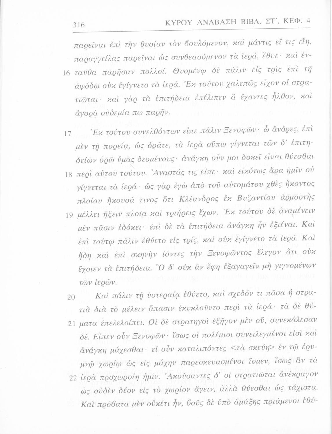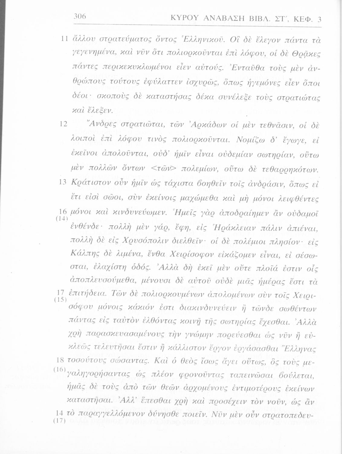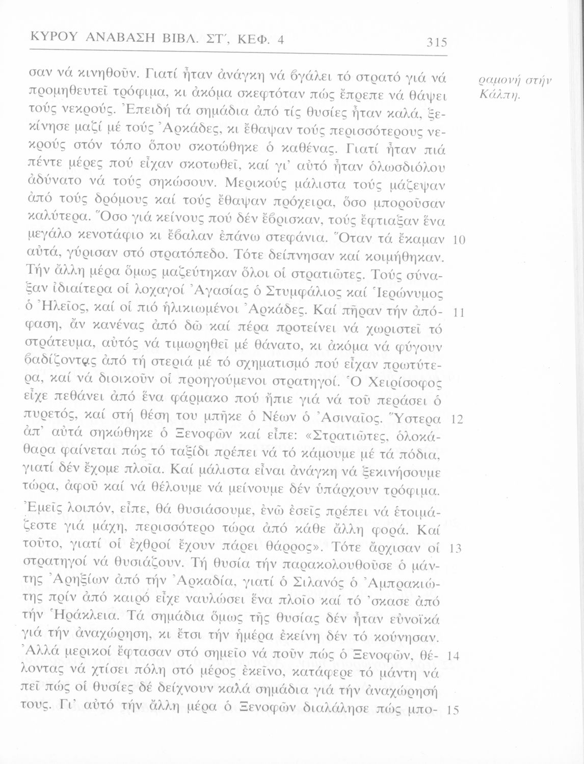 Σχολικό εγχειρίδιο Αρχαίων Ελληνικών. Από τα εφτά μέρη της "Κύρου Ανάβασις" του Ξενοφώντα που περιέχονται στο εγχειρίδιο το Πρώτο και το Έβδομο αναφέρονται περιληπτικά. Στο βιβλίο περιλαμβάνονται εισαγωγικό σημείωμα για τη ζωή και το έργο του Ξενοφώντα, σημειώσεις πάνω στα κείμενα ενώ διανθίζεται από εικόνες, χάρτες και διαγράμματα.