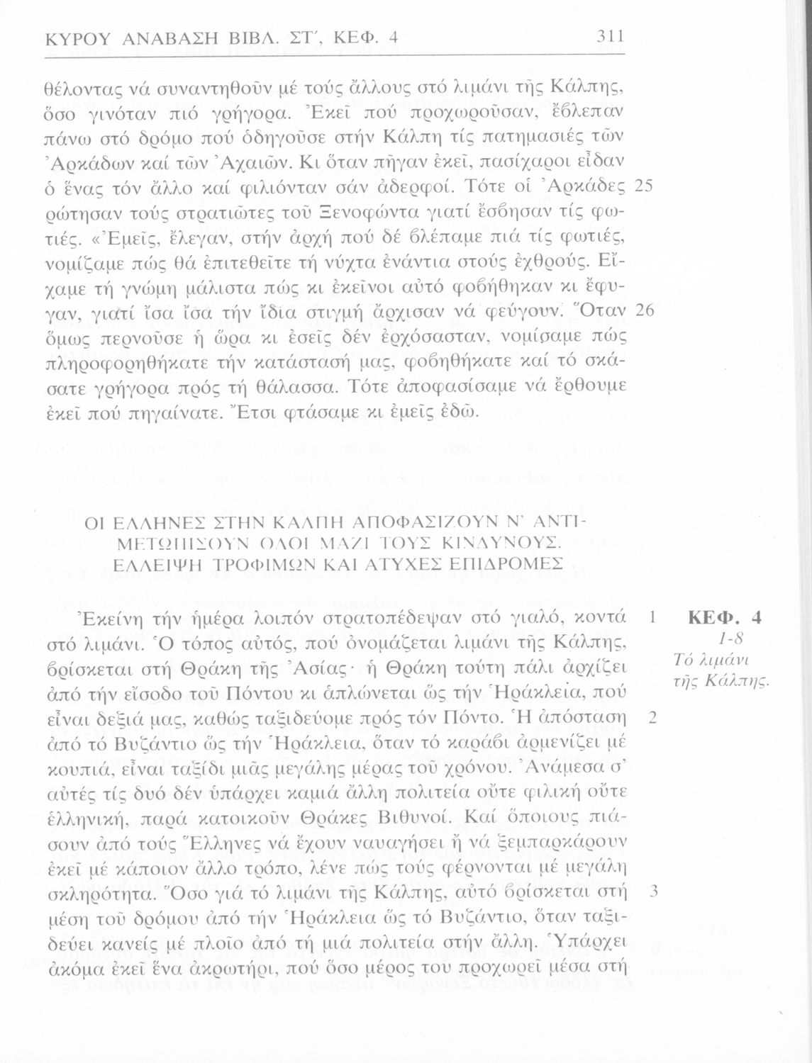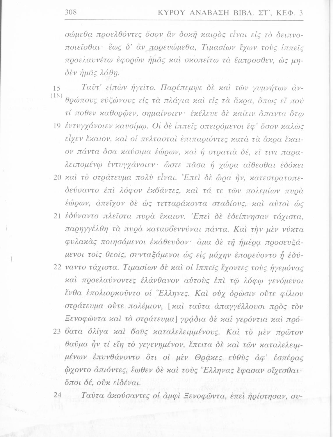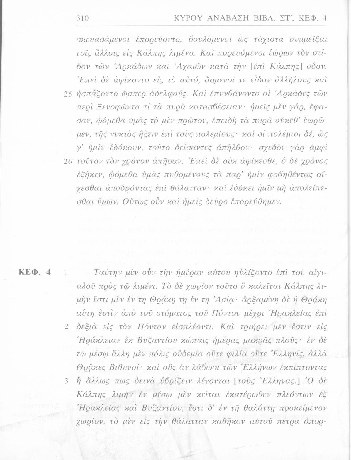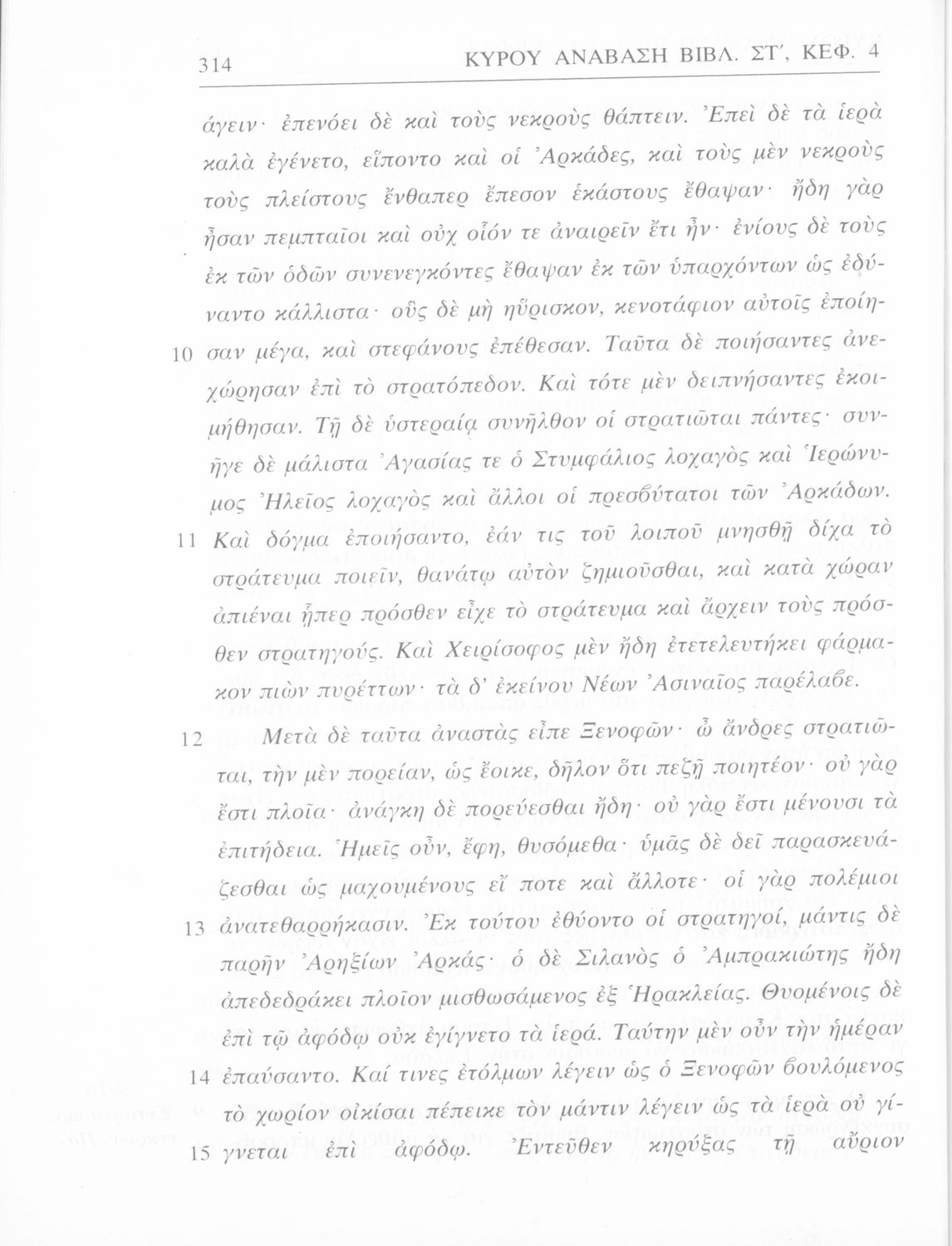 Σχολικό εγχειρίδιο Αρχαίων Ελληνικών. Από τα εφτά μέρη της "Κύρου Ανάβασις" του Ξενοφώντα που περιέχονται στο εγχειρίδιο το Πρώτο και το Έβδομο αναφέρονται περιληπτικά. Στο βιβλίο περιλαμβάνονται εισαγωγικό σημείωμα για τη ζωή και το έργο του Ξενοφώντα, σημειώσεις πάνω στα κείμενα ενώ διανθίζεται από εικόνες, χάρτες και διαγράμματα.