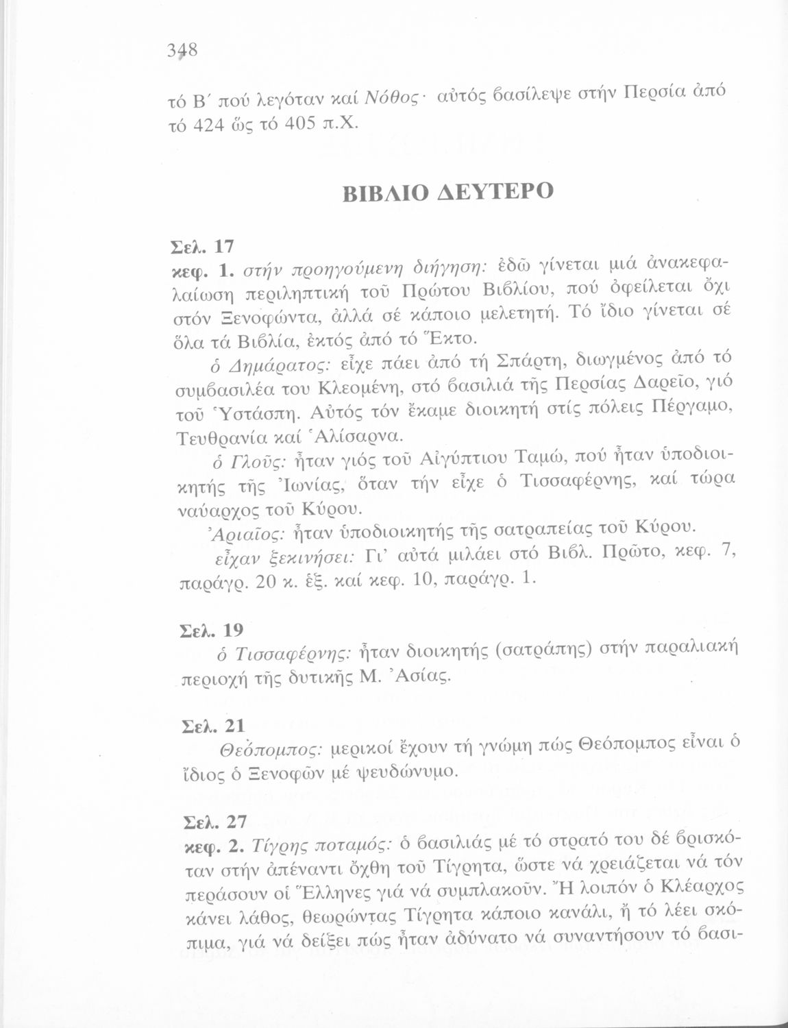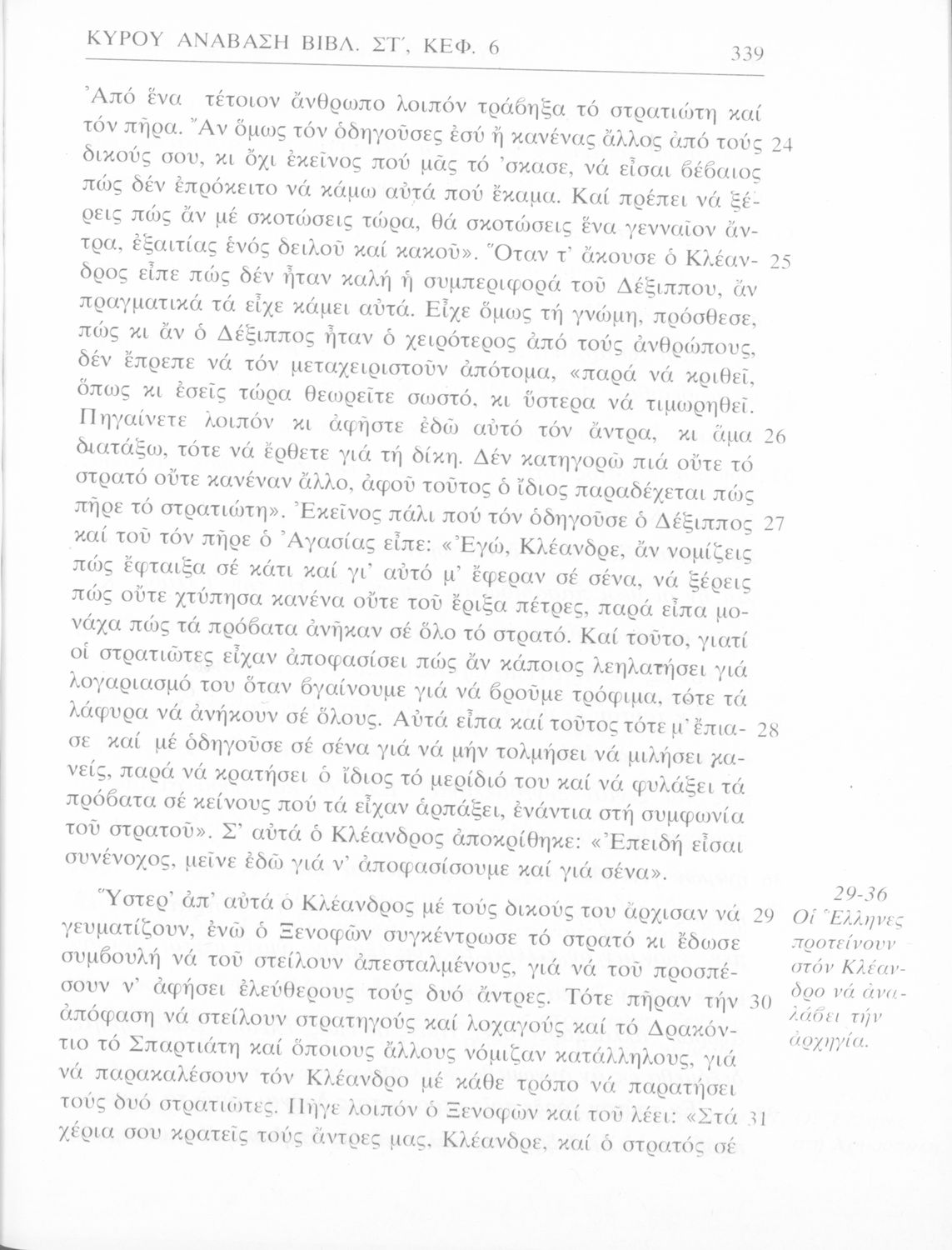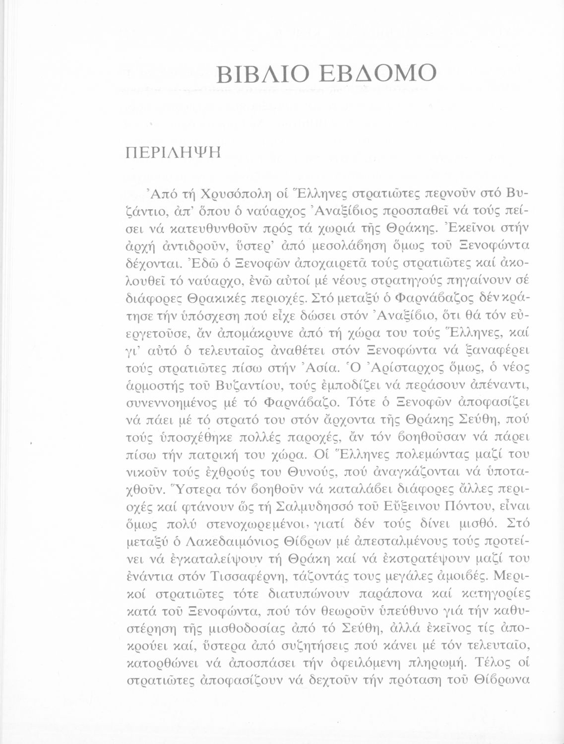 Σχολικό εγχειρίδιο Αρχαίων Ελληνικών. Από τα εφτά μέρη της "Κύρου Ανάβασις" του Ξενοφώντα που περιέχονται στο εγχειρίδιο το Πρώτο και το Έβδομο αναφέρονται περιληπτικά. Στο βιβλίο περιλαμβάνονται εισαγωγικό σημείωμα για τη ζωή και το έργο του Ξενοφώντα, σημειώσεις πάνω στα κείμενα ενώ διανθίζεται από εικόνες, χάρτες και διαγράμματα.