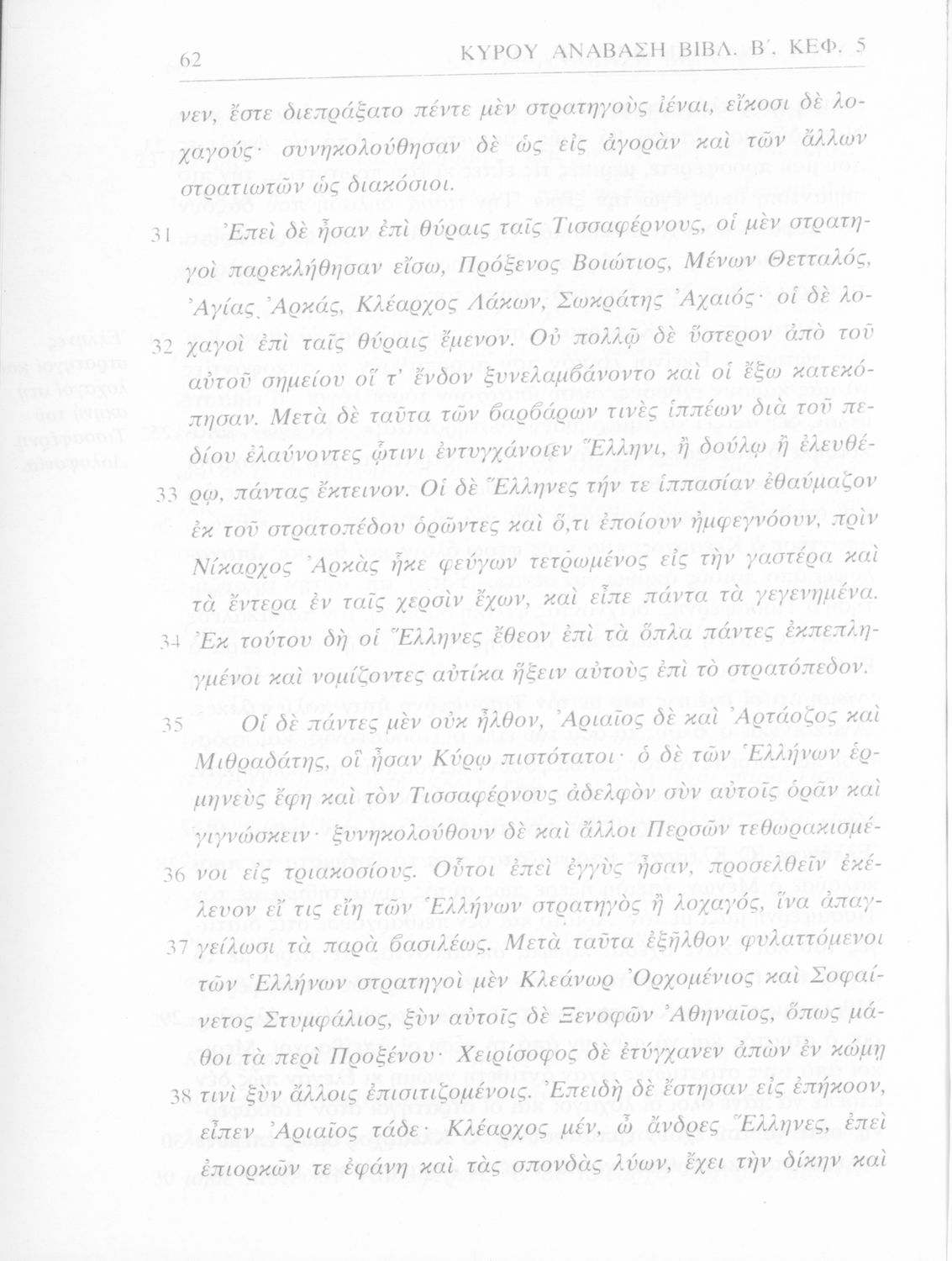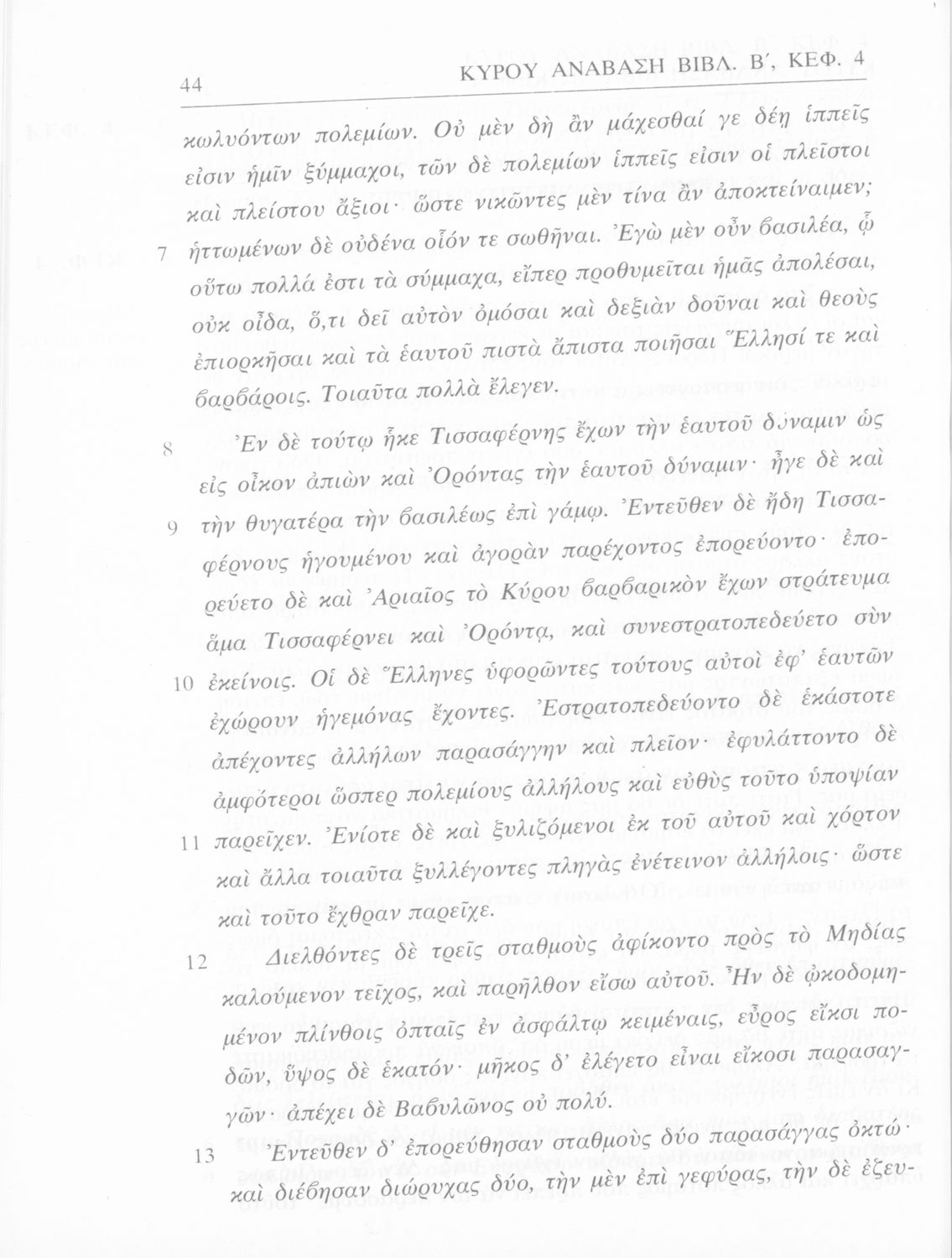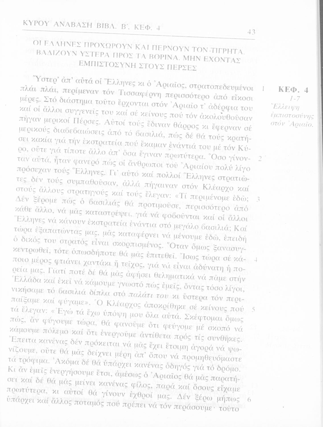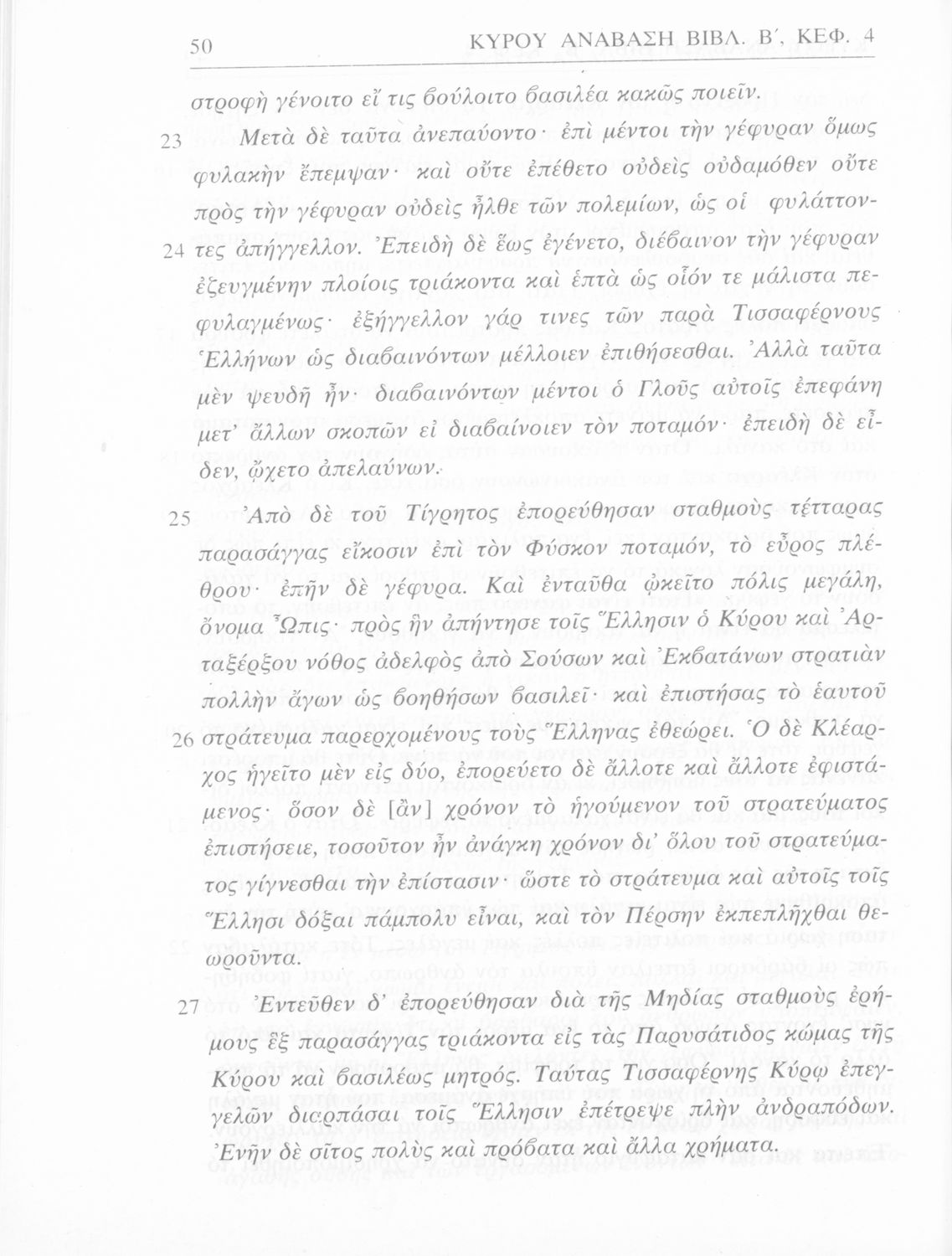 Σχολικό εγχειρίδιο Αρχαίων Ελληνικών. Από τα εφτά μέρη της "Κύρου Ανάβασις" του Ξενοφώντα που περιέχονται στο εγχειρίδιο το Πρώτο και το Έβδομο αναφέρονται περιληπτικά. Στο βιβλίο περιλαμβάνονται εισαγωγικό σημείωμα για τη ζωή και το έργο του Ξενοφώντα, σημειώσεις πάνω στα κείμενα ενώ διανθίζεται από εικόνες, χάρτες και διαγράμματα.