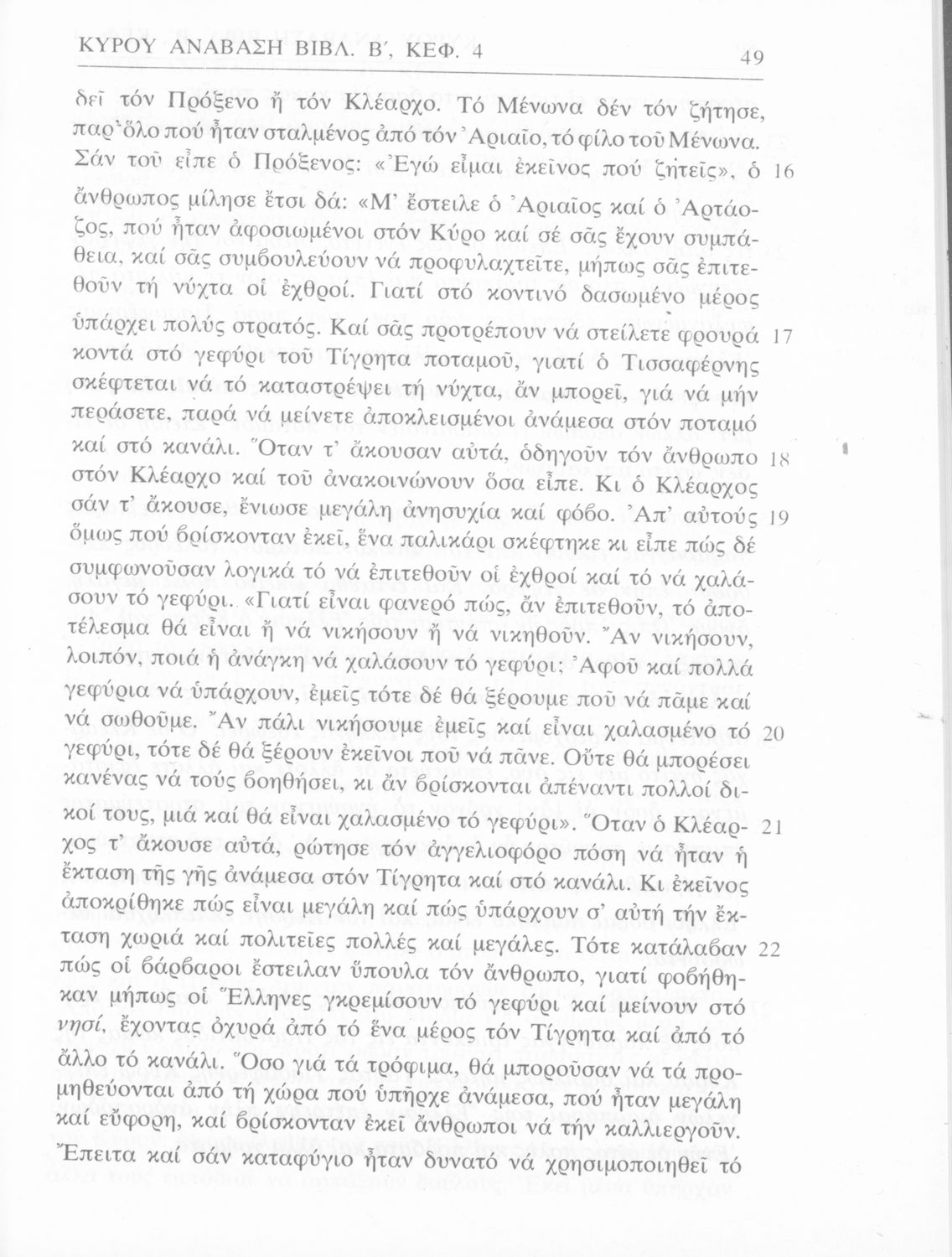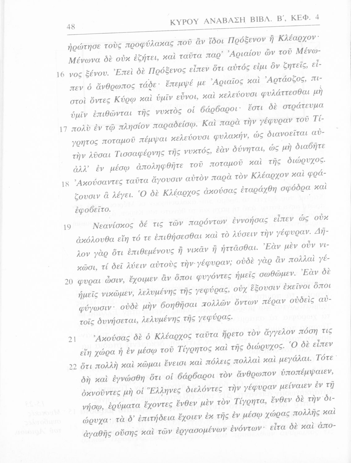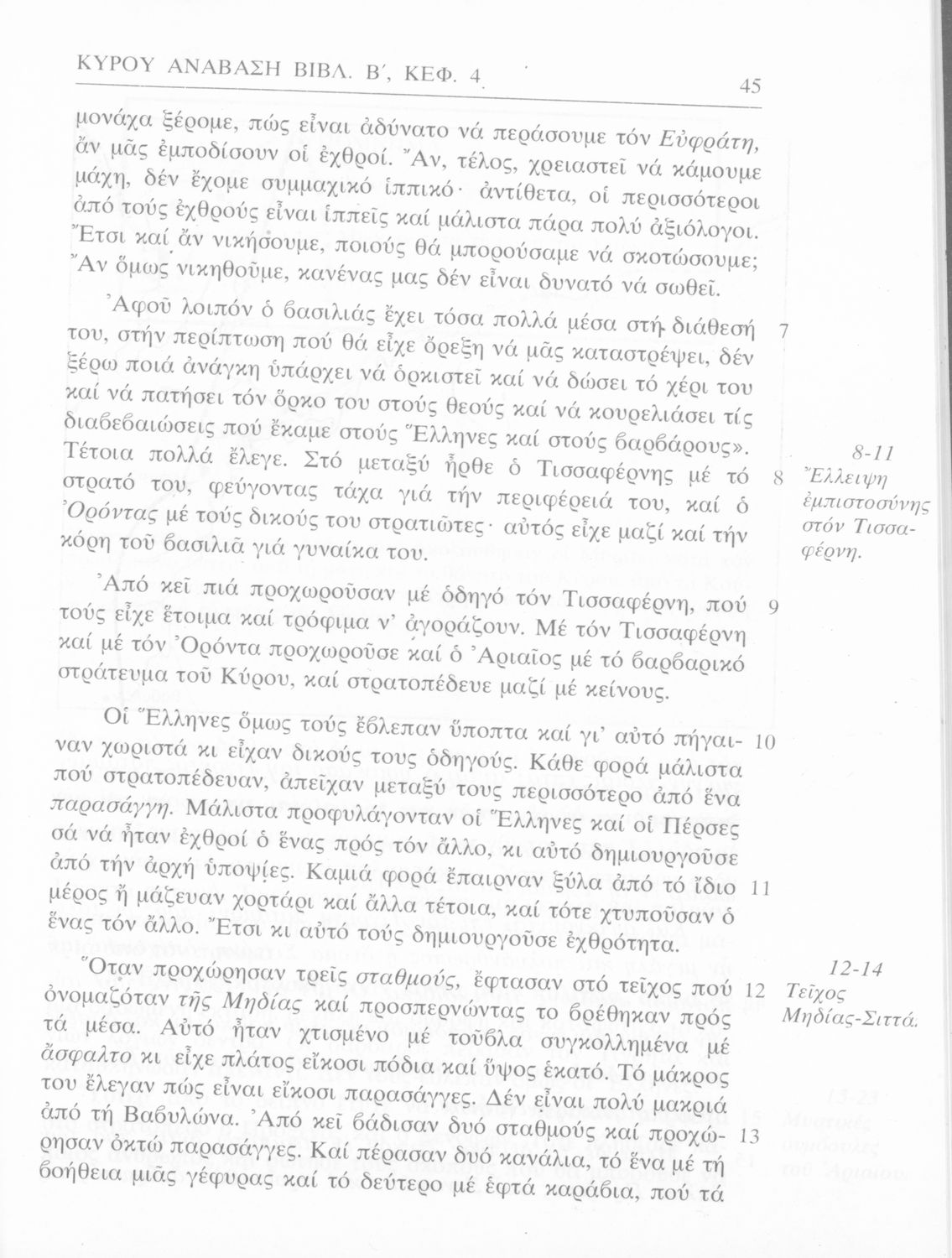 Σχολικό εγχειρίδιο Αρχαίων Ελληνικών. Από τα εφτά μέρη της "Κύρου Ανάβασις" του Ξενοφώντα που περιέχονται στο εγχειρίδιο το Πρώτο και το Έβδομο αναφέρονται περιληπτικά. Στο βιβλίο περιλαμβάνονται εισαγωγικό σημείωμα για τη ζωή και το έργο του Ξενοφώντα, σημειώσεις πάνω στα κείμενα ενώ διανθίζεται από εικόνες, χάρτες και διαγράμματα.