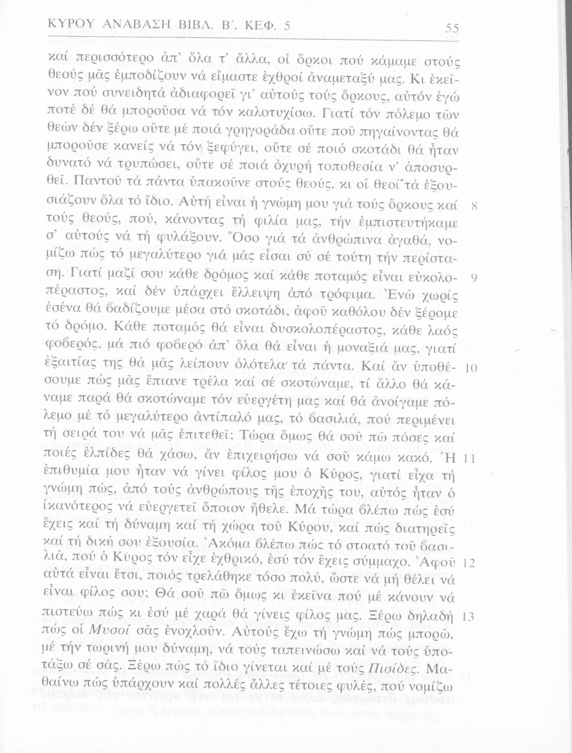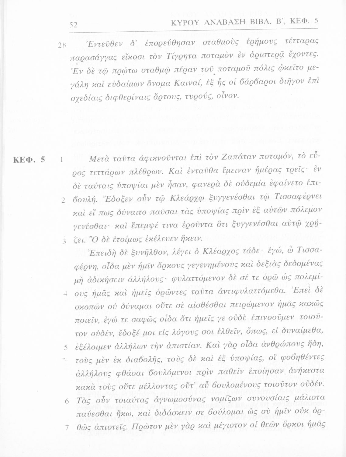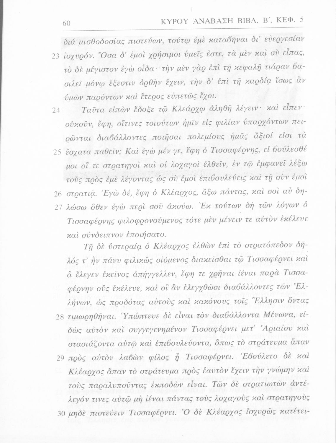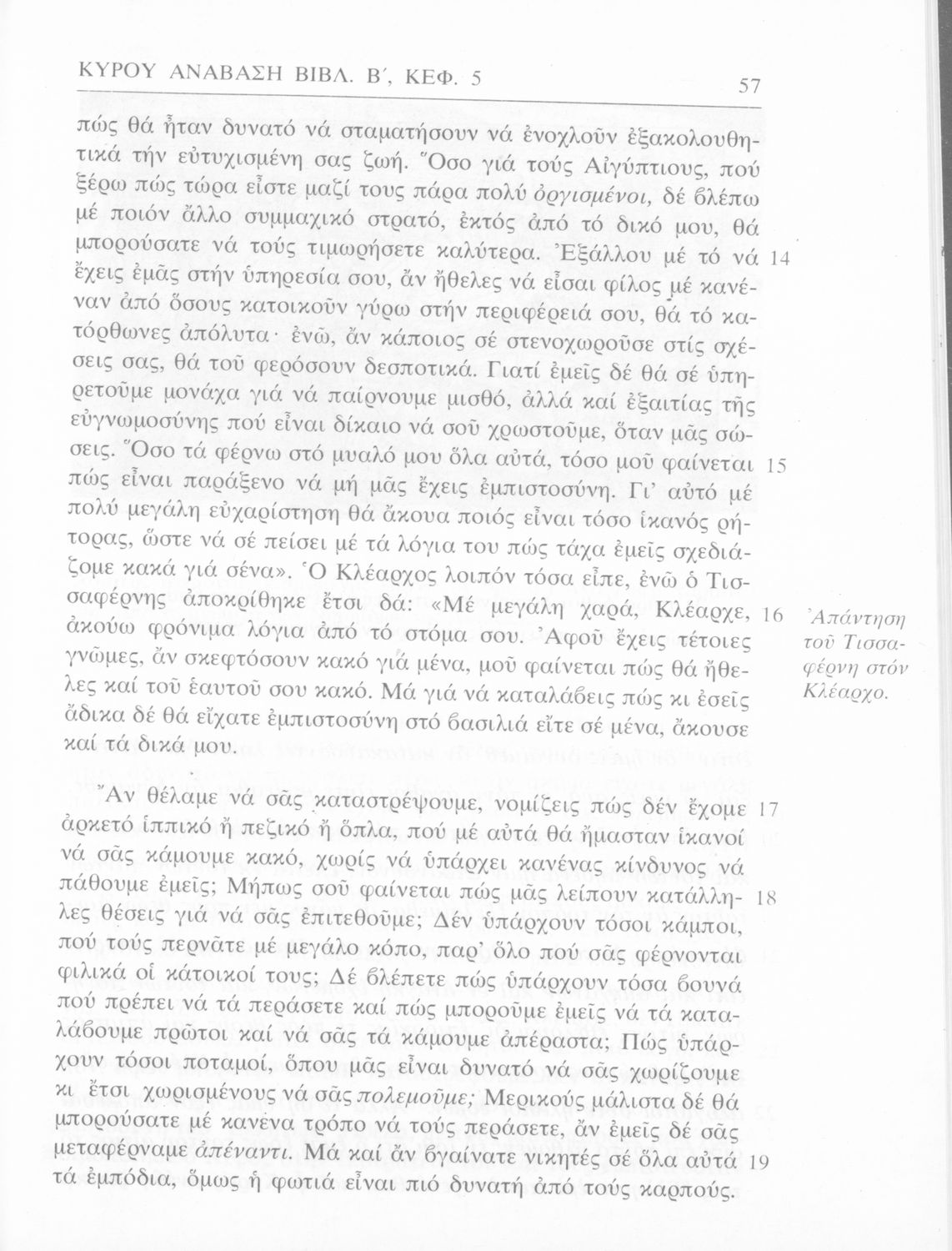 Σχολικό εγχειρίδιο Αρχαίων Ελληνικών. Από τα εφτά μέρη της "Κύρου Ανάβασις" του Ξενοφώντα που περιέχονται στο εγχειρίδιο το Πρώτο και το Έβδομο αναφέρονται περιληπτικά. Στο βιβλίο περιλαμβάνονται εισαγωγικό σημείωμα για τη ζωή και το έργο του Ξενοφώντα, σημειώσεις πάνω στα κείμενα ενώ διανθίζεται από εικόνες, χάρτες και διαγράμματα.