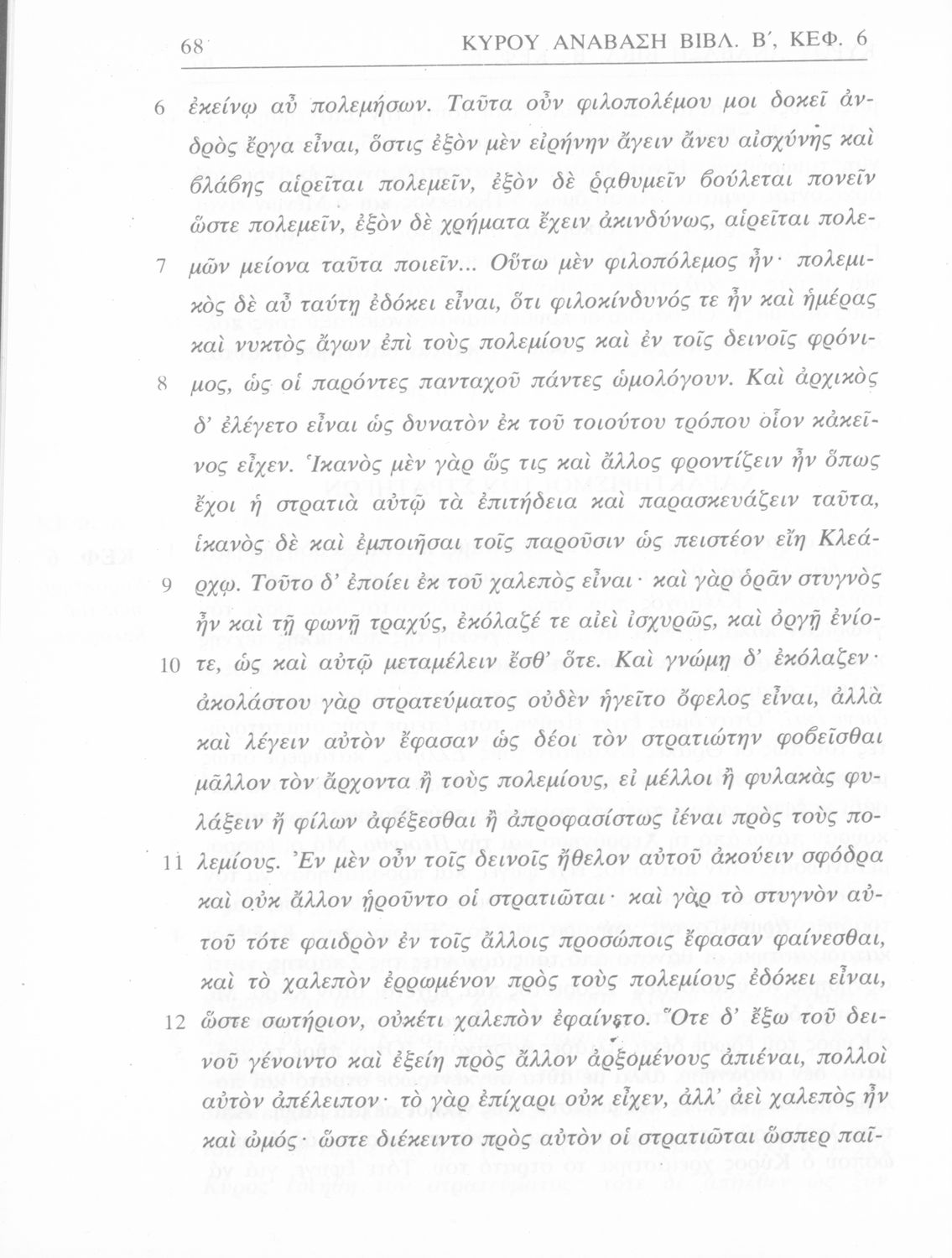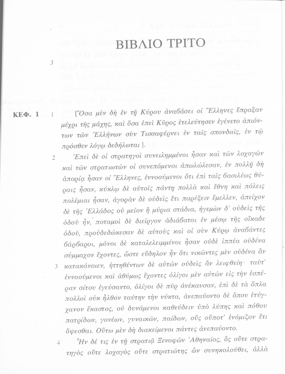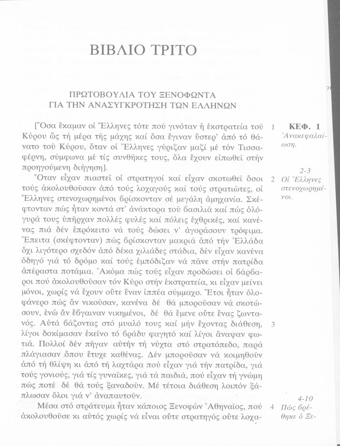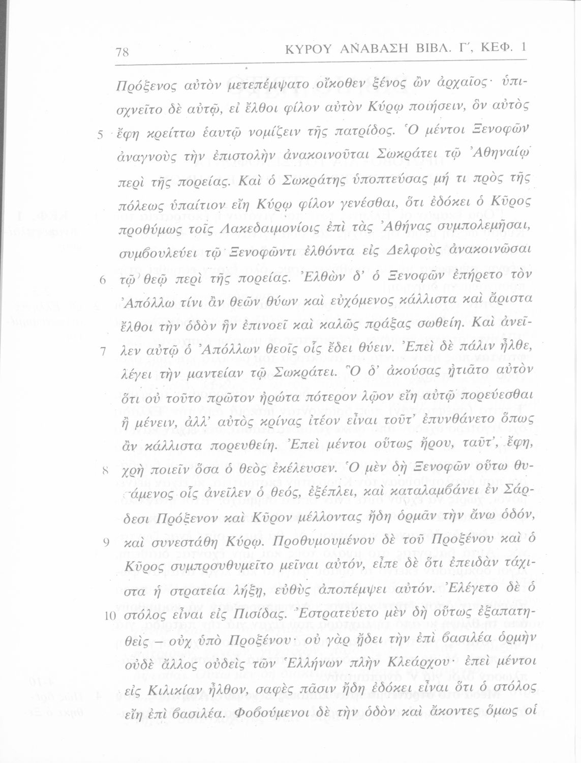 Σχολικό εγχειρίδιο Αρχαίων Ελληνικών. Από τα εφτά μέρη της "Κύρου Ανάβασις" του Ξενοφώντα που περιέχονται στο εγχειρίδιο το Πρώτο και το Έβδομο αναφέρονται περιληπτικά. Στο βιβλίο περιλαμβάνονται εισαγωγικό σημείωμα για τη ζωή και το έργο του Ξενοφώντα, σημειώσεις πάνω στα κείμενα ενώ διανθίζεται από εικόνες, χάρτες και διαγράμματα.