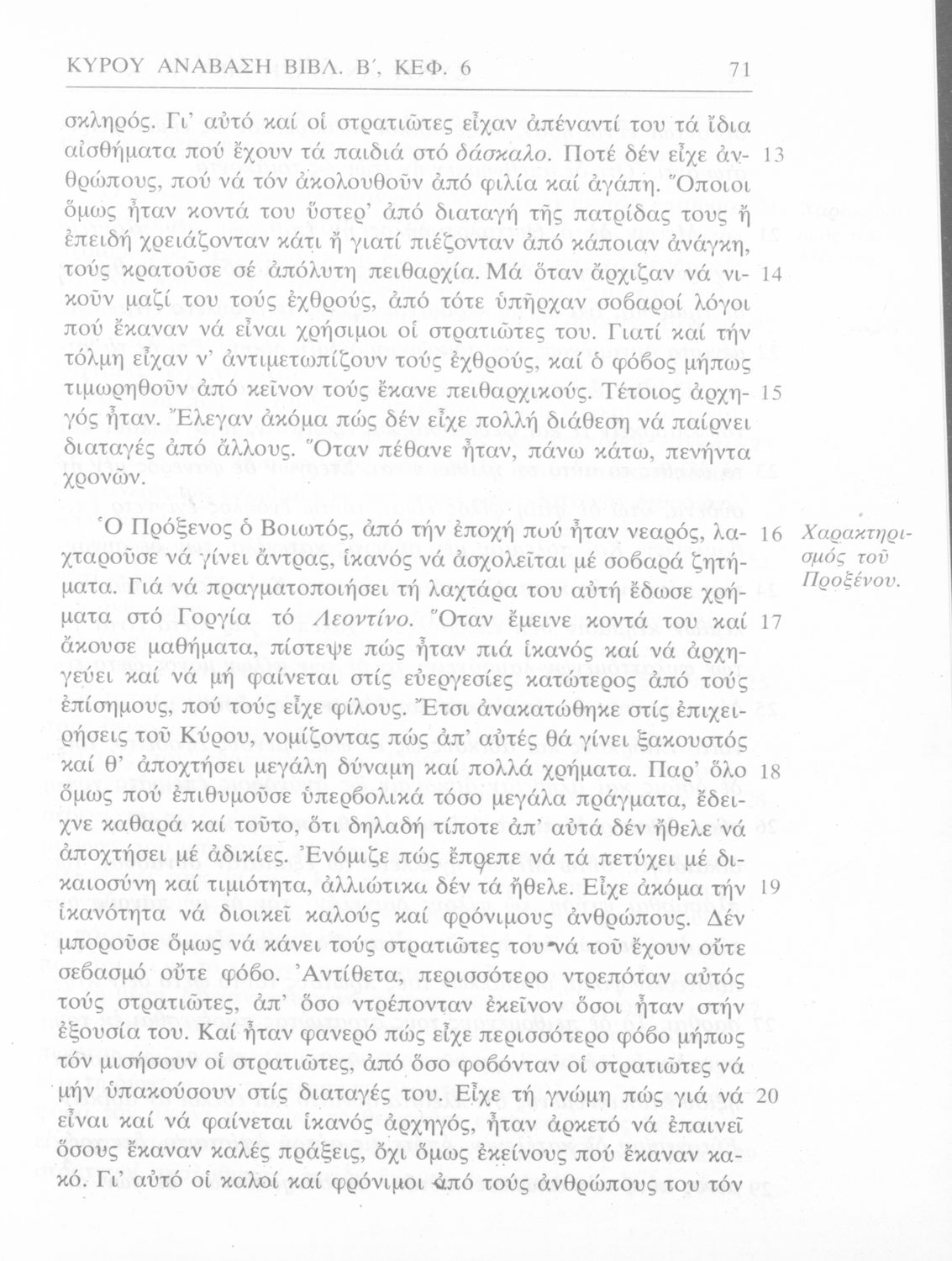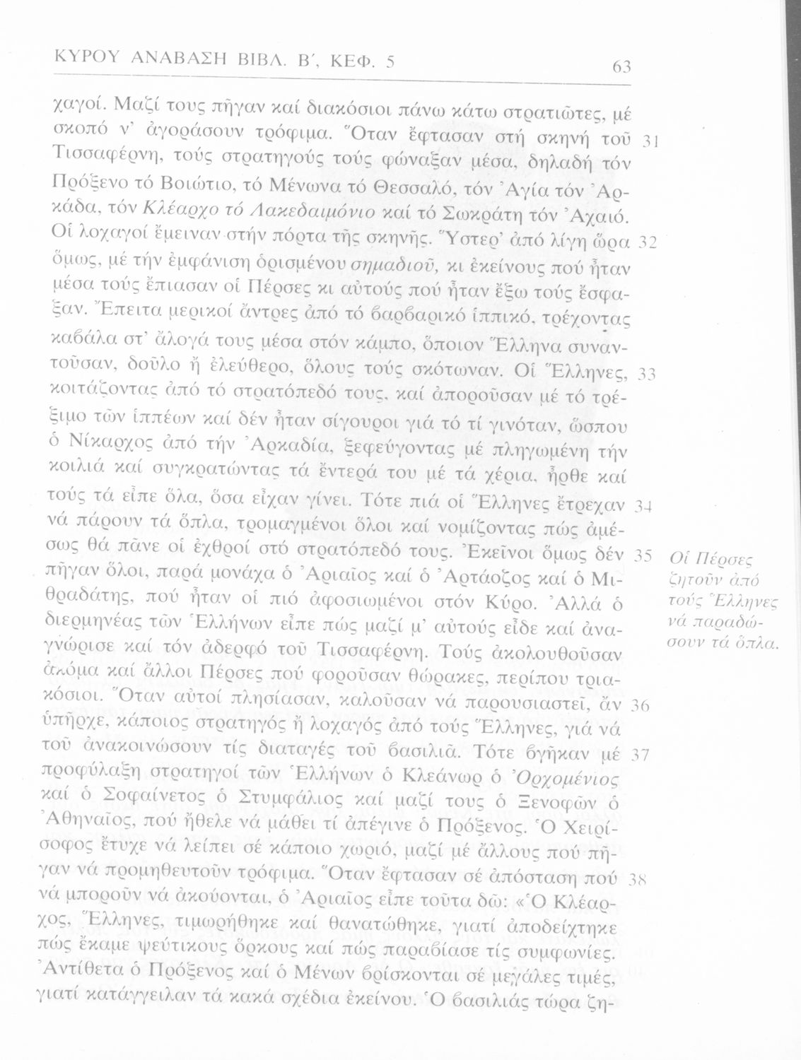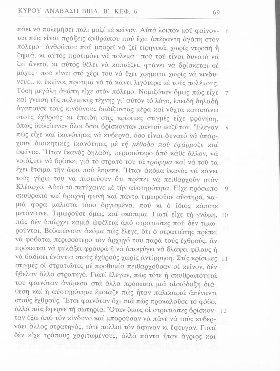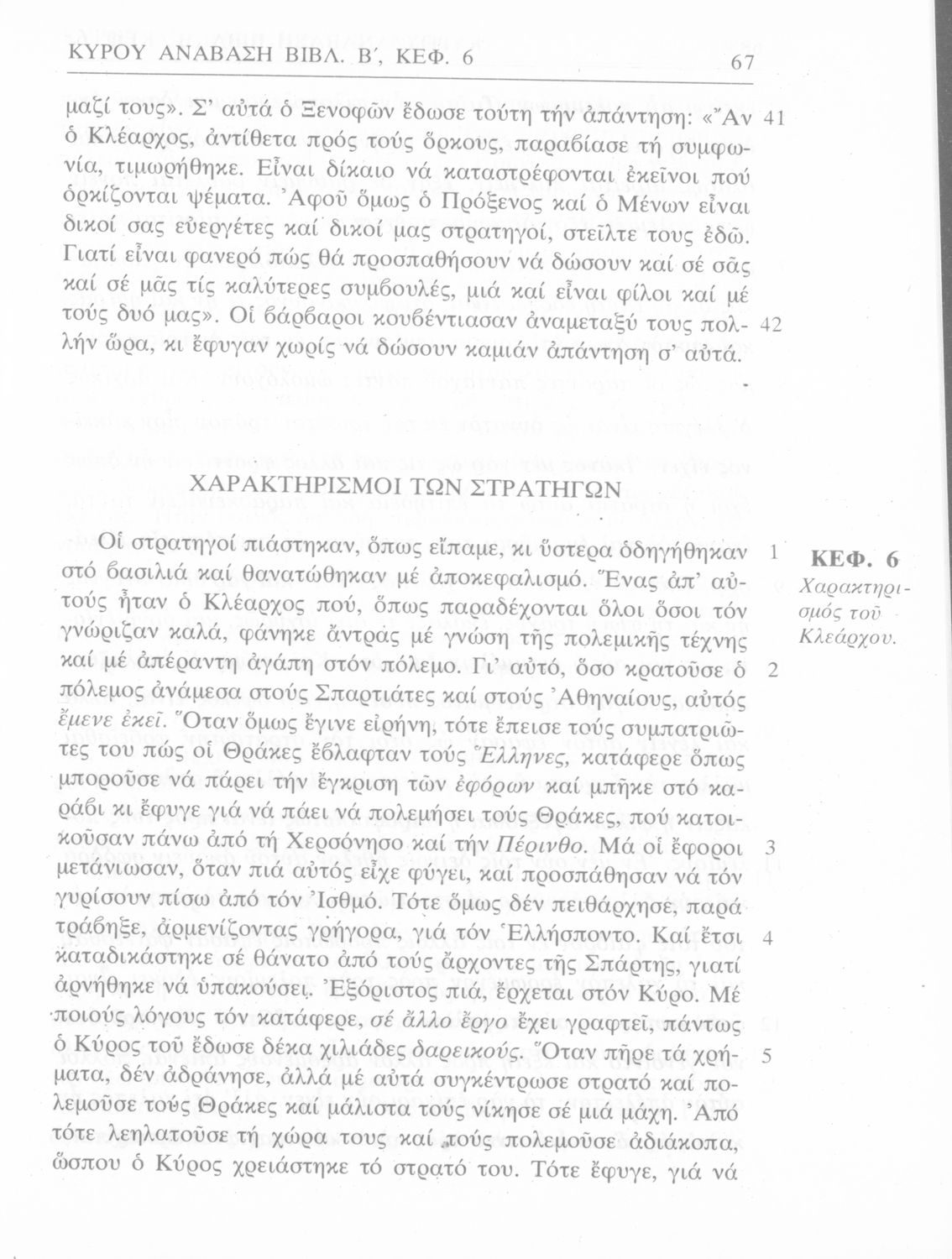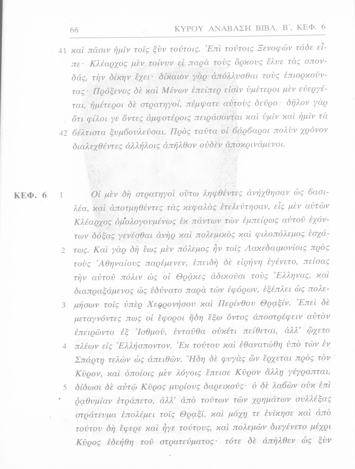 Σχολικό εγχειρίδιο Αρχαίων Ελληνικών. Από τα εφτά μέρη της "Κύρου Ανάβασις" του Ξενοφώντα που περιέχονται στο εγχειρίδιο το Πρώτο και το Έβδομο αναφέρονται περιληπτικά. Στο βιβλίο περιλαμβάνονται εισαγωγικό σημείωμα για τη ζωή και το έργο του Ξενοφώντα, σημειώσεις πάνω στα κείμενα ενώ διανθίζεται από εικόνες, χάρτες και διαγράμματα.