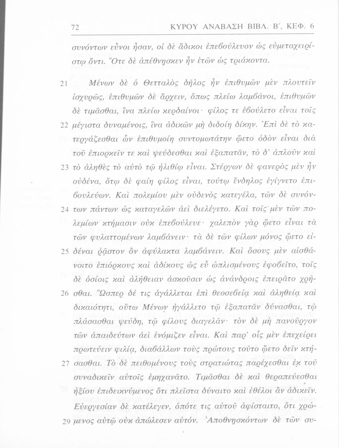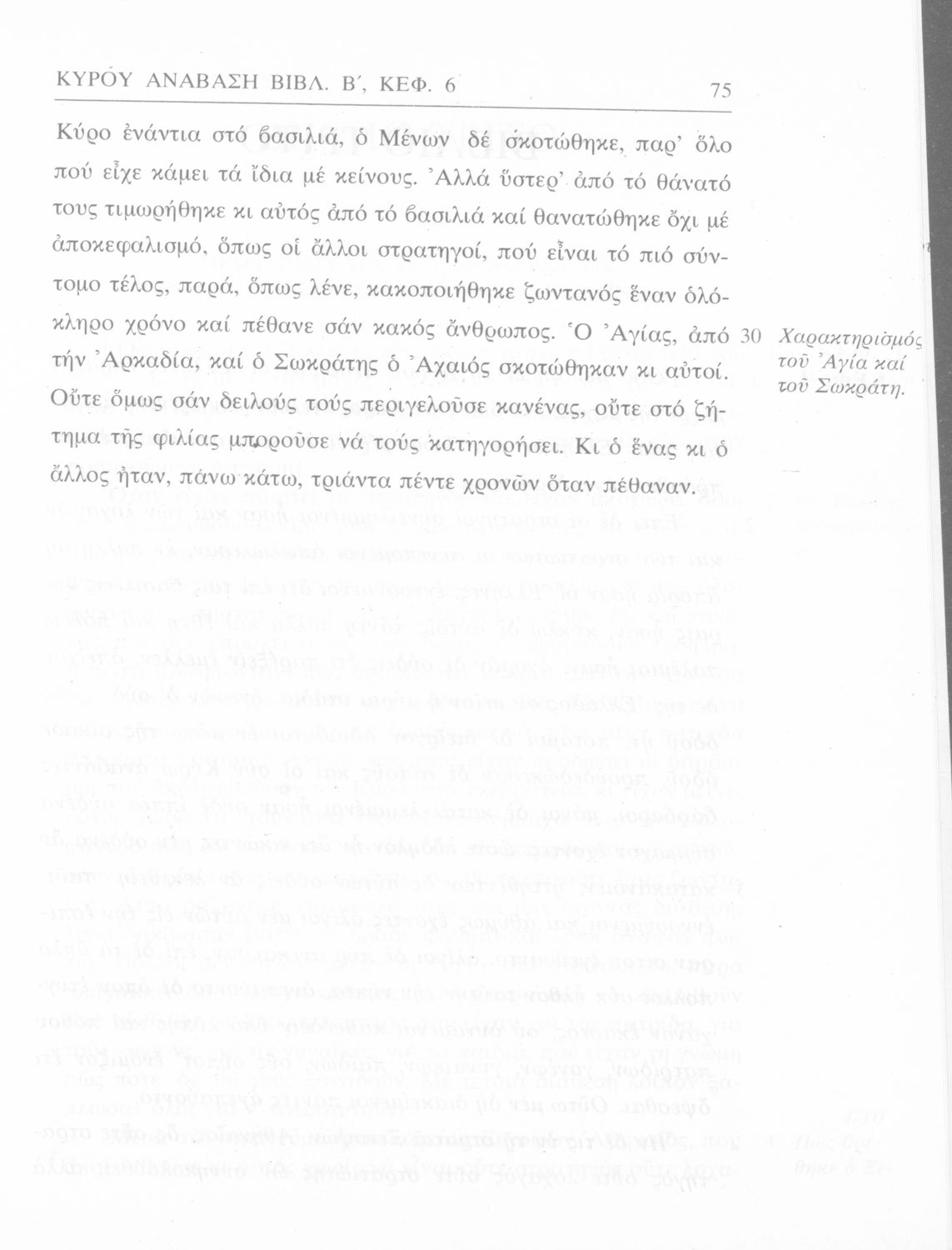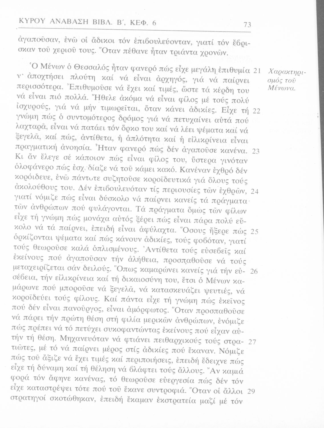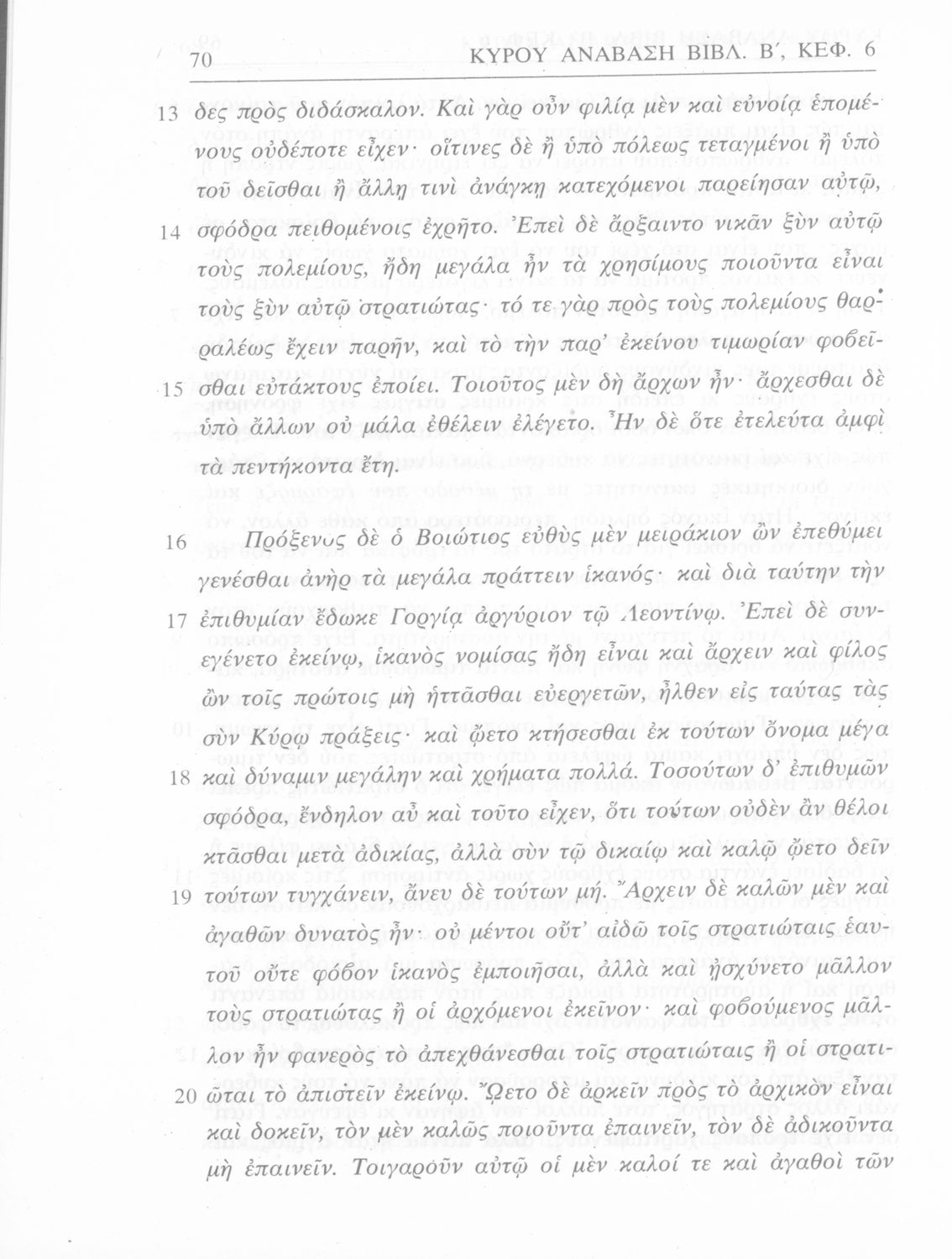 Σχολικό εγχειρίδιο Αρχαίων Ελληνικών. Από τα εφτά μέρη της "Κύρου Ανάβασις" του Ξενοφώντα που περιέχονται στο εγχειρίδιο το Πρώτο και το Έβδομο αναφέρονται περιληπτικά. Στο βιβλίο περιλαμβάνονται εισαγωγικό σημείωμα για τη ζωή και το έργο του Ξενοφώντα, σημειώσεις πάνω στα κείμενα ενώ διανθίζεται από εικόνες, χάρτες και διαγράμματα.