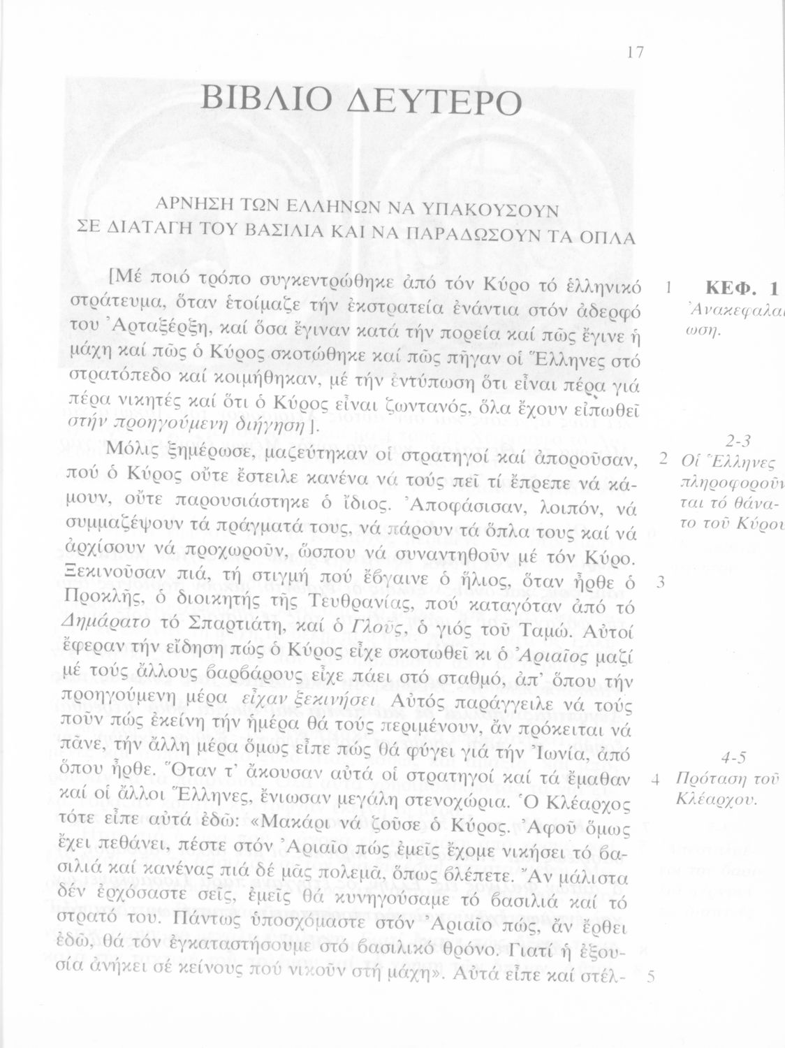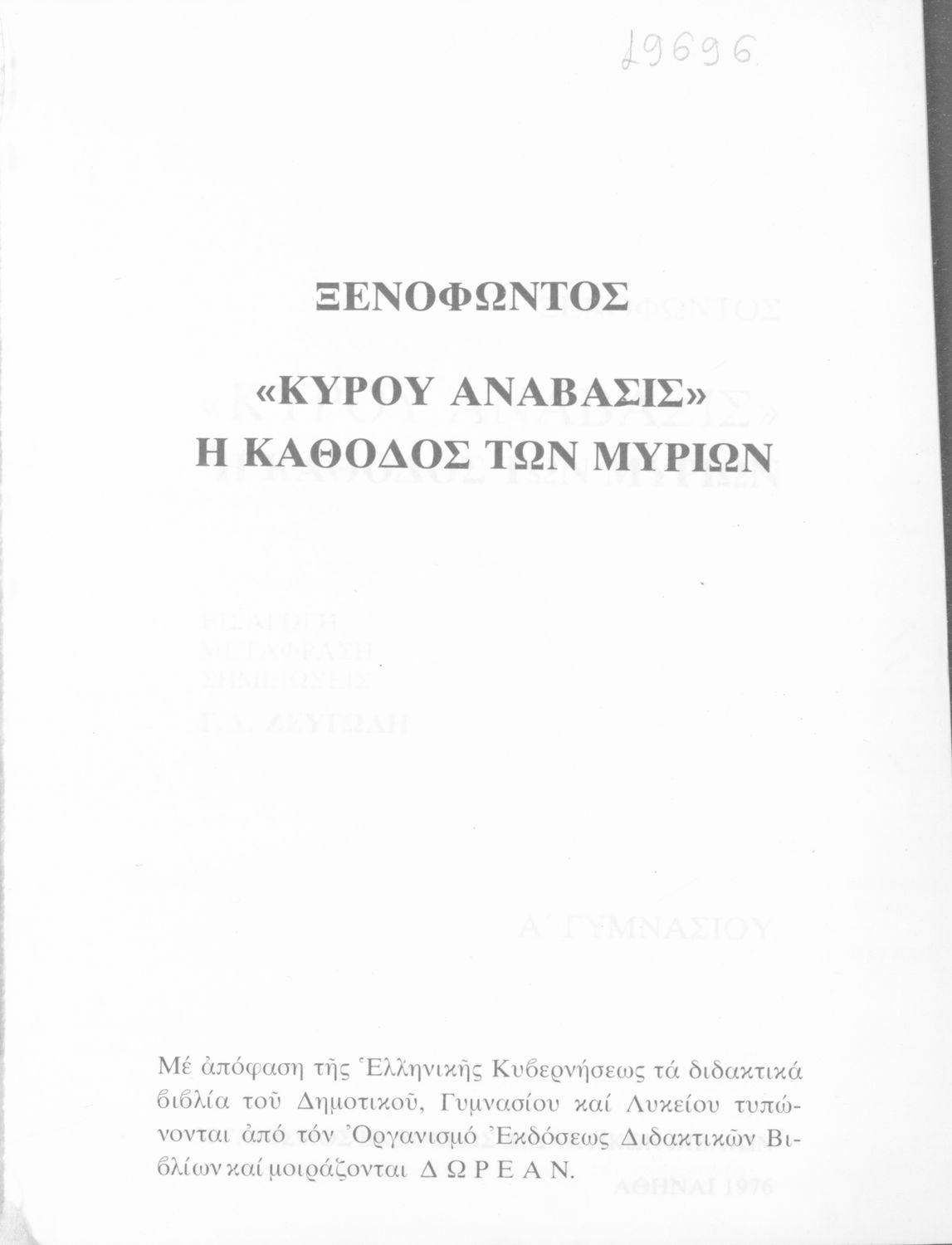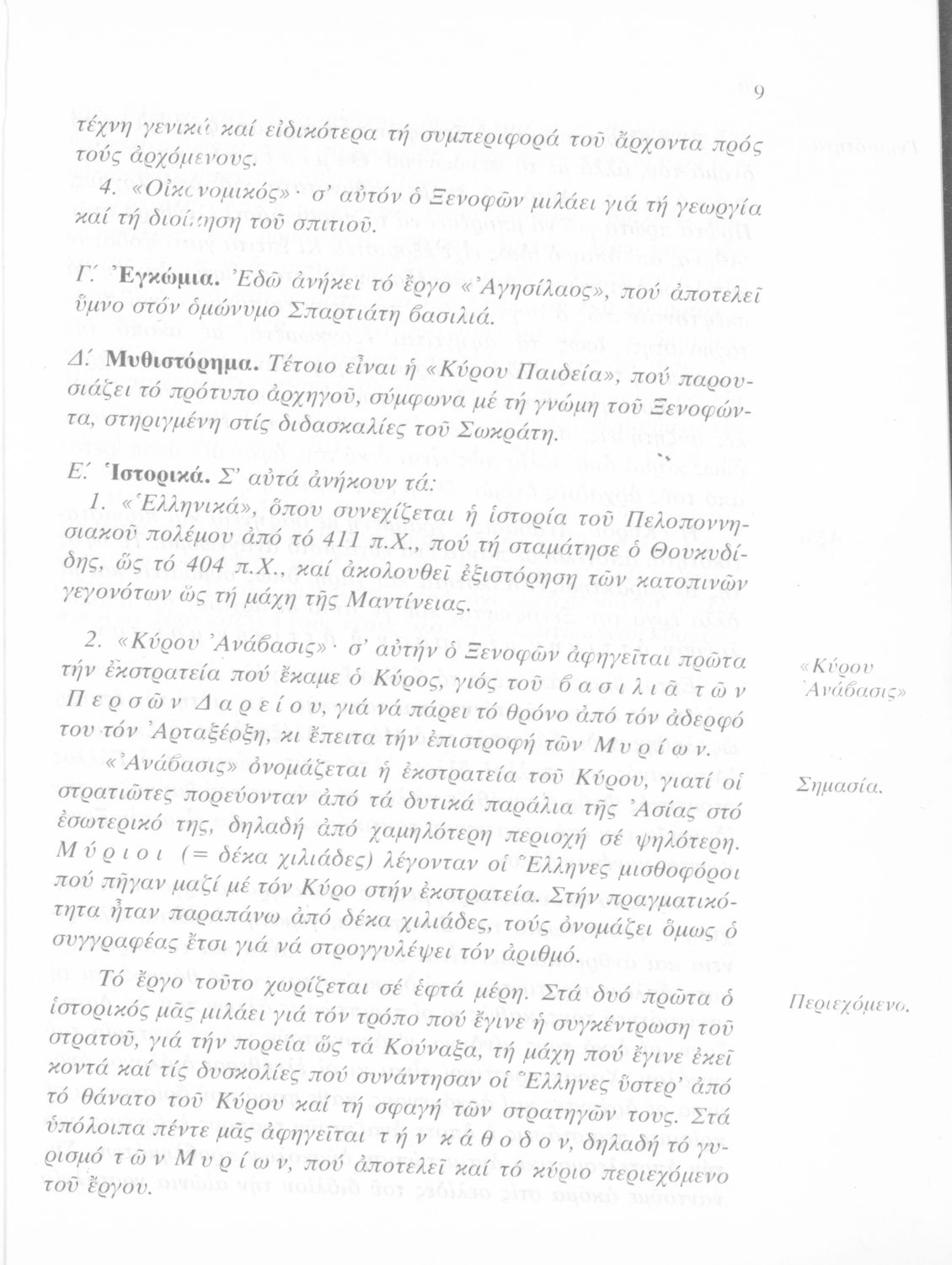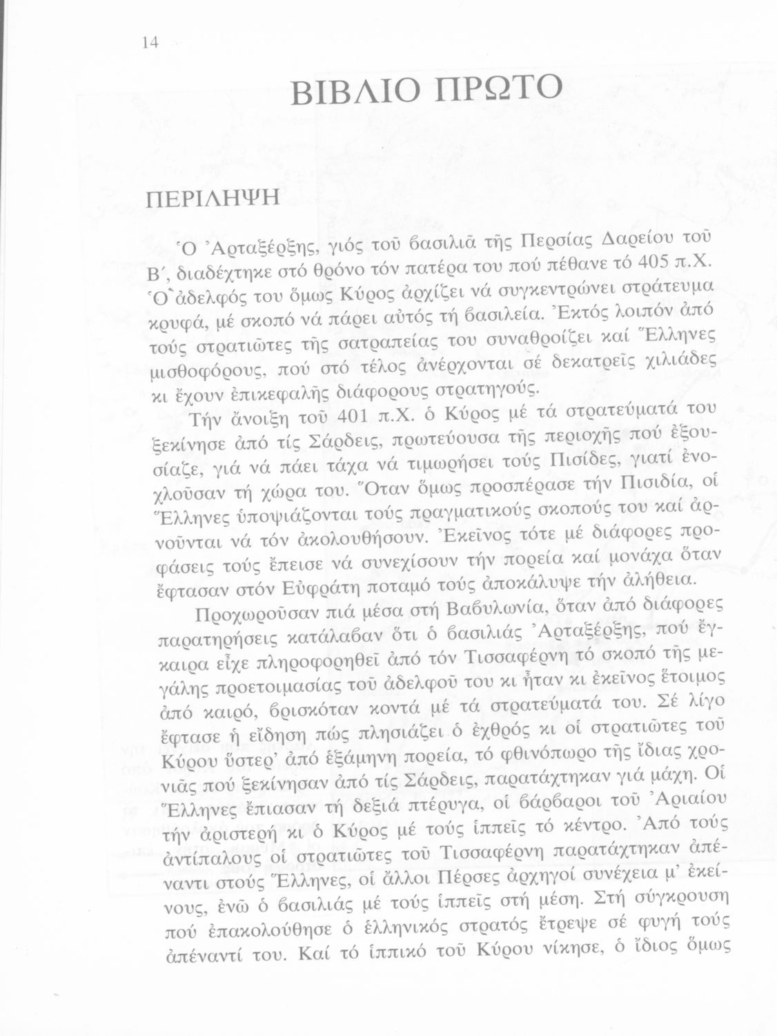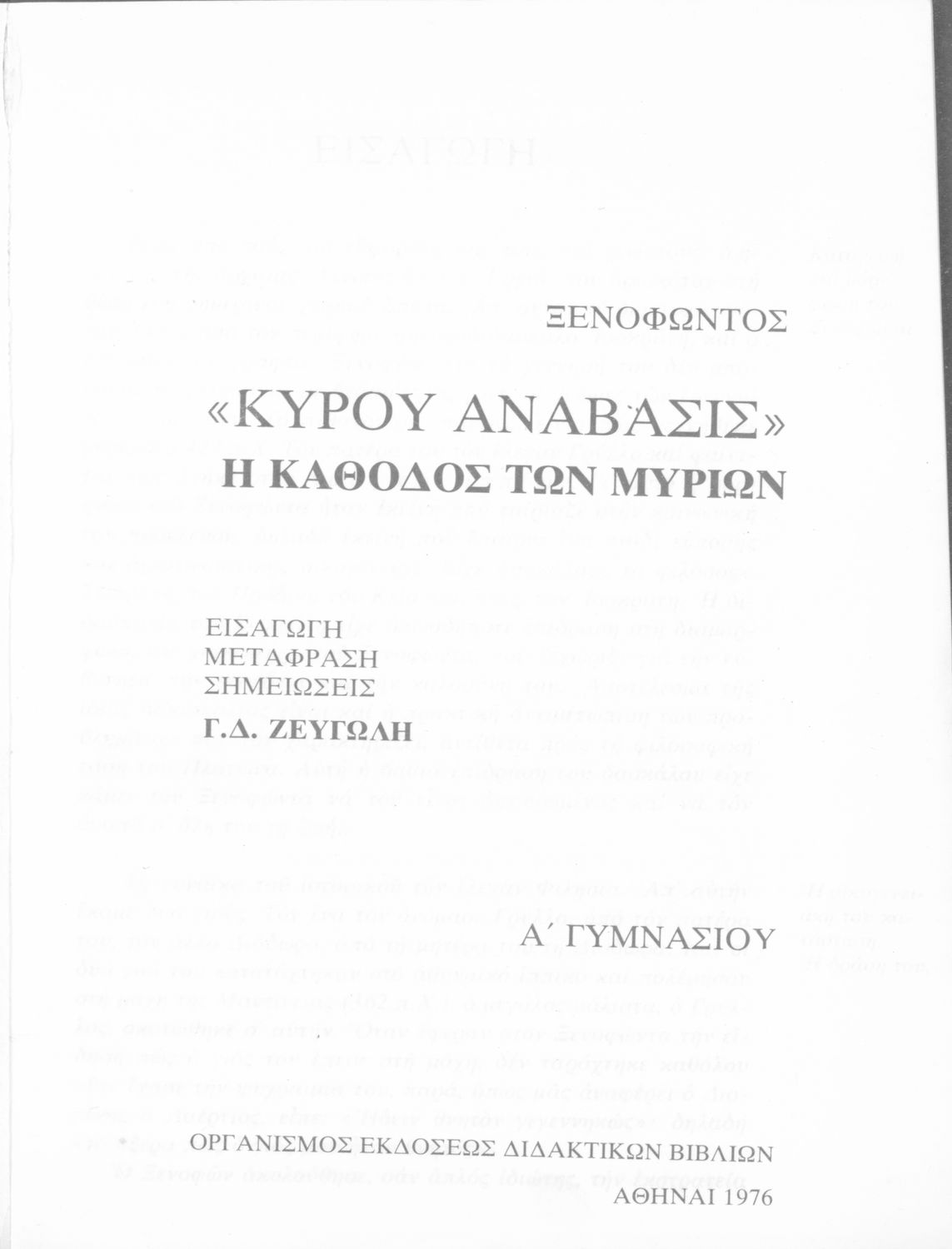 Σχολικό εγχειρίδιο Αρχαίων Ελληνικών. Από τα εφτά μέρη της "Κύρου Ανάβασις" του Ξενοφώντα που περιέχονται στο εγχειρίδιο το Πρώτο και το Έβδομο αναφέρονται περιληπτικά. Στο βιβλίο περιλαμβάνονται εισαγωγικό σημείωμα για τη ζωή και το έργο του Ξενοφώντα, σημειώσεις πάνω στα κείμενα ενώ διανθίζεται από εικόνες, χάρτες και διαγράμματα.