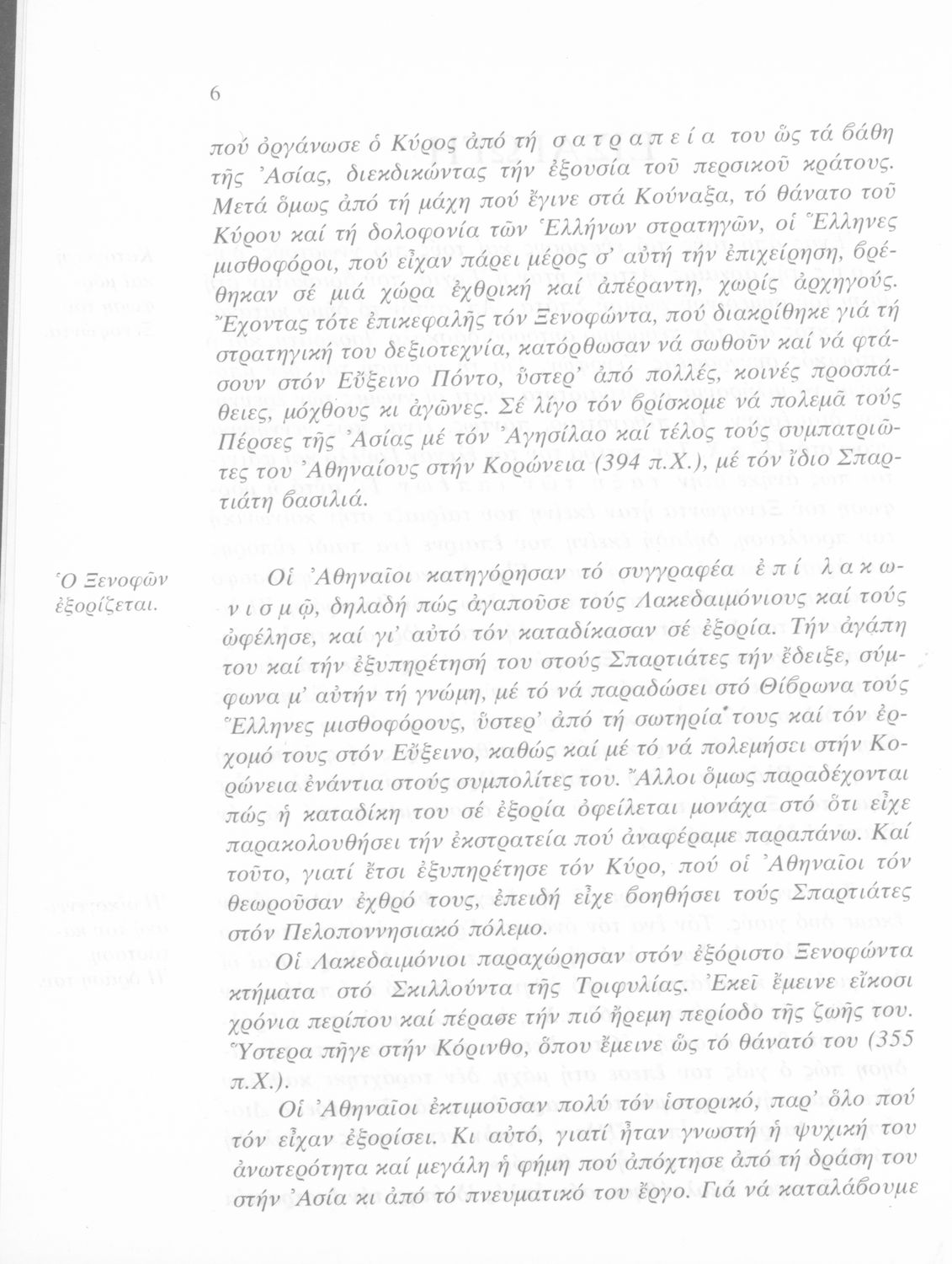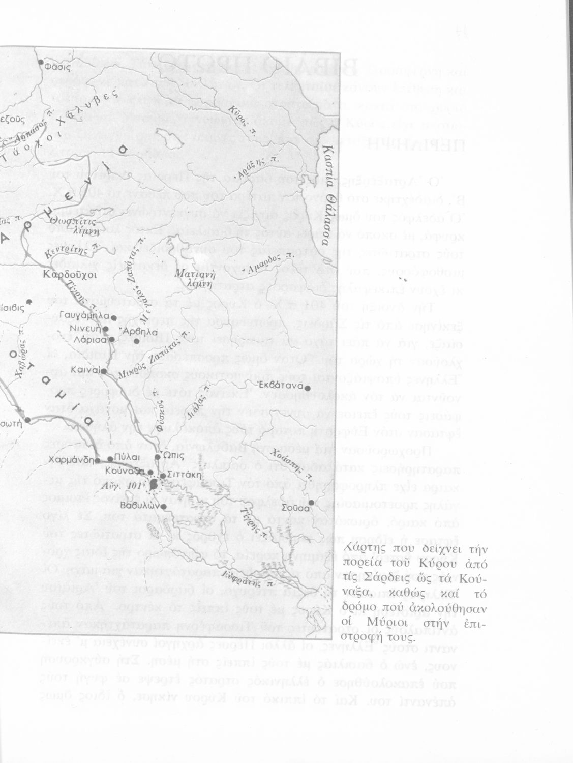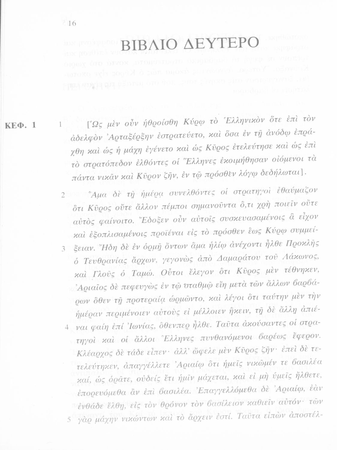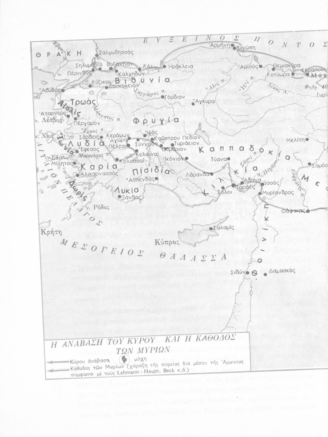 Σχολικό εγχειρίδιο Αρχαίων Ελληνικών. Από τα εφτά μέρη της "Κύρου Ανάβασις" του Ξενοφώντα που περιέχονται στο εγχειρίδιο το Πρώτο και το Έβδομο αναφέρονται περιληπτικά. Στο βιβλίο περιλαμβάνονται εισαγωγικό σημείωμα για τη ζωή και το έργο του Ξενοφώντα, σημειώσεις πάνω στα κείμενα ενώ διανθίζεται από εικόνες, χάρτες και διαγράμματα.