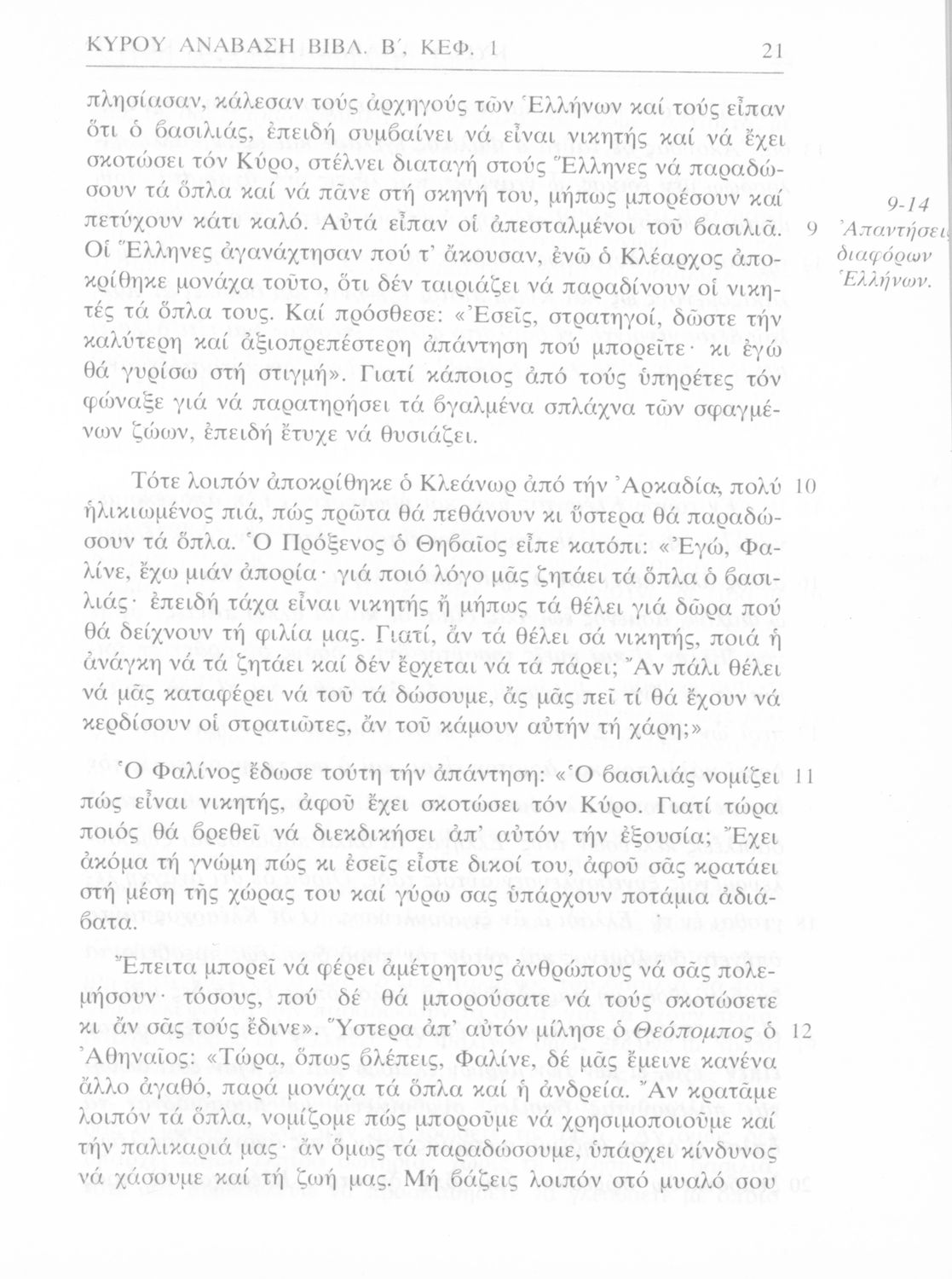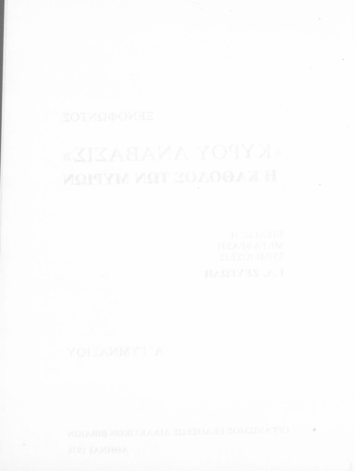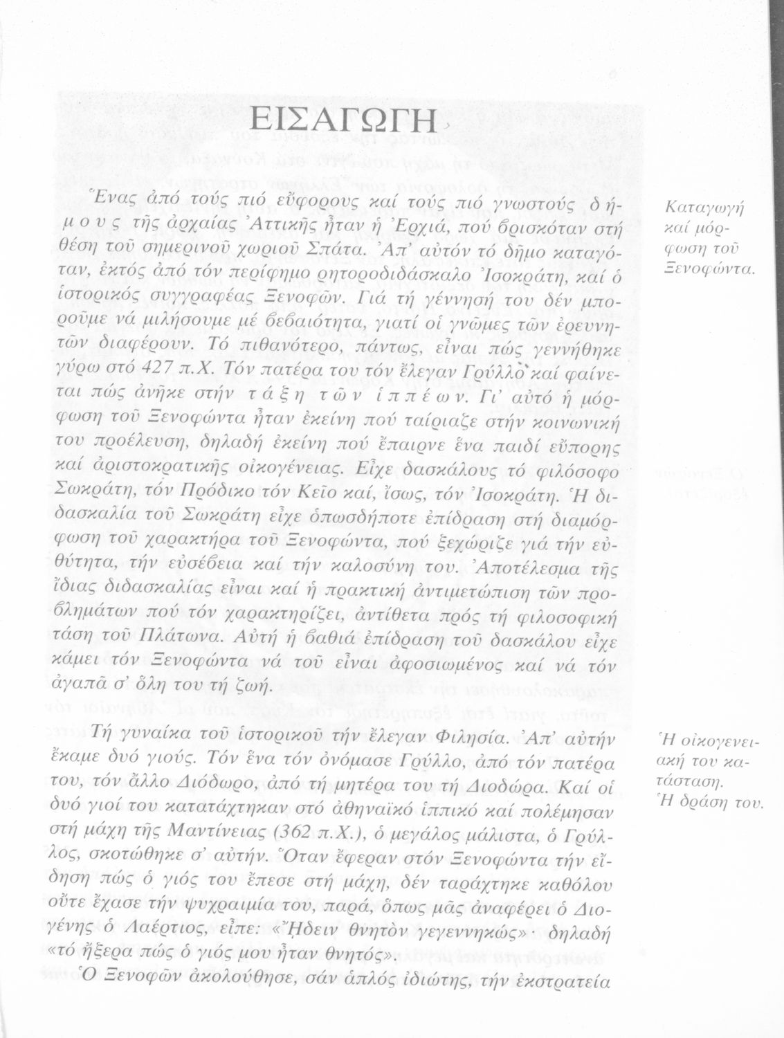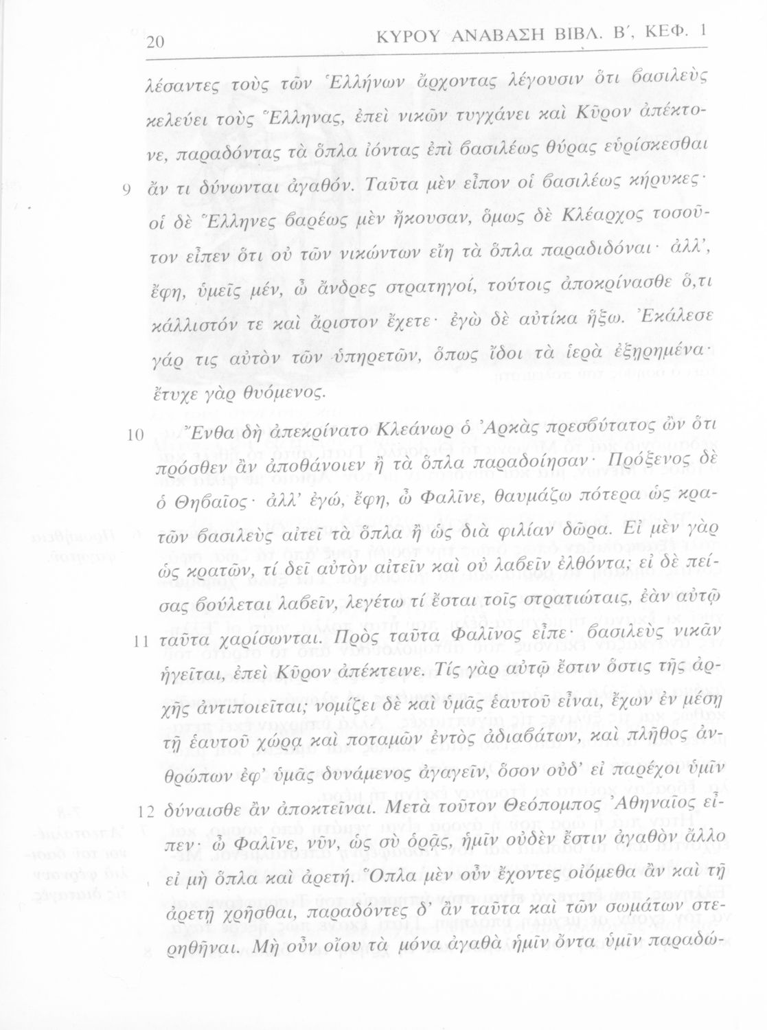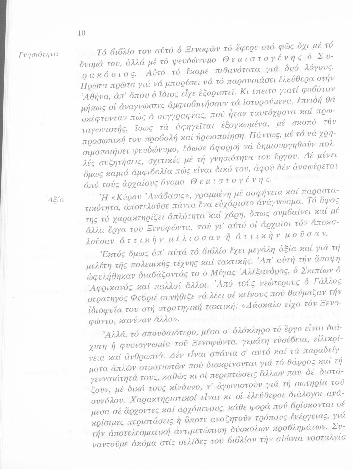 Σχολικό εγχειρίδιο Αρχαίων Ελληνικών. Από τα εφτά μέρη της "Κύρου Ανάβασις" του Ξενοφώντα που περιέχονται στο εγχειρίδιο το Πρώτο και το Έβδομο αναφέρονται περιληπτικά. Στο βιβλίο περιλαμβάνονται εισαγωγικό σημείωμα για τη ζωή και το έργο του Ξενοφώντα, σημειώσεις πάνω στα κείμενα ενώ διανθίζεται από εικόνες, χάρτες και διαγράμματα.