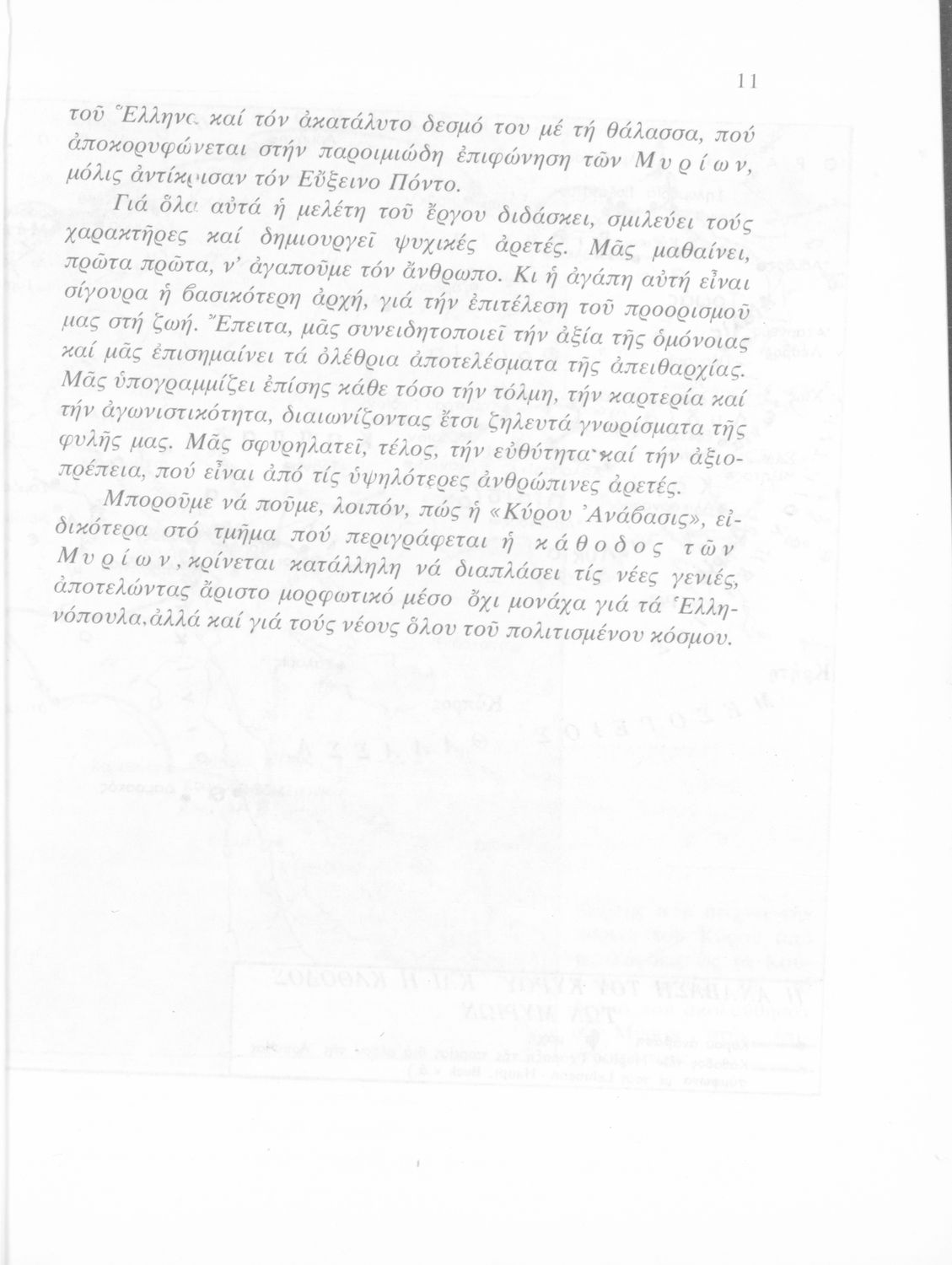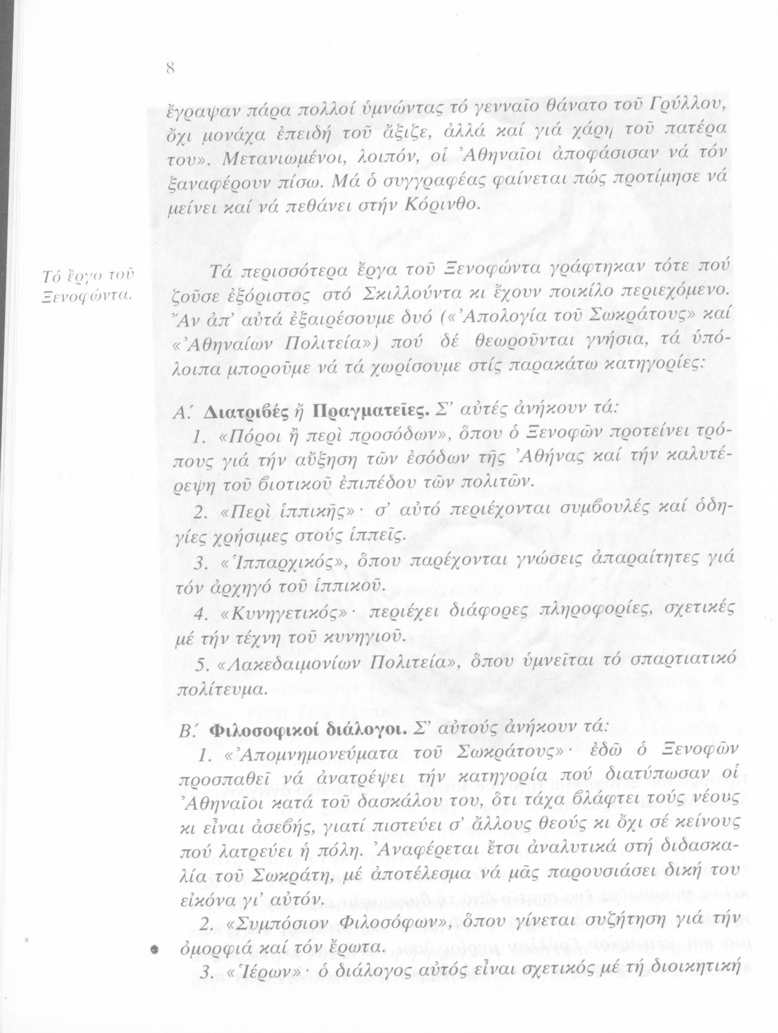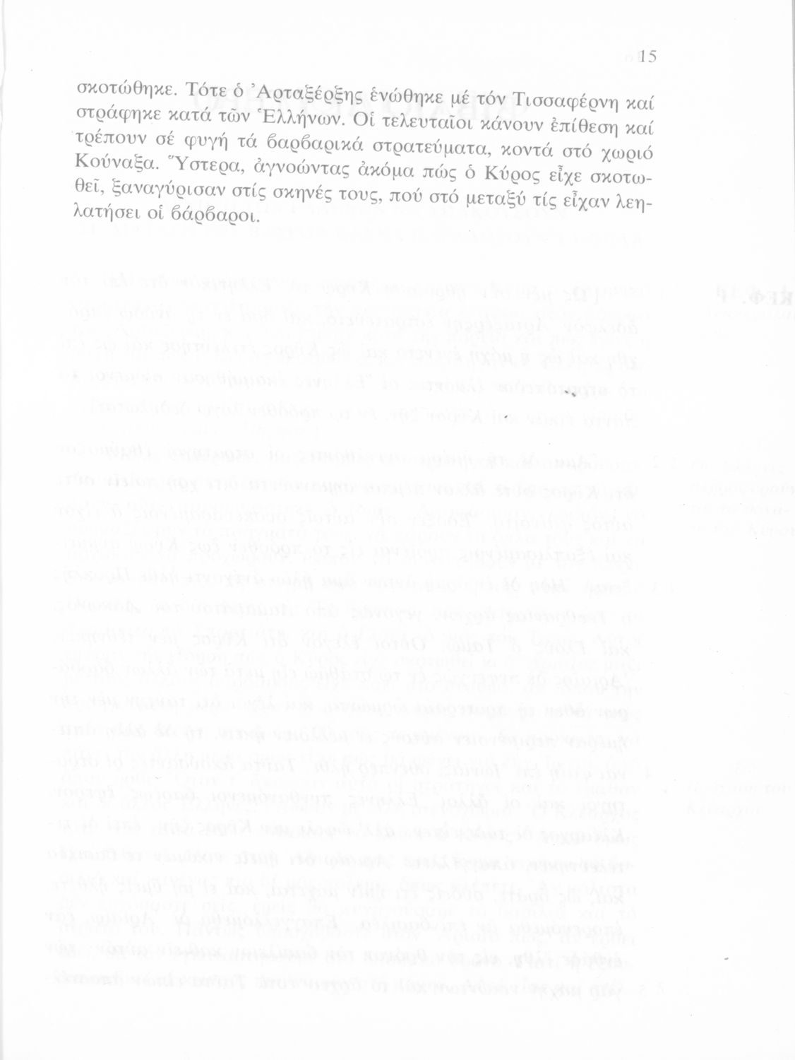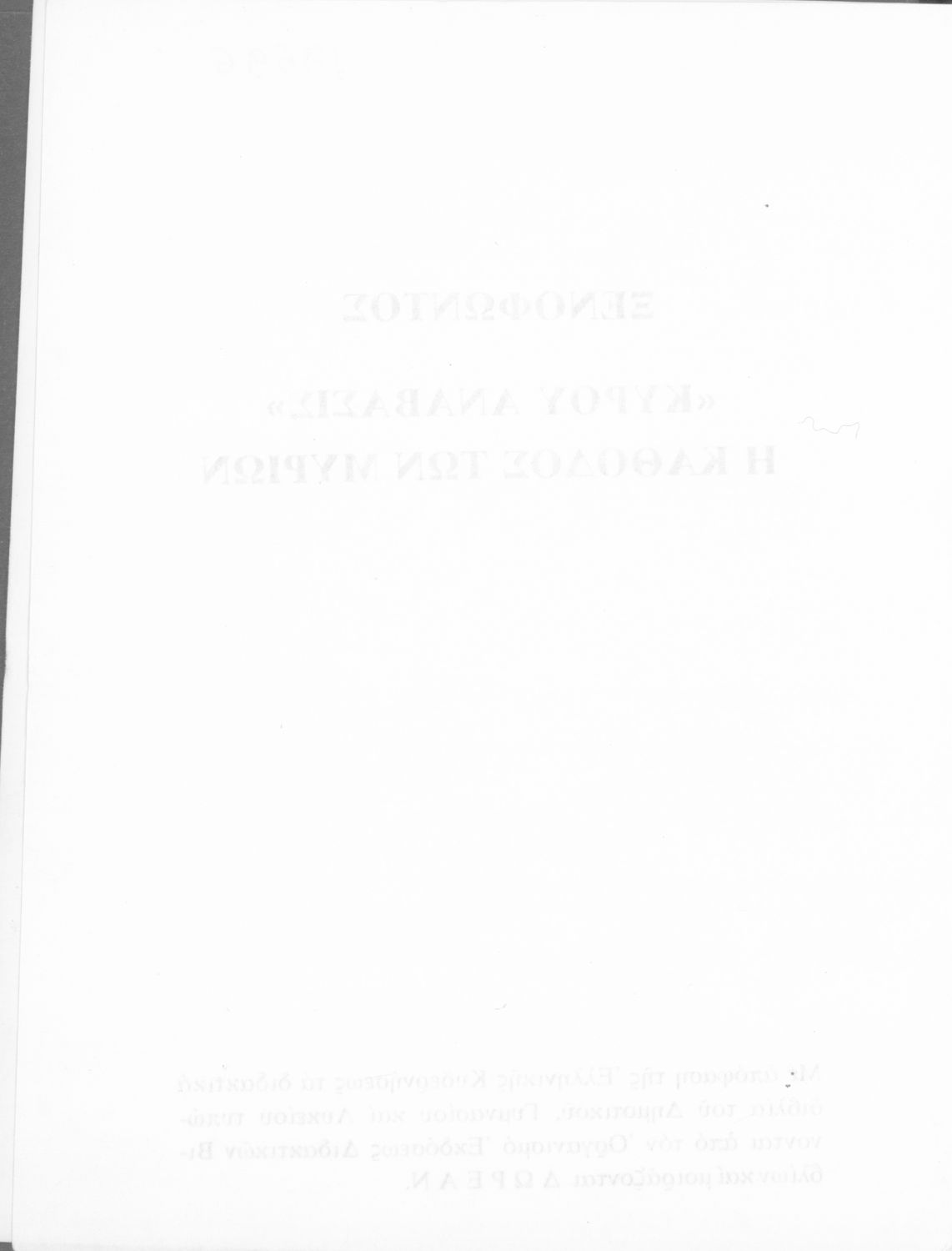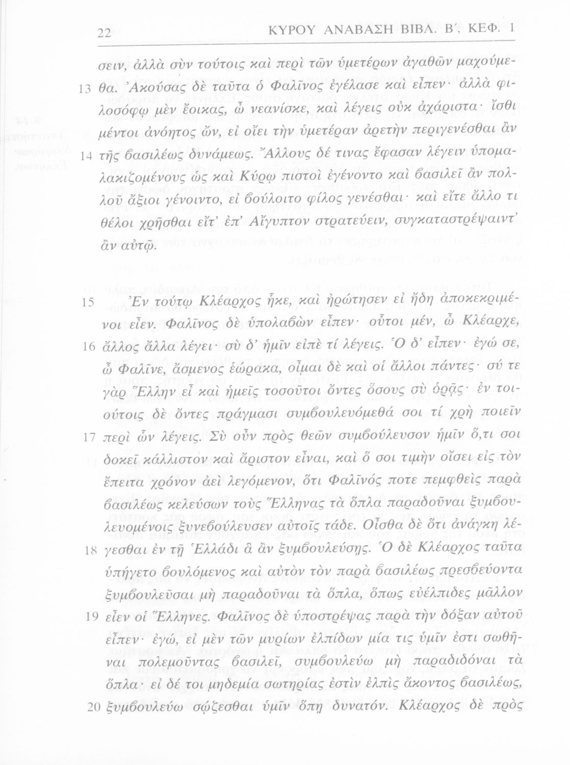 Σχολικό εγχειρίδιο Αρχαίων Ελληνικών. Από τα εφτά μέρη της "Κύρου Ανάβασις" του Ξενοφώντα που περιέχονται στο εγχειρίδιο το Πρώτο και το Έβδομο αναφέρονται περιληπτικά. Στο βιβλίο περιλαμβάνονται εισαγωγικό σημείωμα για τη ζωή και το έργο του Ξενοφώντα, σημειώσεις πάνω στα κείμενα ενώ διανθίζεται από εικόνες, χάρτες και διαγράμματα.