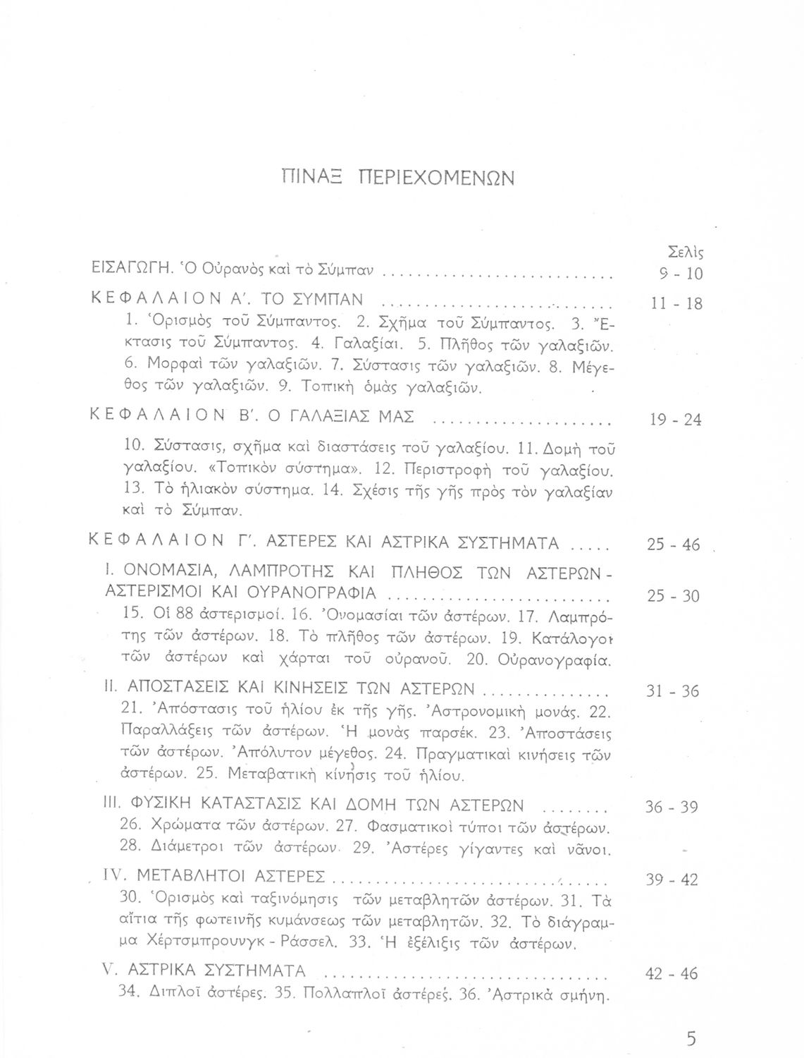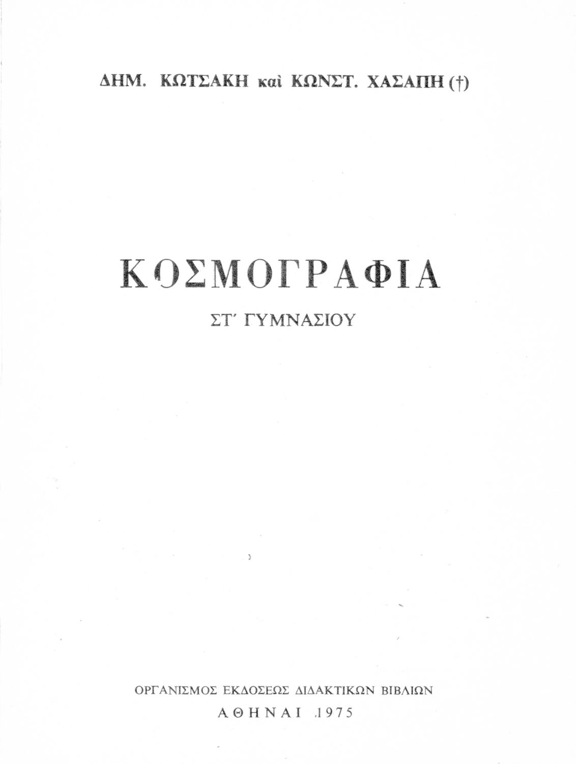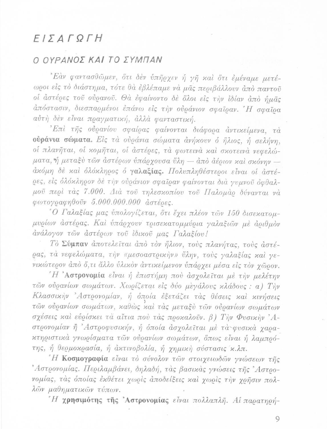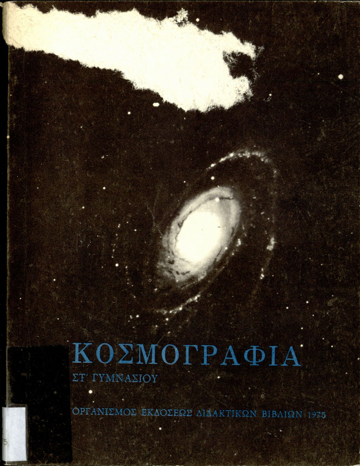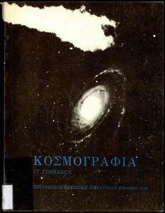 Σχολικό εγχειρίδιο Κοσμογραφίας ΣΤ΄ Γυμνασίου που πραγματεύεται τη μορφή, σύσταση, μέγεθος και κίνηση των γαλαξιών και των πλανητών. Περιέχει στοιχεία αστροναυτικής και πίνακα με 88 αστερισμούς, τα διεθνή ονόματα και τα σύμβολά τους.