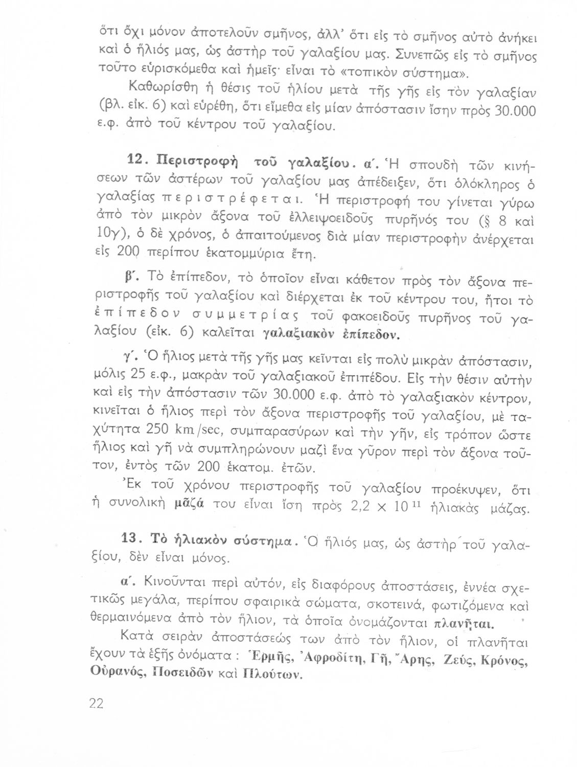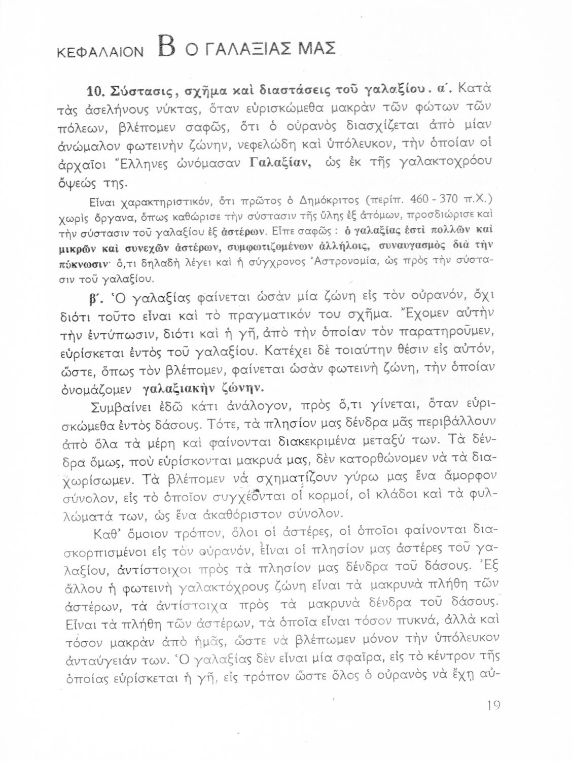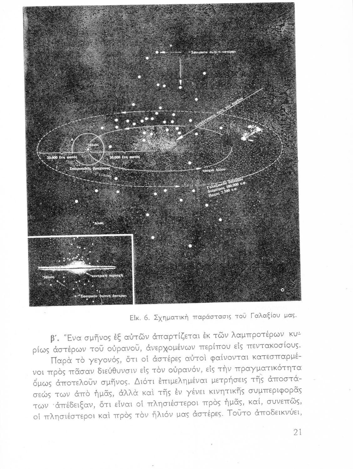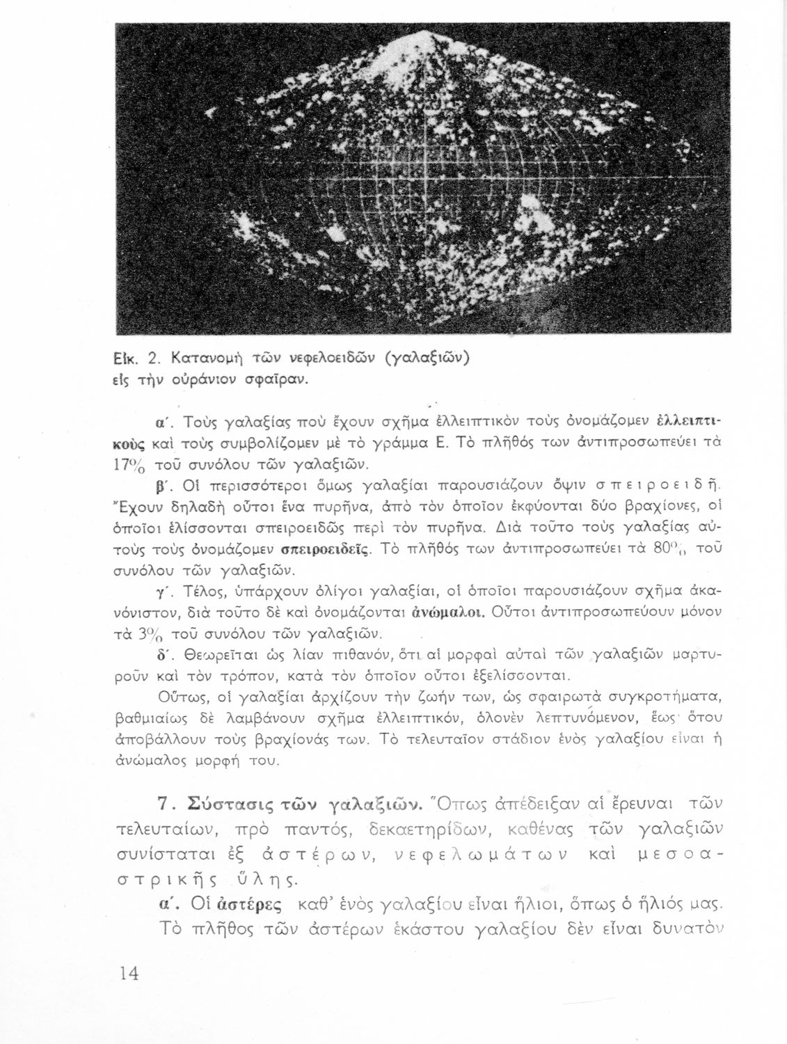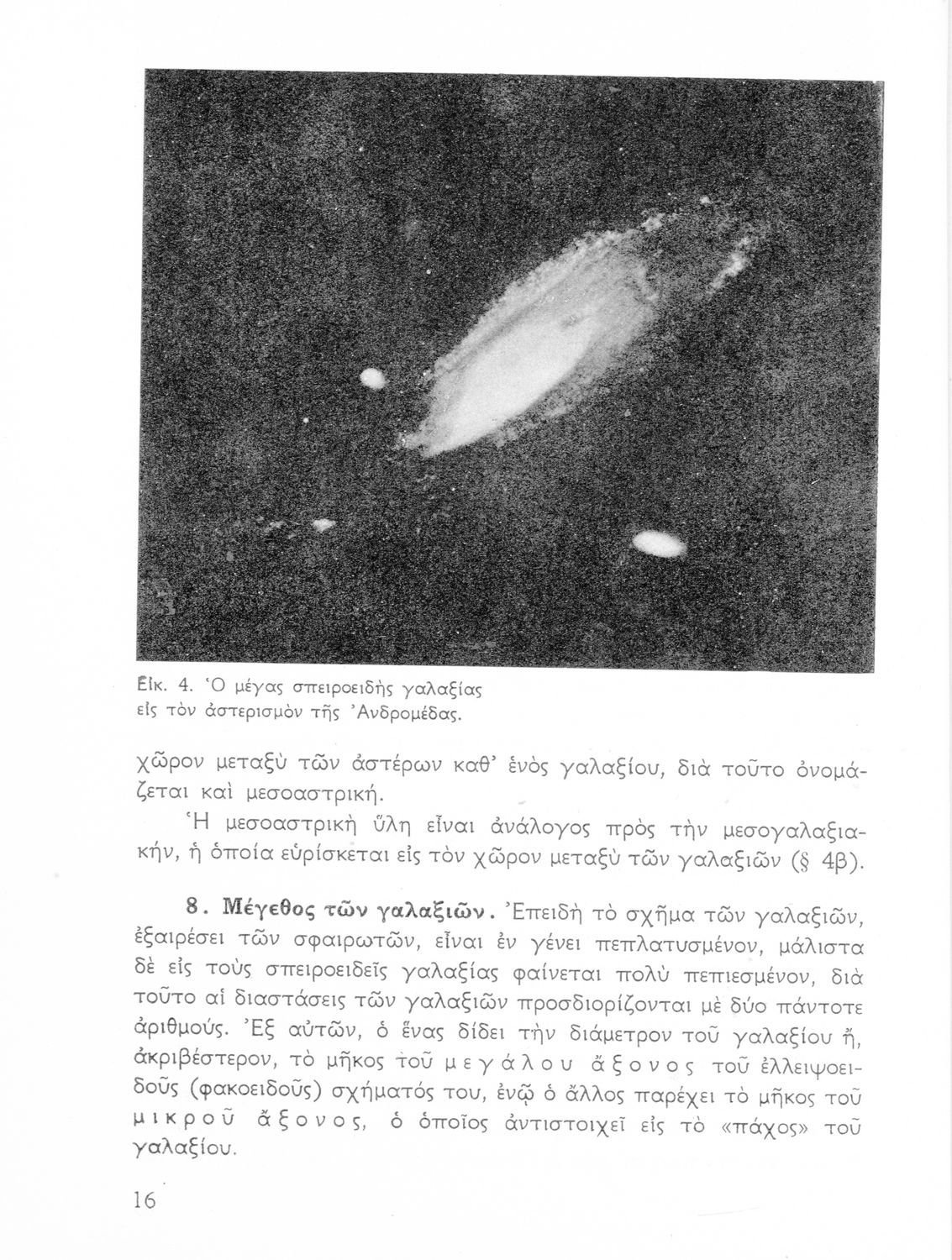 Σχολικό εγχειρίδιο Κοσμογραφίας ΣΤ΄ Γυμνασίου που πραγματεύεται τη μορφή, σύσταση, μέγεθος και κίνηση των γαλαξιών και των πλανητών. Περιέχει στοιχεία αστροναυτικής και πίνακα με 88 αστερισμούς, τα διεθνή ονόματα και τα σύμβολά τους.