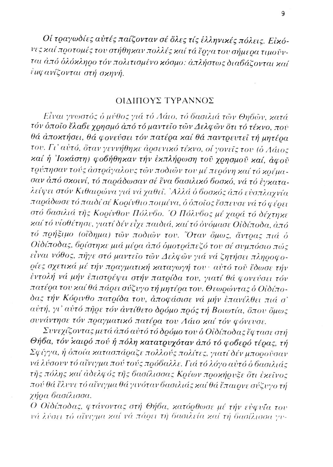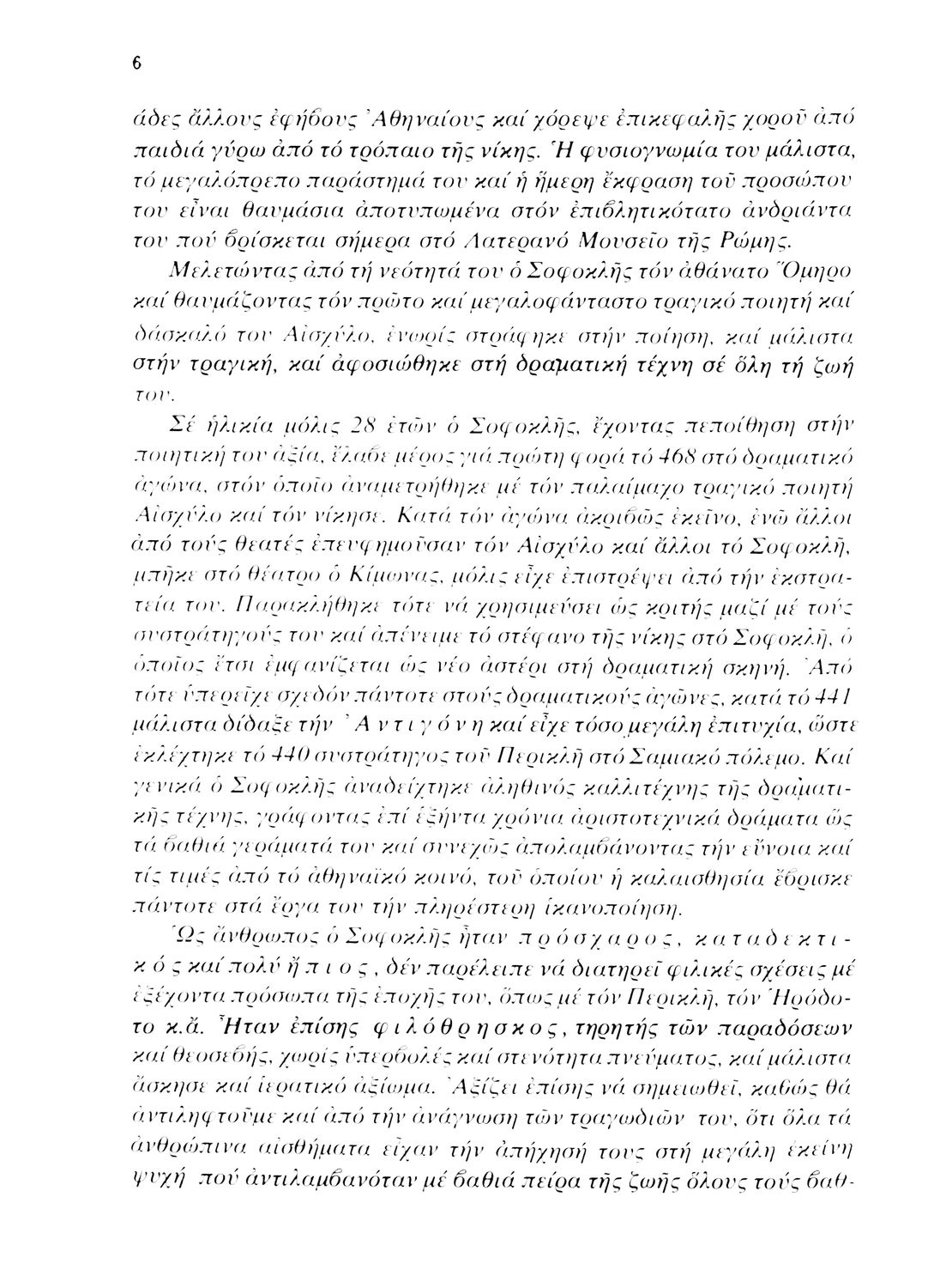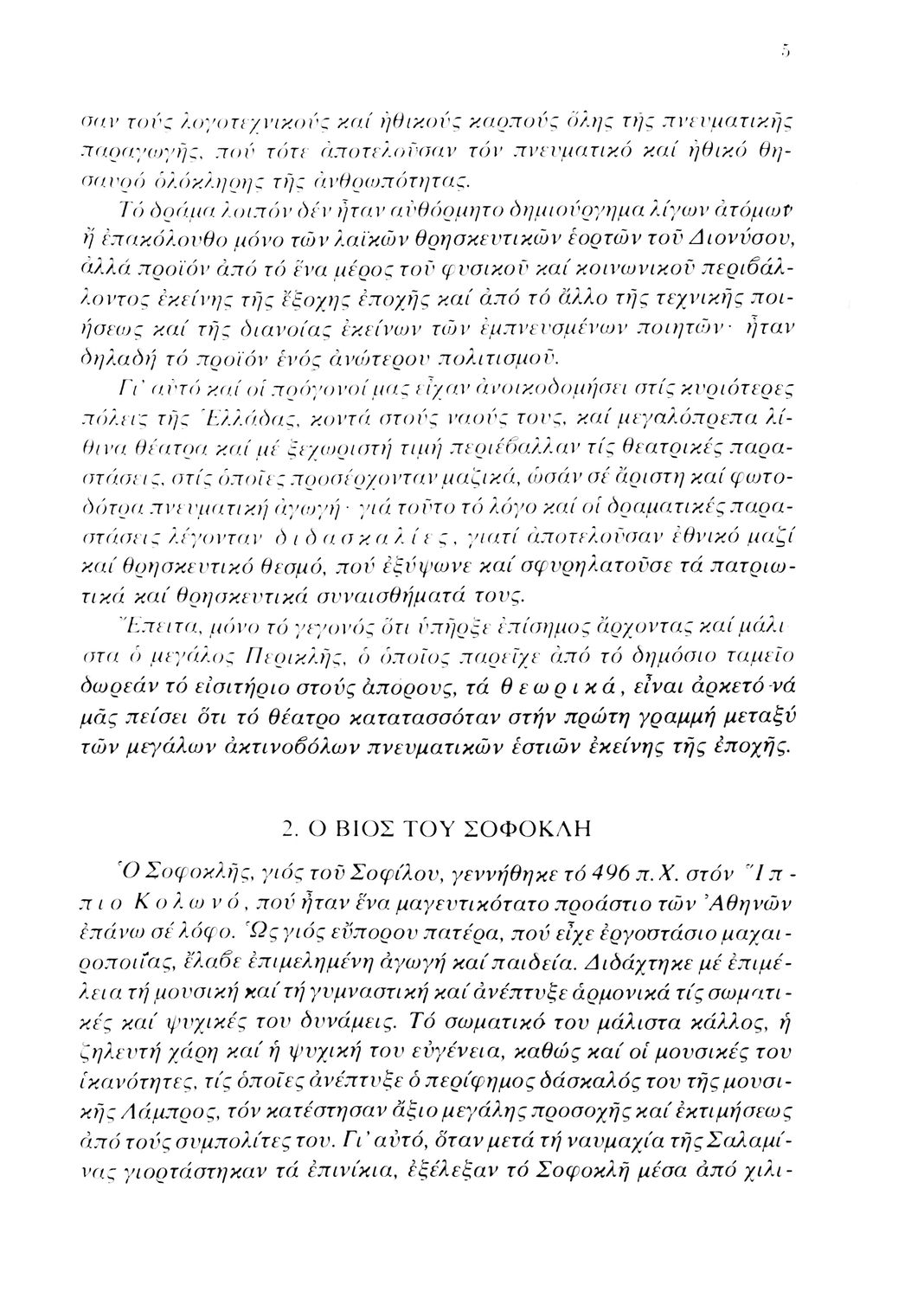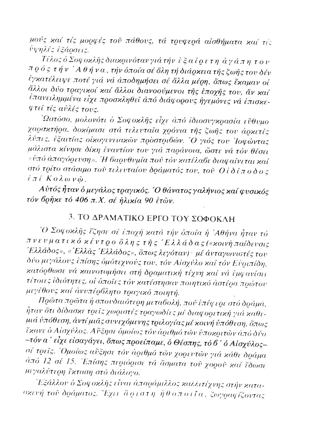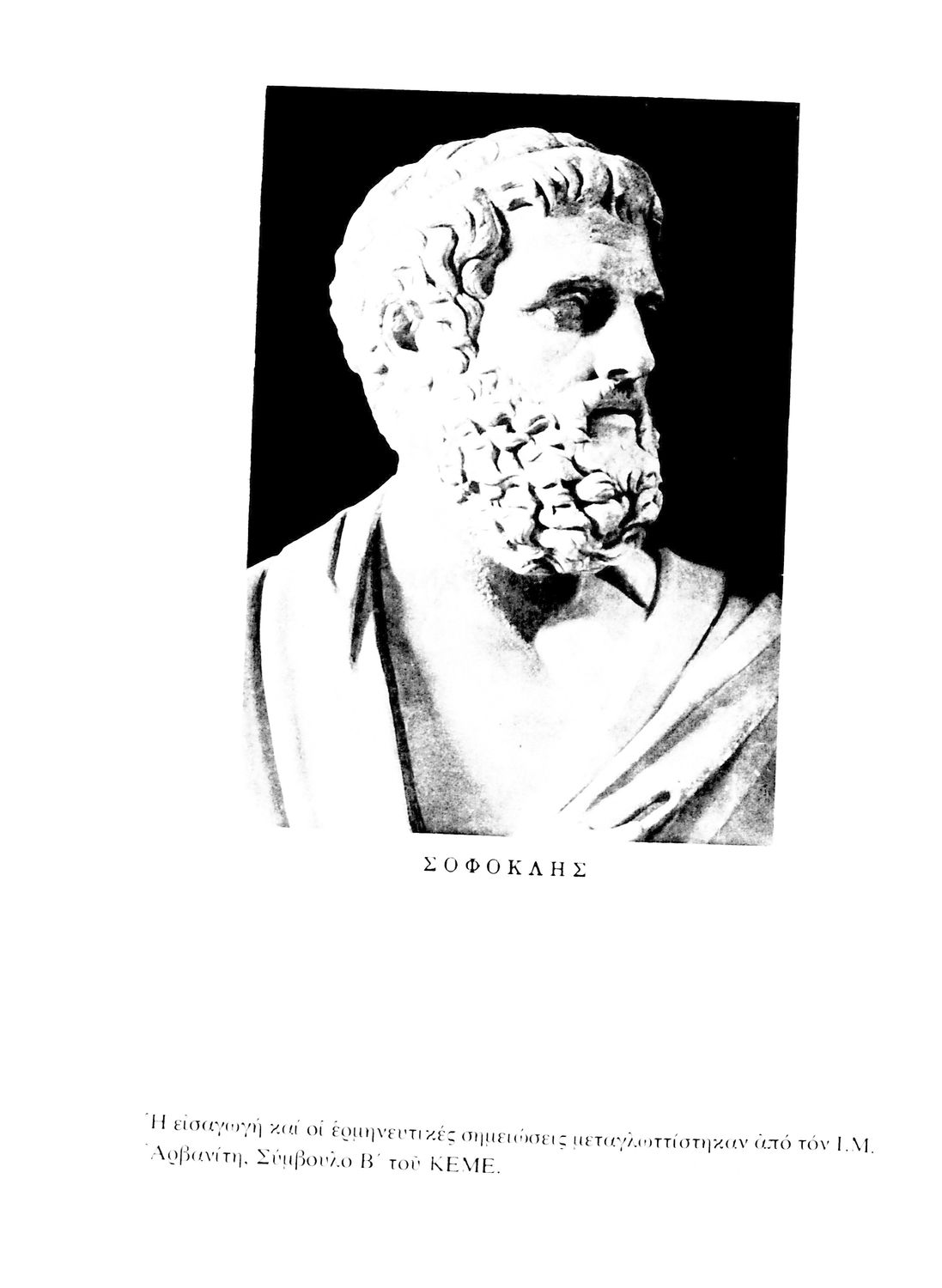 Σχολικό εγχειρίδιο Αρχαίων Ελληνικών για τη Γ΄ Λυκείου με πρωτότυπο κείμενο του Σοφοκλή. Το βιβλίο περιλαμβάνει εισαγωγή και ερμηνευτικές σημειώσεις στη Δημοτική. Σχόλια μαθητή στα περιθώρια.