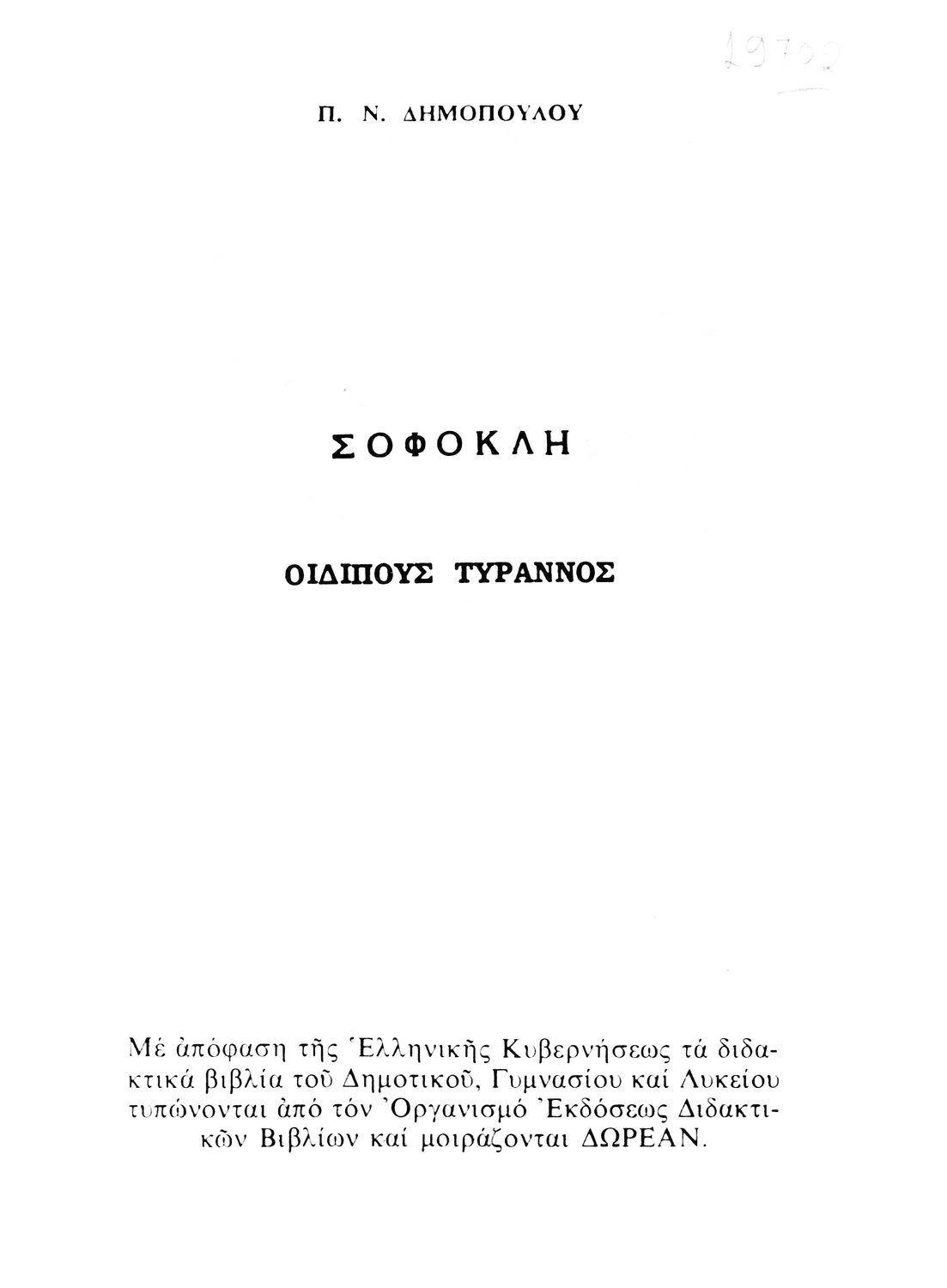 Βαθμίδα εκπαίδευσης: Δευτεροβάθμια Τάξη: Γ' Λυκείου Μάθημα: Αρχαία Ελληνικά Γλώσσα: Δημοτική Παρουσίαση περιεχομένου: Σχολικό εγχειρίδιο Αρχαίων Ελληνικών για τη Γ΄ Λυκείου με πρωτότυπο κείμενο του Σοφοκλή. Το βιβλίο περιλαμβάνει εισαγωγή και ερμηνευτικές σημειώσεις στη Δημοτική. Σχόλια μαθητή στα περιθώρια. |