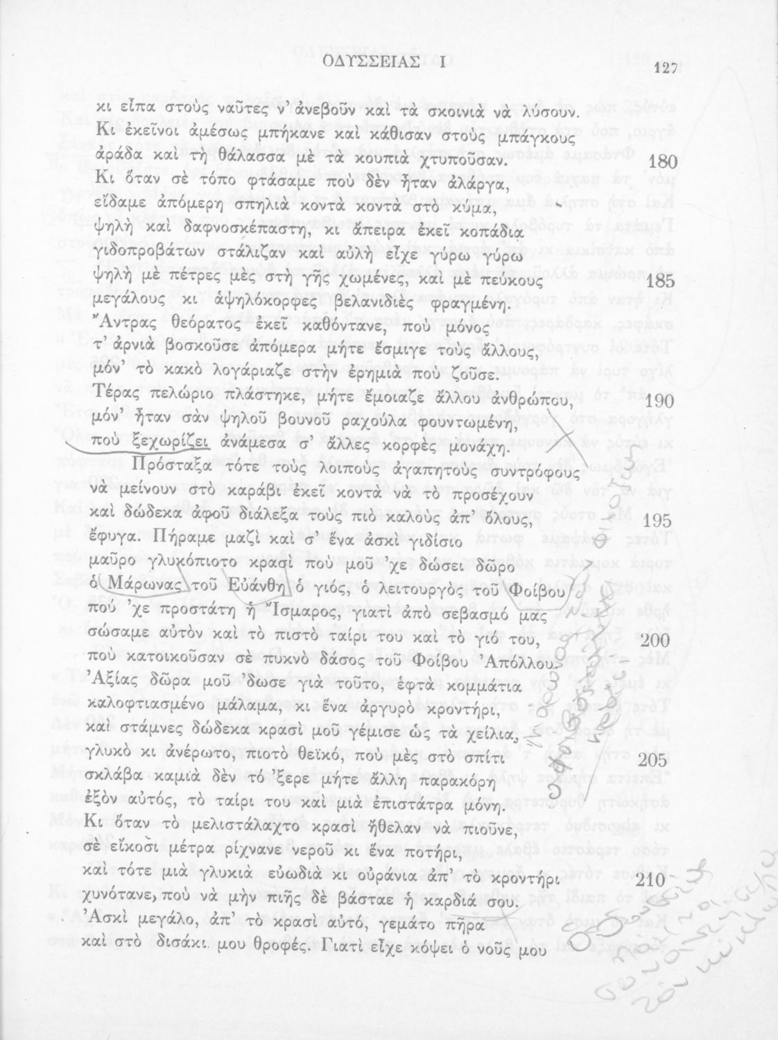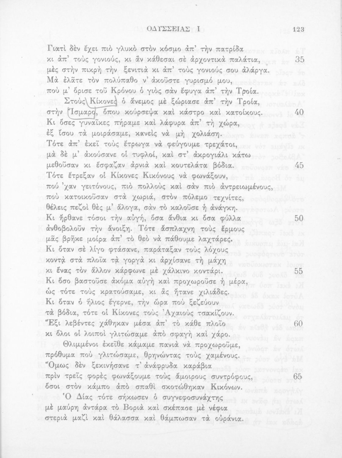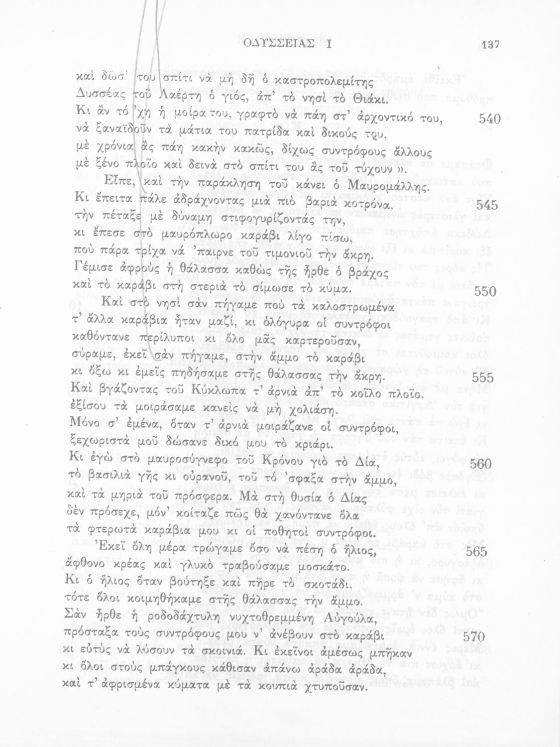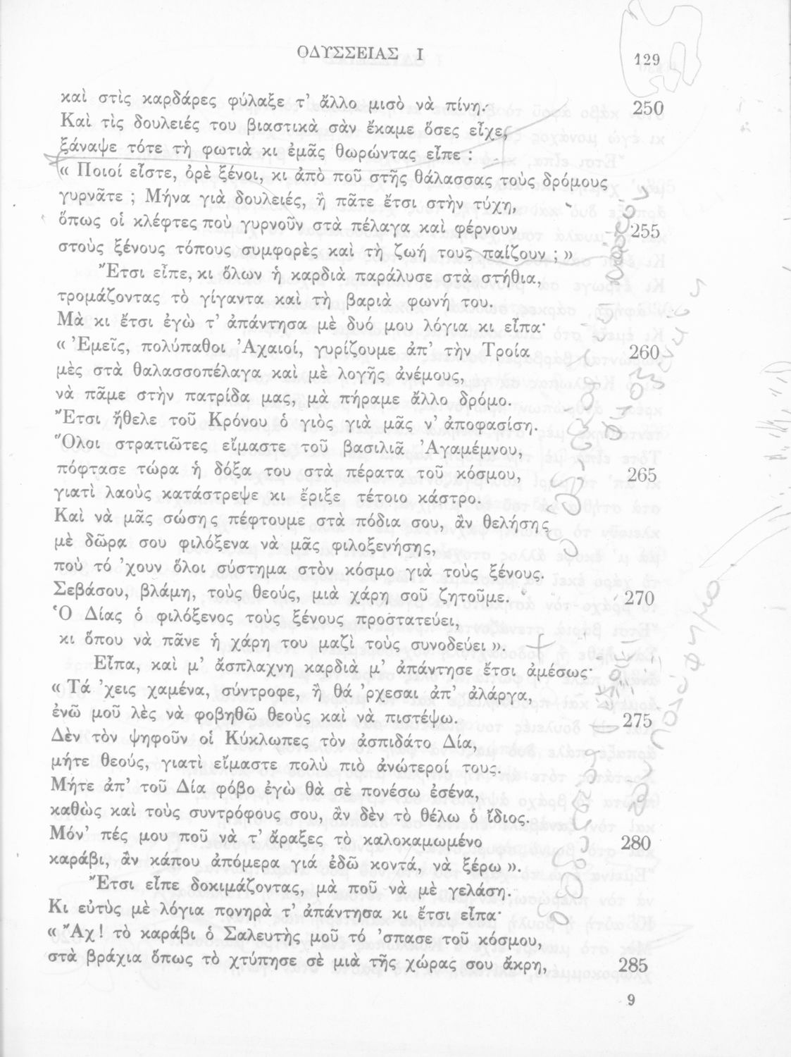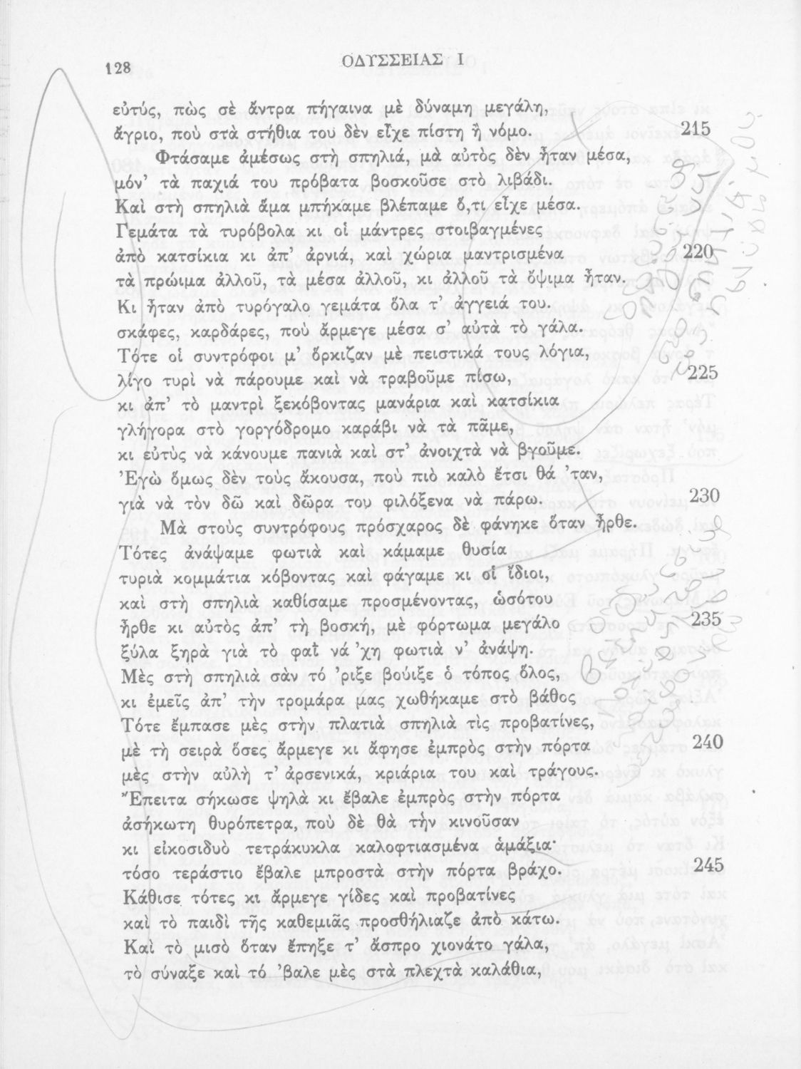 Σχολικό εγχειρίδιο Αρχαίων Ελληνικών. Πρόκειται για "ανάτυπον εμμέτρου μεταφράσεως εκ της σειράς τω ν227 τόμων ΑΡΧΑΙΩΝ ΕΛΛΗΝΩΝ ΣΥΓΓΡΑΦΕΩΝ ιδιοκτησίας του Εκδοτικού Οίκου Ιωάννου Ν. Ζαχαρόπουλου". Το βιβλίο περιλαμβάνει το έπος της Οδύσσειας σε μετάφραση του Ζήσιμου Σιδέρη. Ακολουθεί ενδεικτικό Λεξιλόγιο.