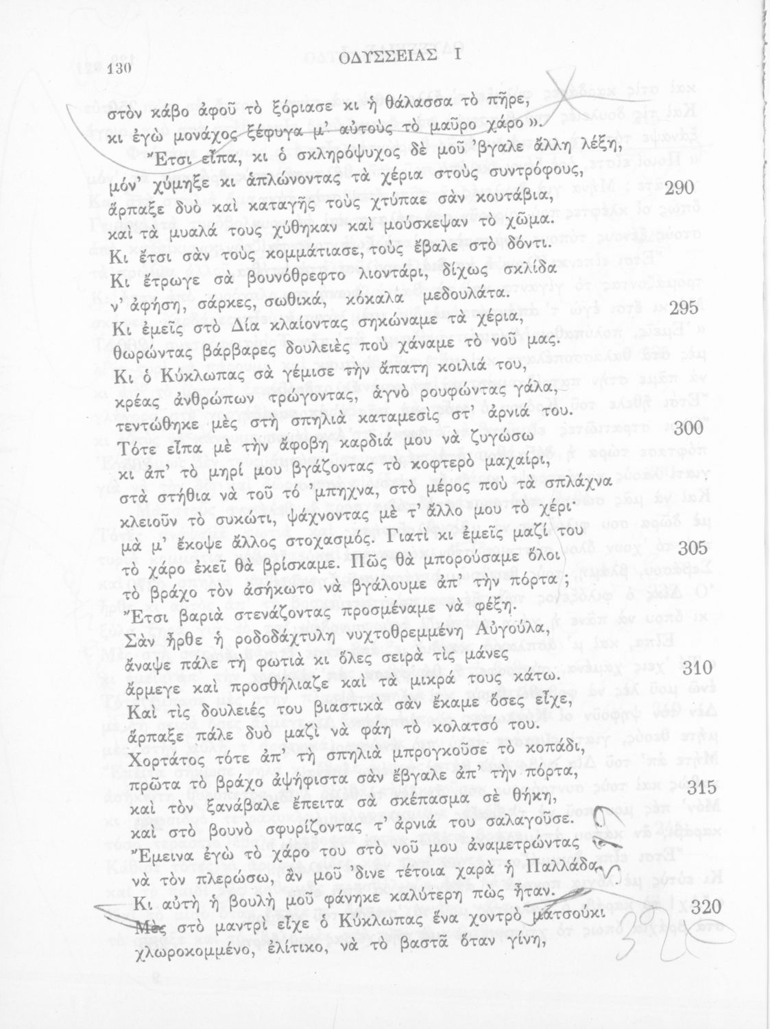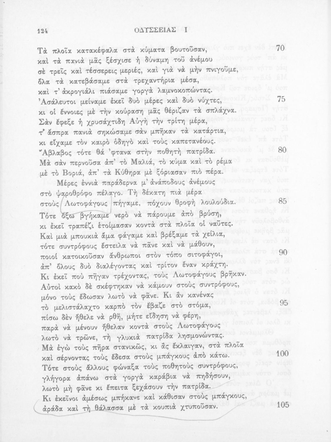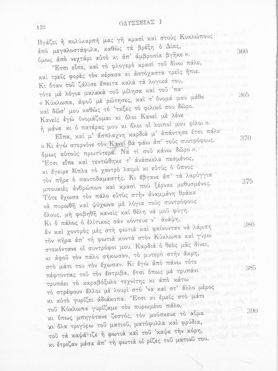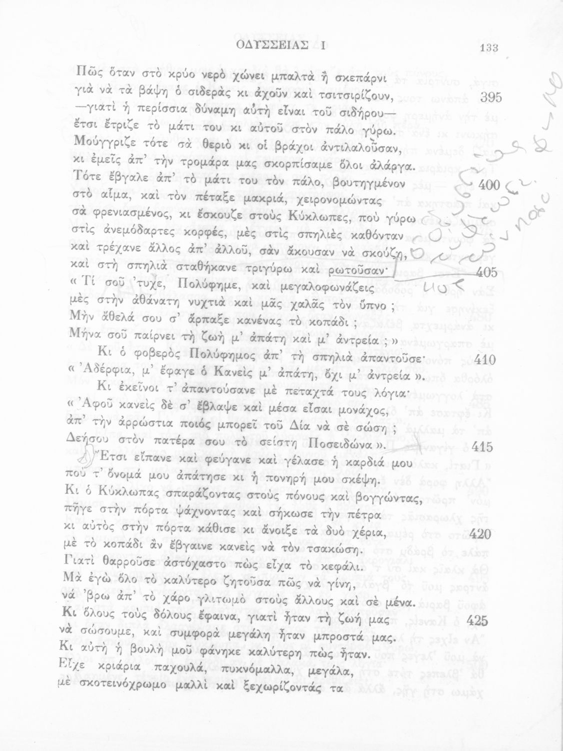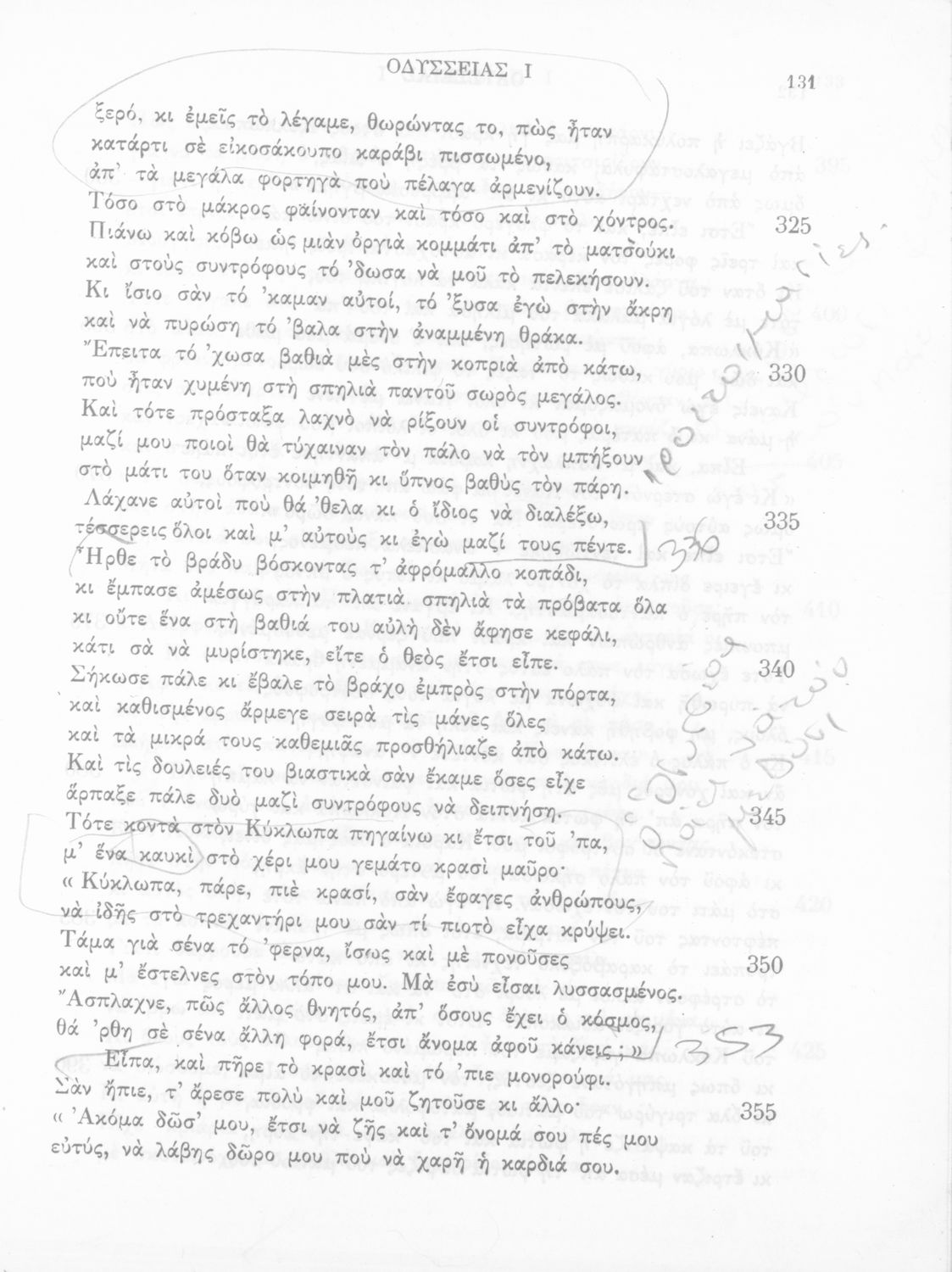 Σχολικό εγχειρίδιο του Γυμνασίου για το μάθημα των Αρχαίων Ελληνικών. Πρόκειται για το κείμενο της Οδύσσειας μεταφρασμένο στο τέλος περιλαμβάνει λεξιλόγιο.