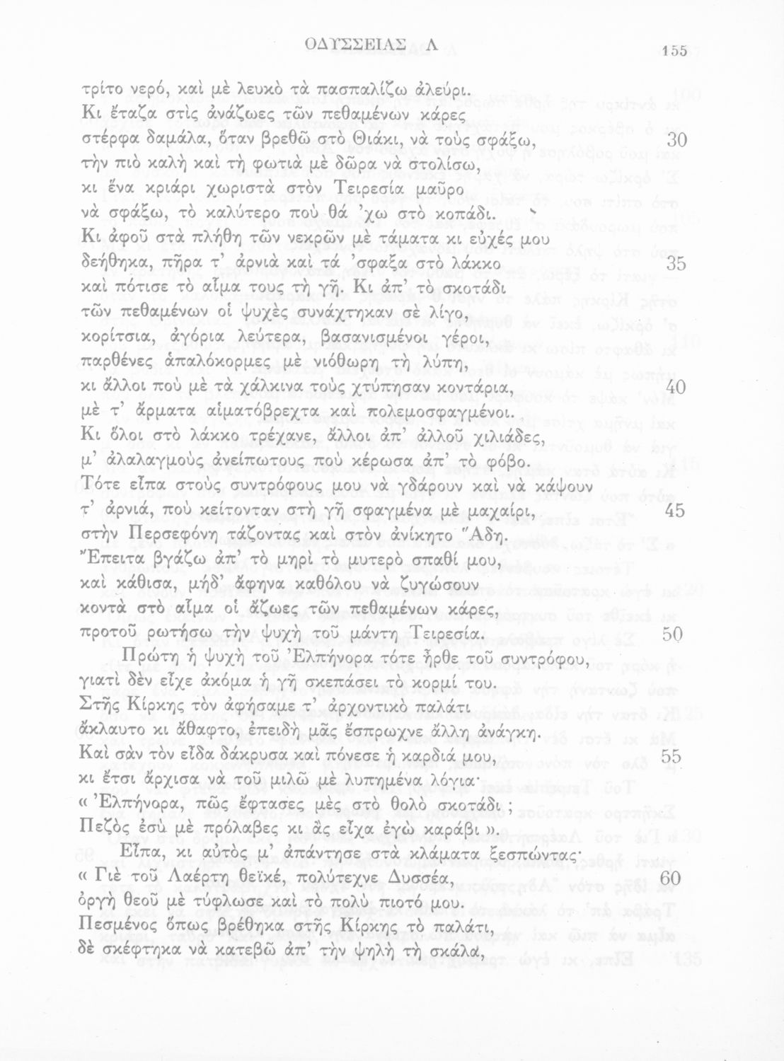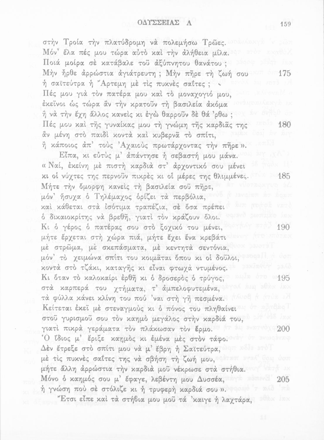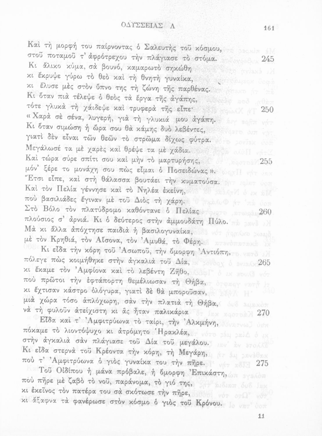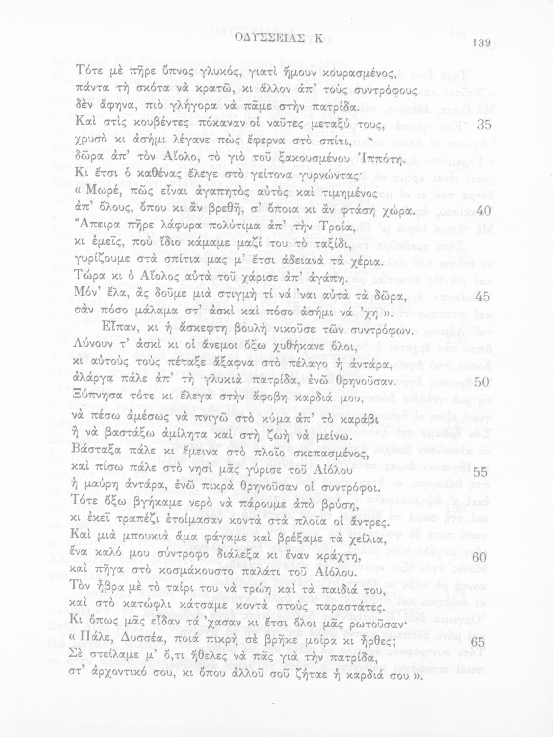 Σχολικό εγχειρίδιο Αρχαίων Ελληνικών. Πρόκειται για "ανάτυπον εμμέτρου μεταφράσεως εκ της σειράς τω ν227 τόμων ΑΡΧΑΙΩΝ ΕΛΛΗΝΩΝ ΣΥΓΓΡΑΦΕΩΝ ιδιοκτησίας του Εκδοτικού Οίκου Ιωάννου Ν. Ζαχαρόπουλου". Το βιβλίο περιλαμβάνει το έπος της Οδύσσειας σε μετάφραση του Ζήσιμου Σιδέρη. Ακολουθεί ενδεικτικό Λεξιλόγιο.