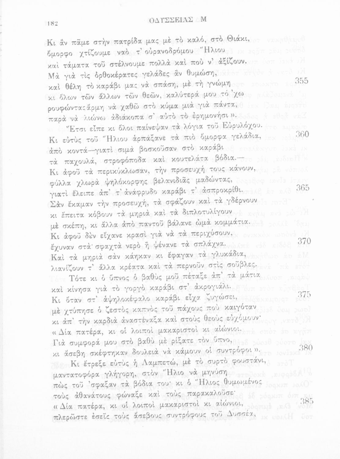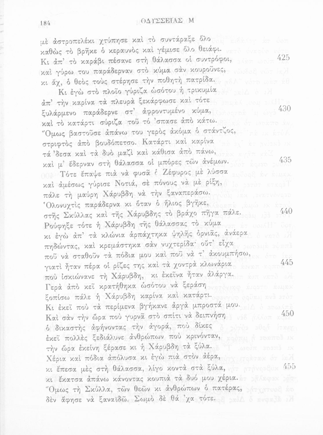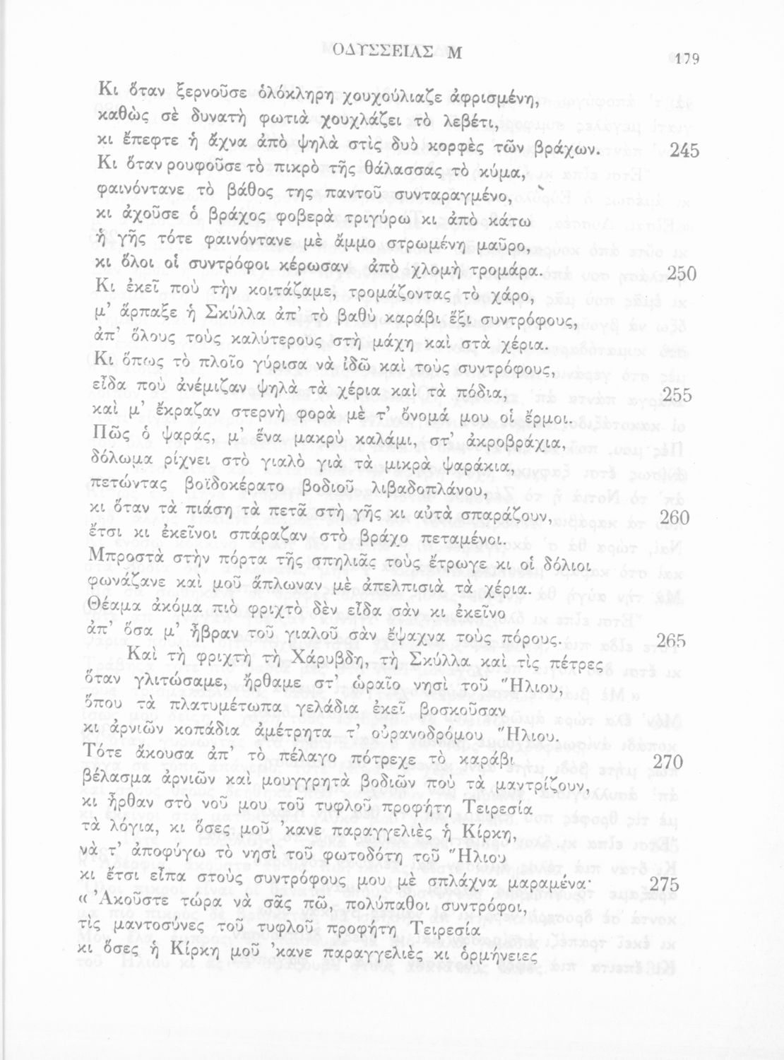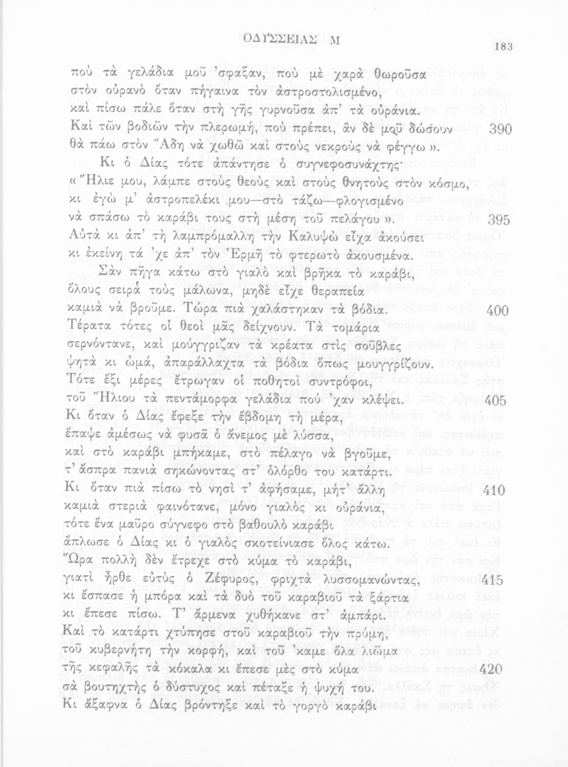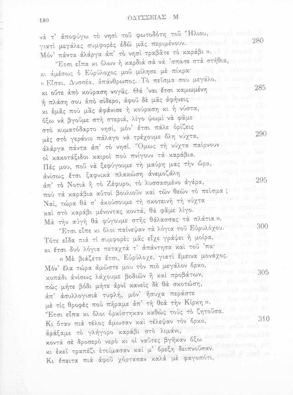 Σχολικό εγχειρίδιο Αρχαίων Ελληνικών. Πρόκειται για "ανάτυπον εμμέτρου μεταφράσεως εκ της σειράς τω ν227 τόμων ΑΡΧΑΙΩΝ ΕΛΛΗΝΩΝ ΣΥΓΓΡΑΦΕΩΝ ιδιοκτησίας του Εκδοτικού Οίκου Ιωάννου Ν. Ζαχαρόπουλου". Το βιβλίο περιλαμβάνει το έπος της Οδύσσειας σε μετάφραση του Ζήσιμου Σιδέρη. Ακολουθεί ενδεικτικό Λεξιλόγιο.