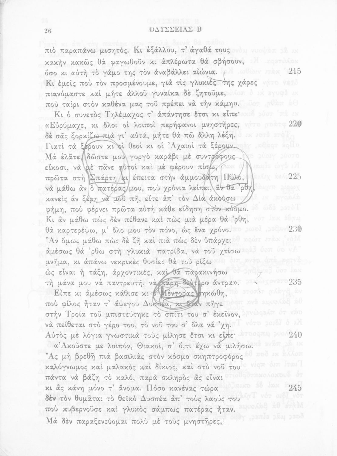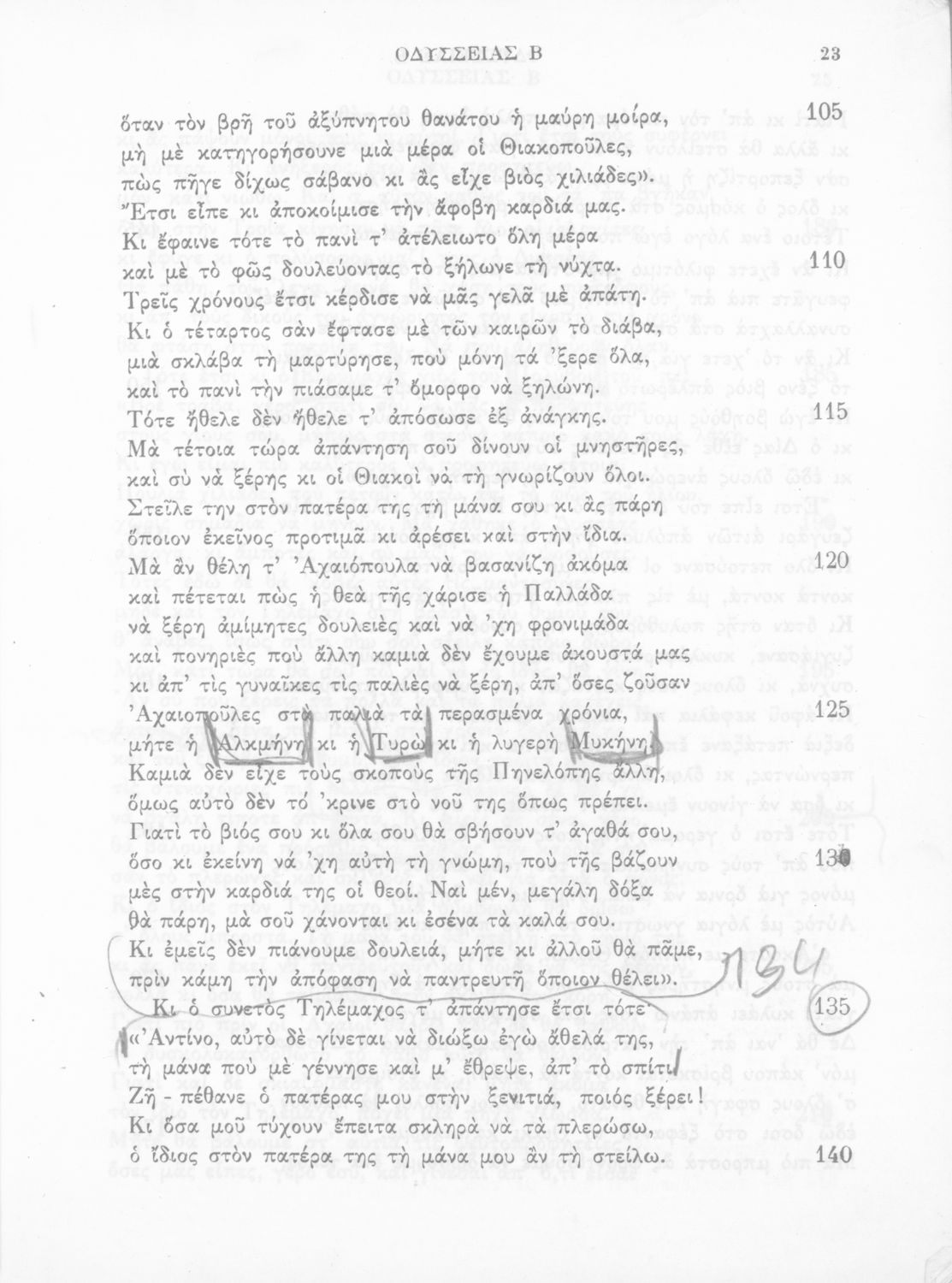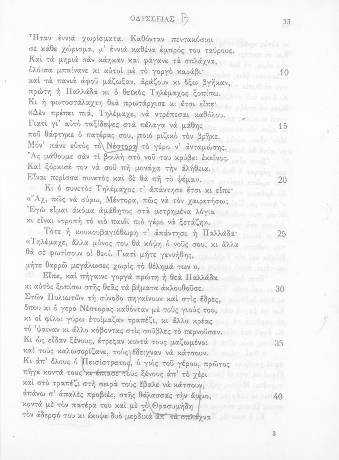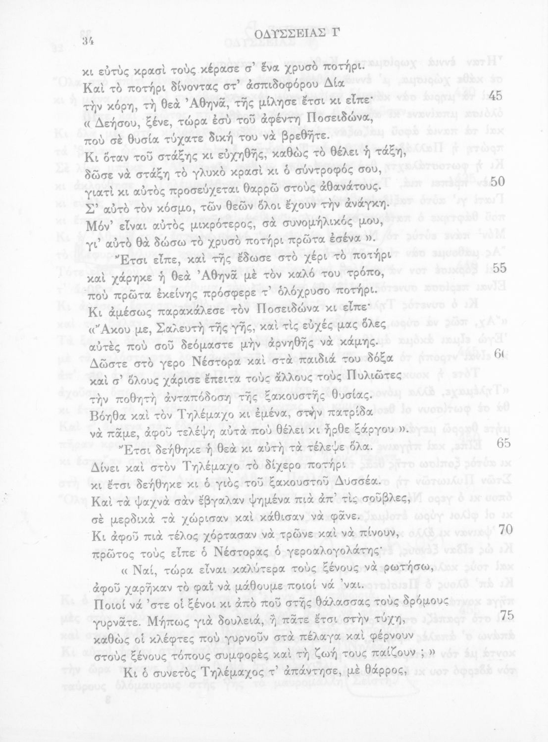 Σχολικό εγχειρίδιο Αρχαίων Ελληνικών. Πρόκειται για "ανάτυπον εμμέτρου μεταφράσεως εκ της σειράς τω ν227 τόμων ΑΡΧΑΙΩΝ ΕΛΛΗΝΩΝ ΣΥΓΓΡΑΦΕΩΝ ιδιοκτησίας του Εκδοτικού Οίκου Ιωάννου Ν. Ζαχαρόπουλου". Το βιβλίο περιλαμβάνει το έπος της Οδύσσειας σε μετάφραση του Ζήσιμου Σιδέρη. Ακολουθεί ενδεικτικό Λεξιλόγιο.