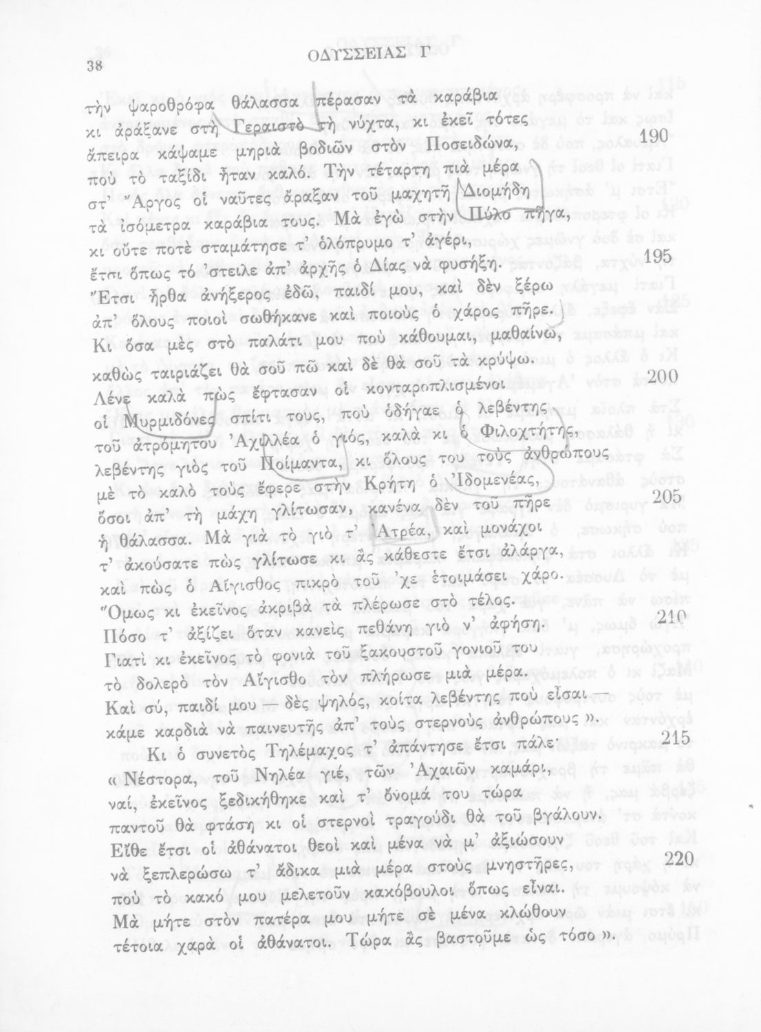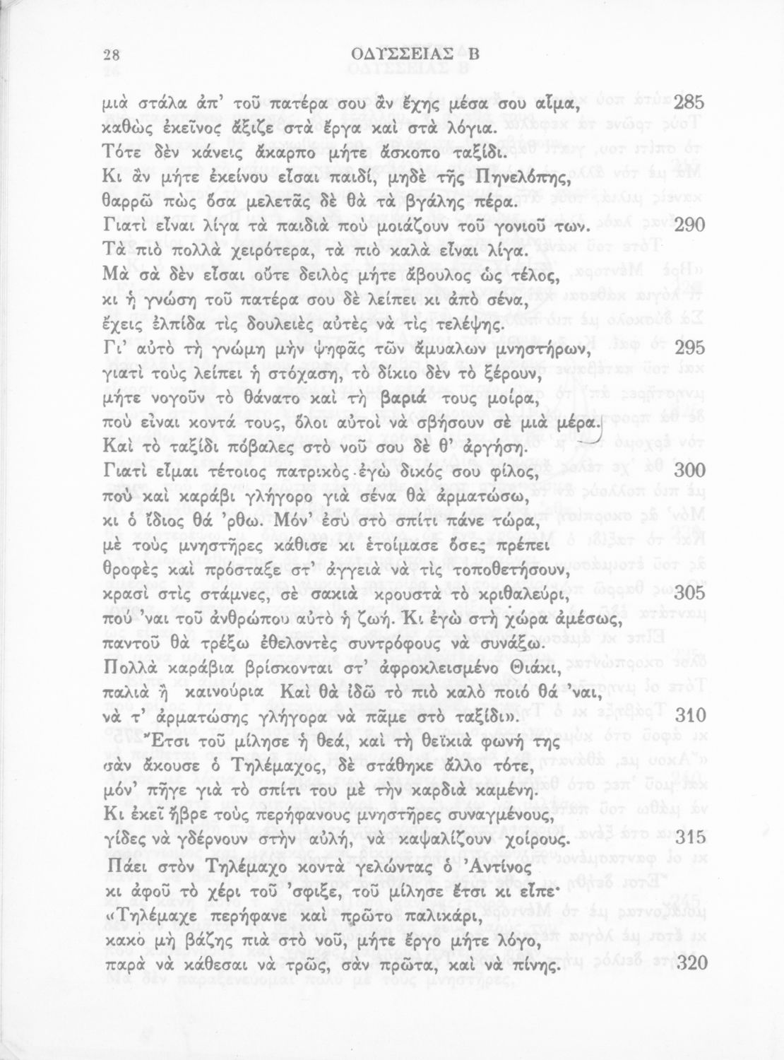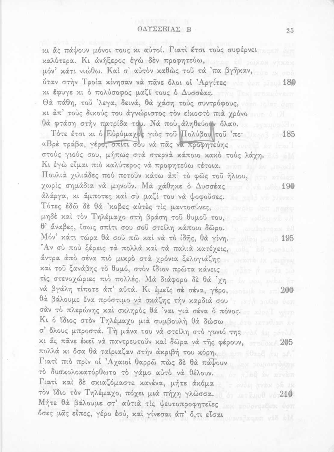 Σχολικό εγχειρίδιο Αρχαίων Ελληνικών. Πρόκειται για "ανάτυπον εμμέτρου μεταφράσεως εκ της σειράς τω ν227 τόμων ΑΡΧΑΙΩΝ ΕΛΛΗΝΩΝ ΣΥΓΓΡΑΦΕΩΝ ιδιοκτησίας του Εκδοτικού Οίκου Ιωάννου Ν. Ζαχαρόπουλου". Το βιβλίο περιλαμβάνει το έπος της Οδύσσειας σε μετάφραση του Ζήσιμου Σιδέρη. Ακολουθεί ενδεικτικό Λεξιλόγιο.
