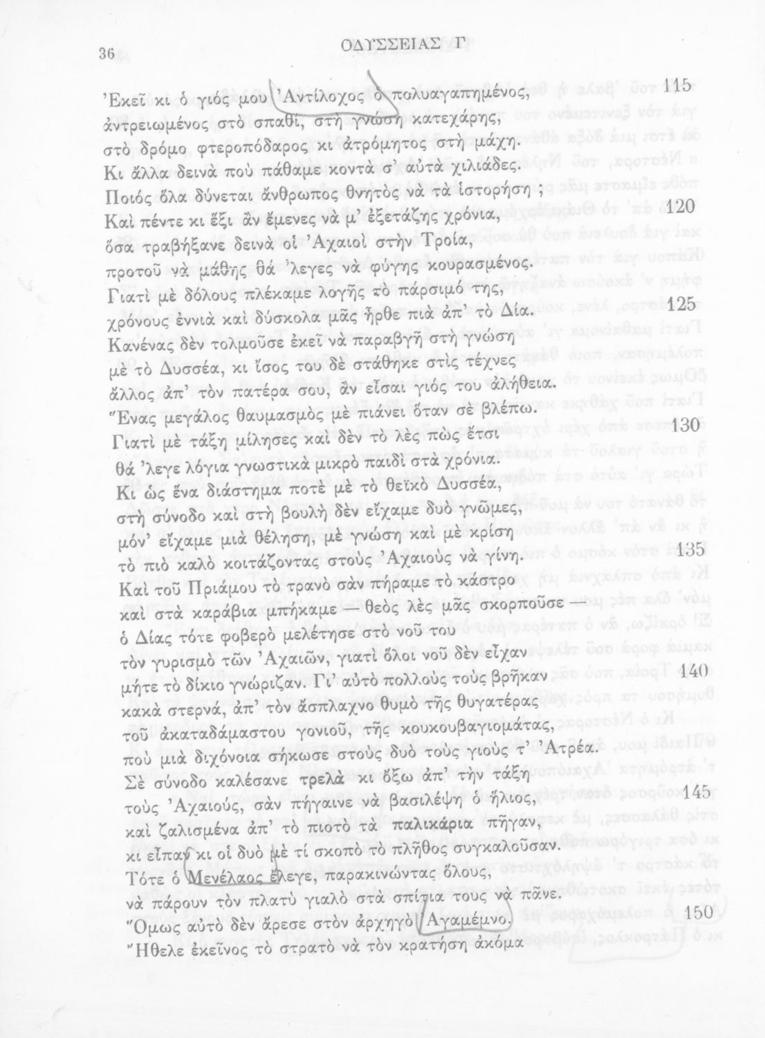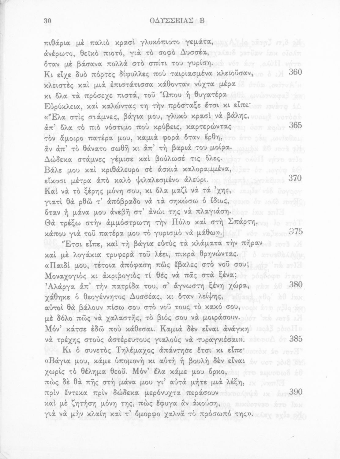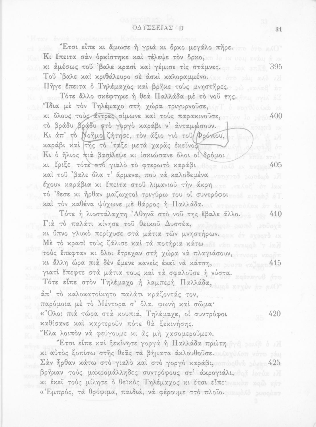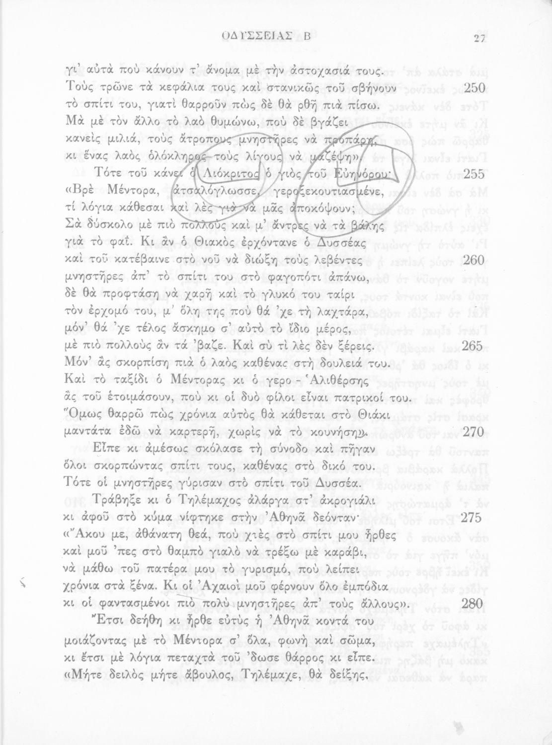 Σχολικό εγχειρίδιο Αρχαίων Ελληνικών. Πρόκειται για "ανάτυπον εμμέτρου μεταφράσεως εκ της σειράς τω ν227 τόμων ΑΡΧΑΙΩΝ ΕΛΛΗΝΩΝ ΣΥΓΓΡΑΦΕΩΝ ιδιοκτησίας του Εκδοτικού Οίκου Ιωάννου Ν. Ζαχαρόπουλου". Το βιβλίο περιλαμβάνει το έπος της Οδύσσειας σε μετάφραση του Ζήσιμου Σιδέρη. Ακολουθεί ενδεικτικό Λεξιλόγιο.