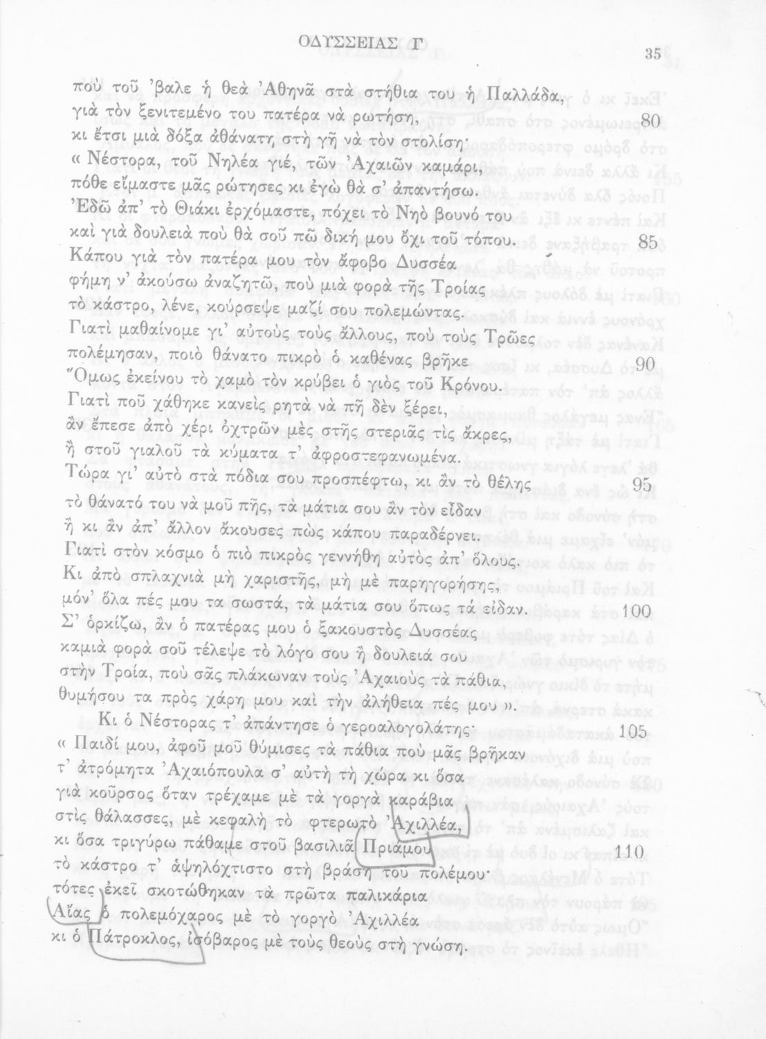 Σχολικό εγχειρίδιο του Γυμνασίου για το μάθημα των Αρχαίων Ελληνικών. Πρόκειται για το κείμενο της Οδύσσειας μεταφρασμένο στο τέλος περιλαμβάνει λεξιλόγιο.