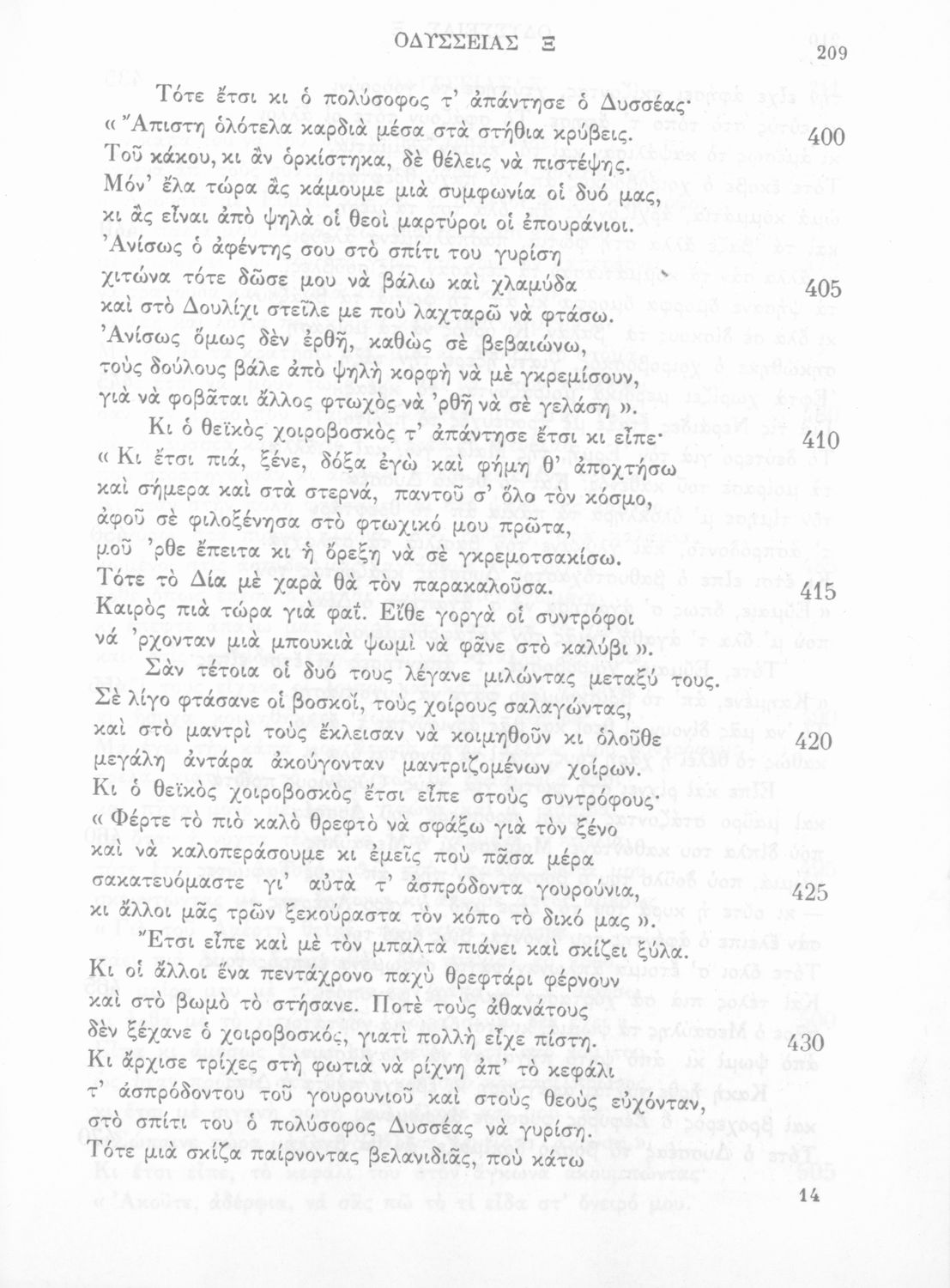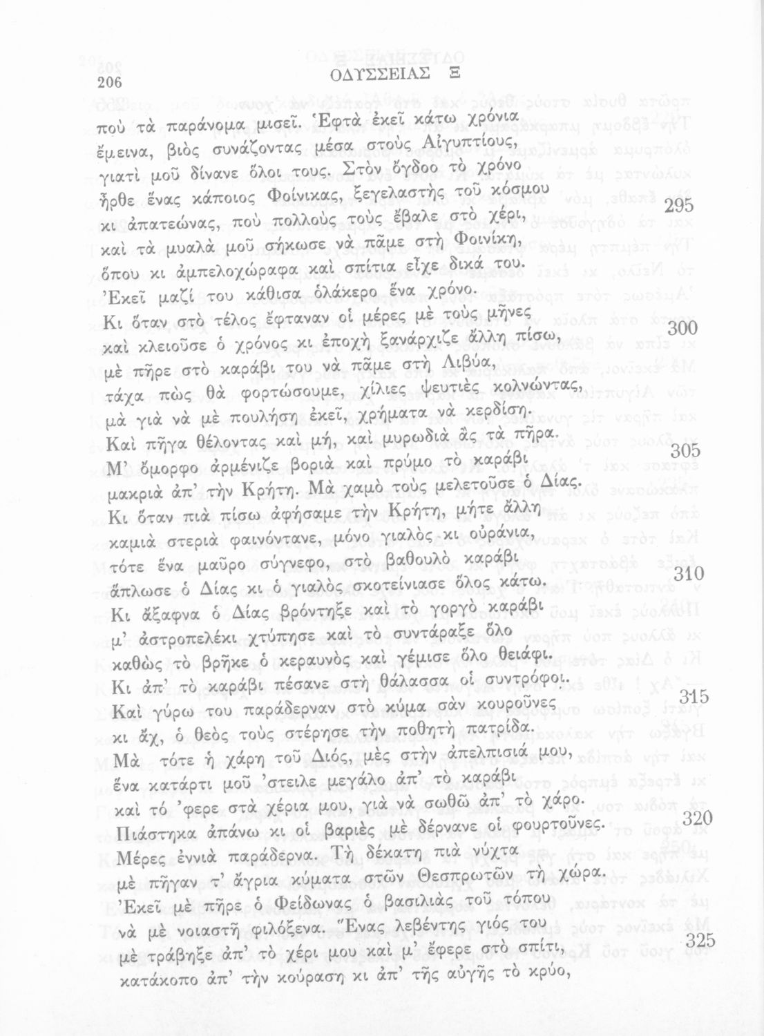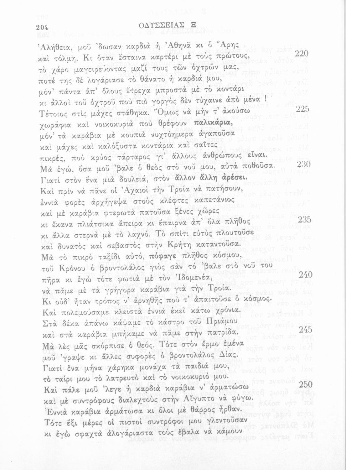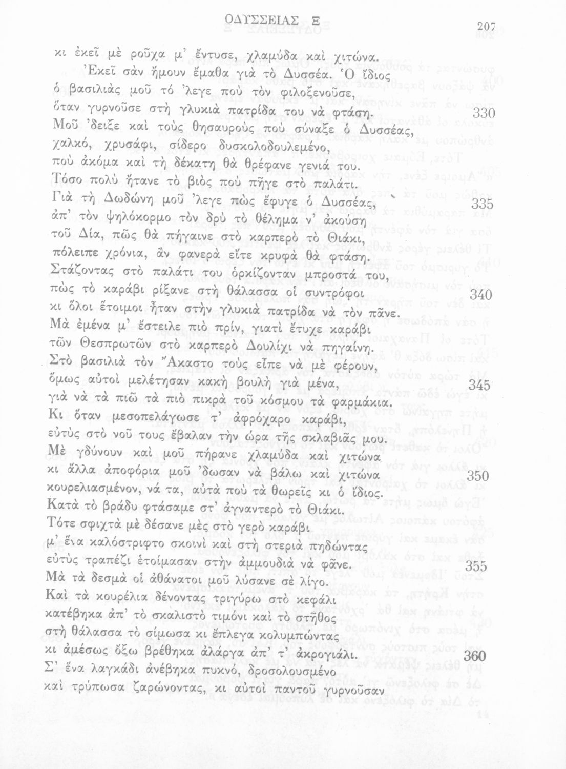 Σχολικό εγχειρίδιο Αρχαίων Ελληνικών. Πρόκειται για "ανάτυπον εμμέτρου μεταφράσεως εκ της σειράς τω ν227 τόμων ΑΡΧΑΙΩΝ ΕΛΛΗΝΩΝ ΣΥΓΓΡΑΦΕΩΝ ιδιοκτησίας του Εκδοτικού Οίκου Ιωάννου Ν. Ζαχαρόπουλου". Το βιβλίο περιλαμβάνει το έπος της Οδύσσειας σε μετάφραση του Ζήσιμου Σιδέρη. Ακολουθεί ενδεικτικό Λεξιλόγιο.