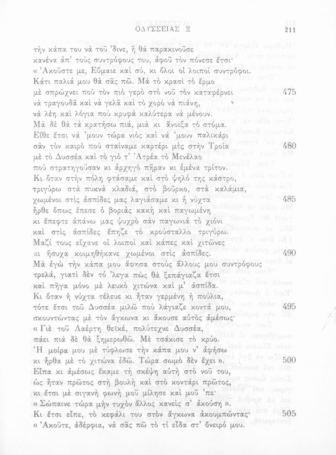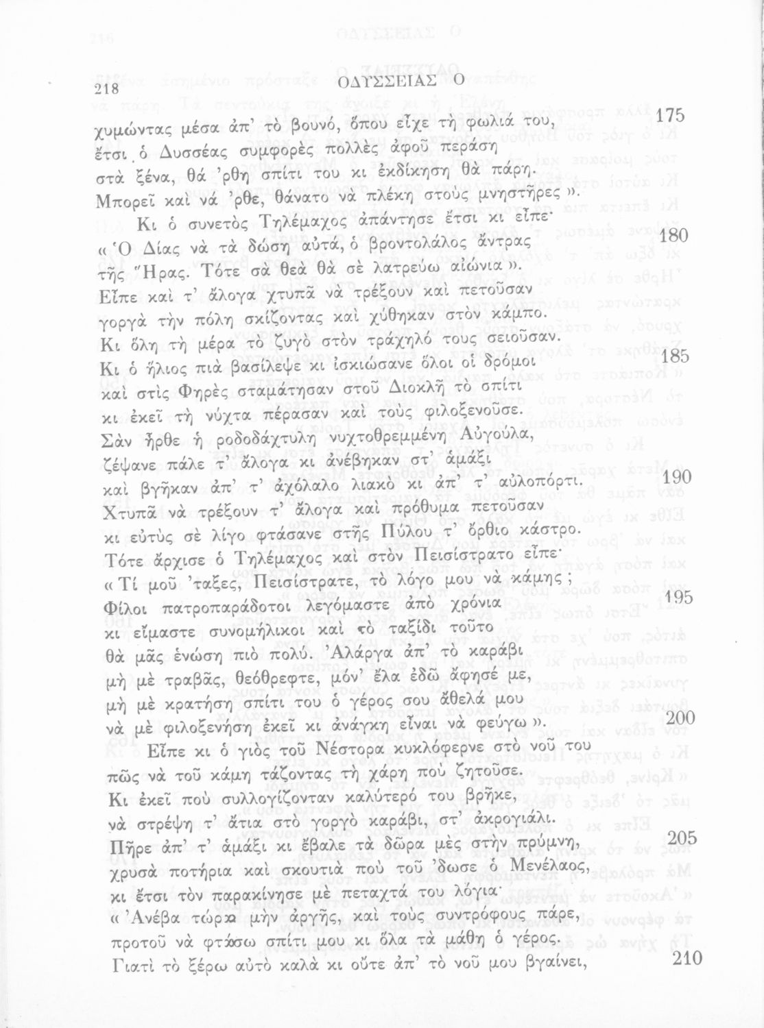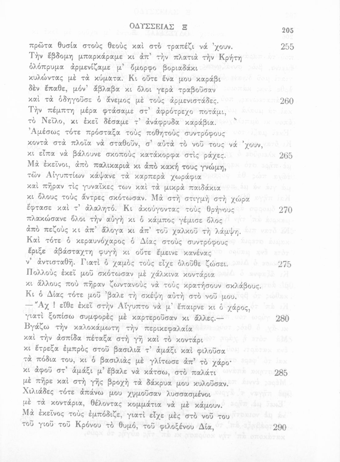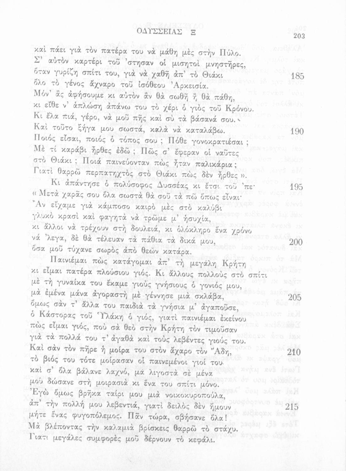 Σχολικό εγχειρίδιο Αρχαίων Ελληνικών. Πρόκειται για "ανάτυπον εμμέτρου μεταφράσεως εκ της σειράς τω ν227 τόμων ΑΡΧΑΙΩΝ ΕΛΛΗΝΩΝ ΣΥΓΓΡΑΦΕΩΝ ιδιοκτησίας του Εκδοτικού Οίκου Ιωάννου Ν. Ζαχαρόπουλου". Το βιβλίο περιλαμβάνει το έπος της Οδύσσειας σε μετάφραση του Ζήσιμου Σιδέρη. Ακολουθεί ενδεικτικό Λεξιλόγιο.