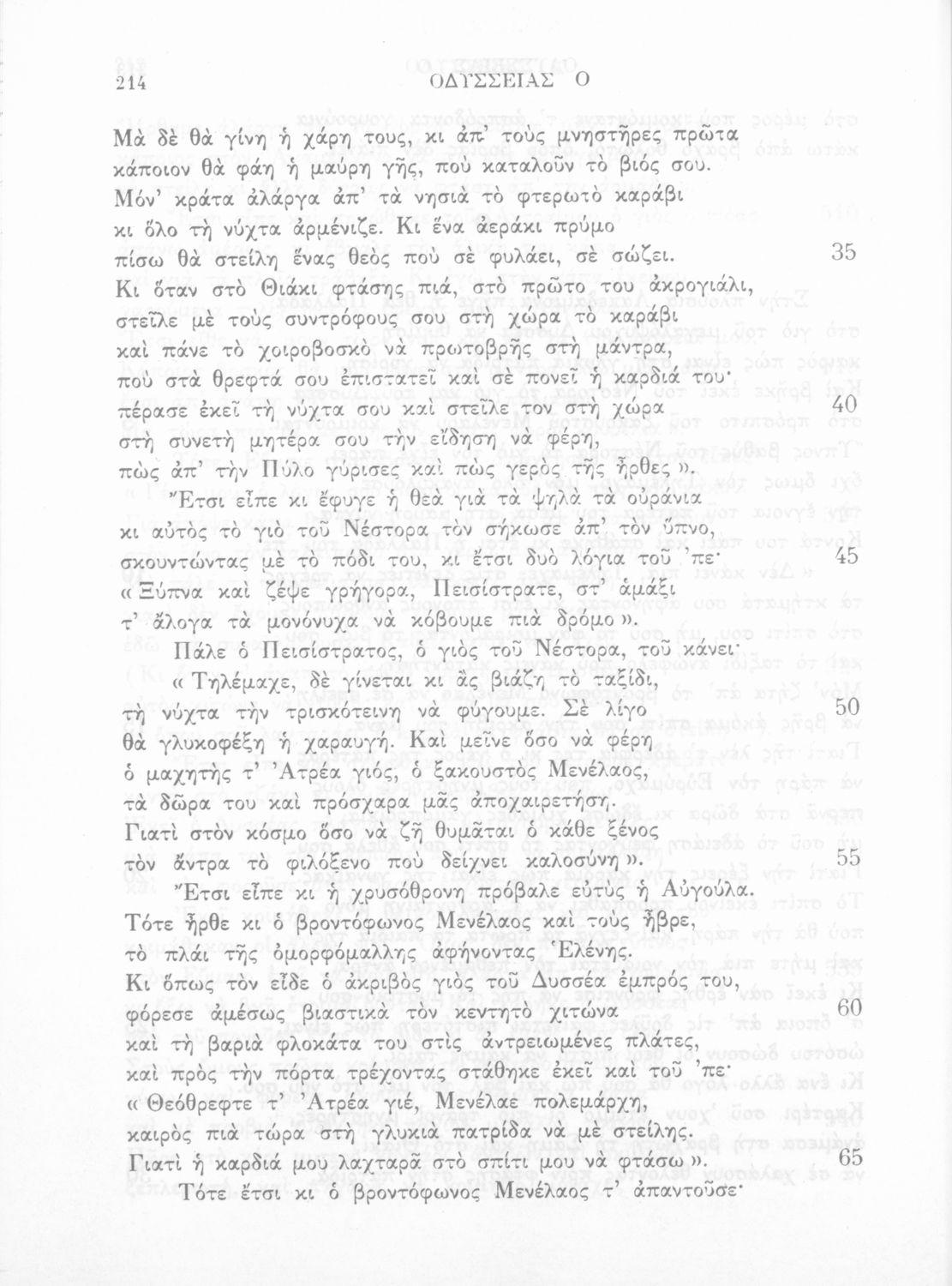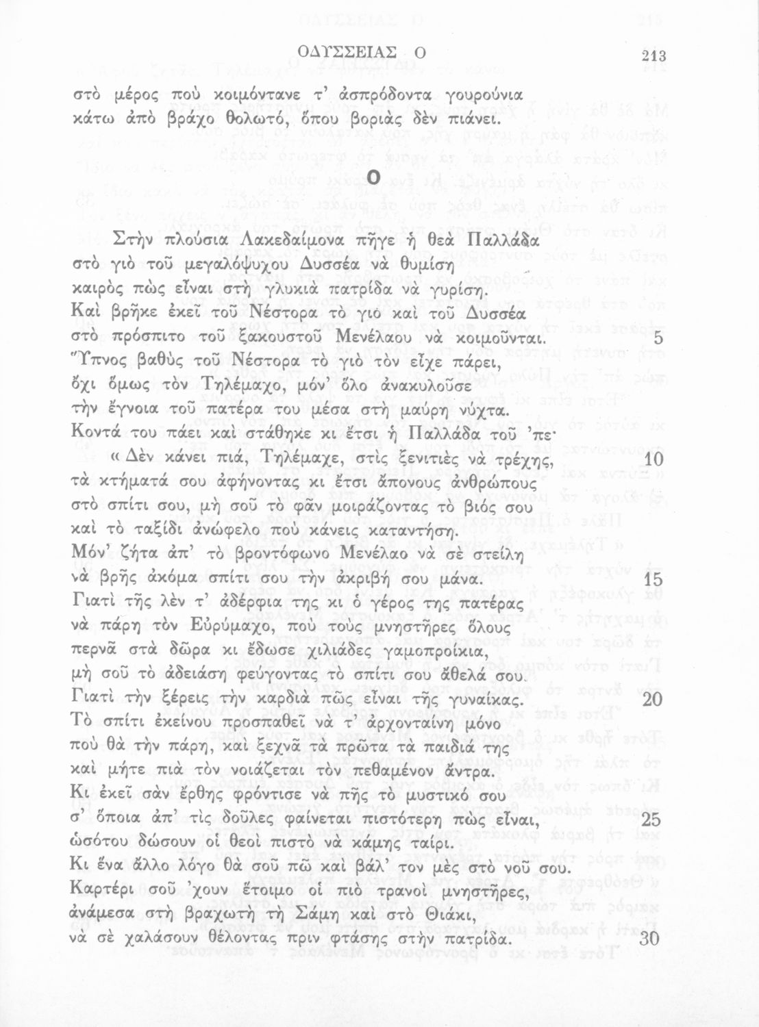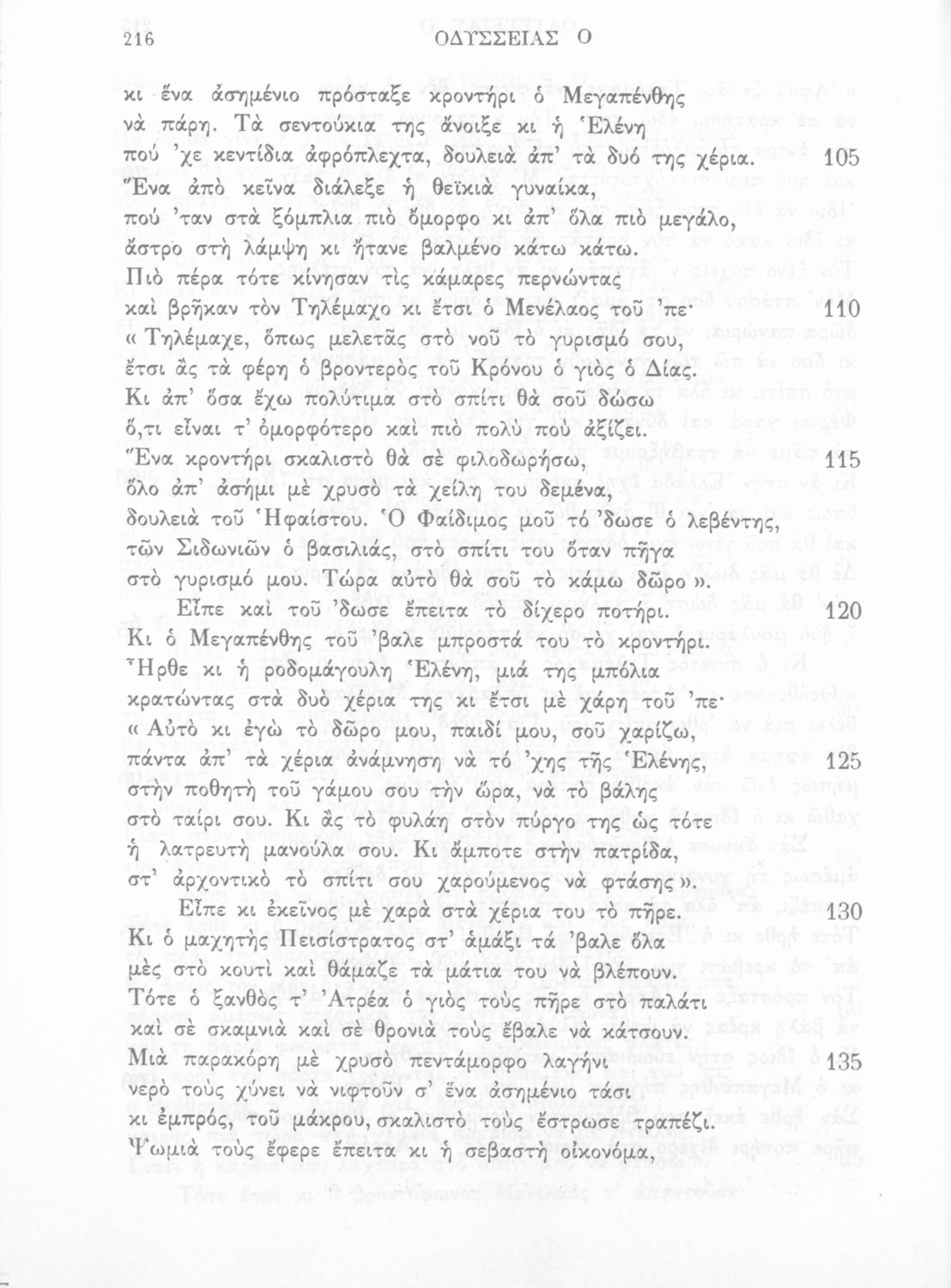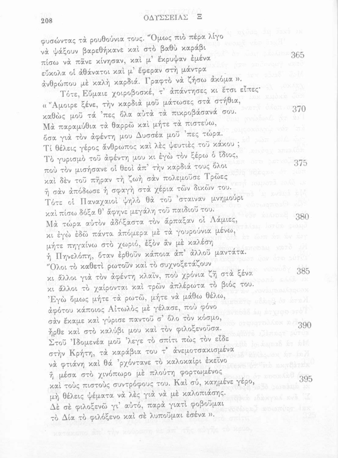 Σχολικό εγχειρίδιο Αρχαίων Ελληνικών. Πρόκειται για "ανάτυπον εμμέτρου μεταφράσεως εκ της σειράς τω ν227 τόμων ΑΡΧΑΙΩΝ ΕΛΛΗΝΩΝ ΣΥΓΓΡΑΦΕΩΝ ιδιοκτησίας του Εκδοτικού Οίκου Ιωάννου Ν. Ζαχαρόπουλου". Το βιβλίο περιλαμβάνει το έπος της Οδύσσειας σε μετάφραση του Ζήσιμου Σιδέρη. Ακολουθεί ενδεικτικό Λεξιλόγιο.