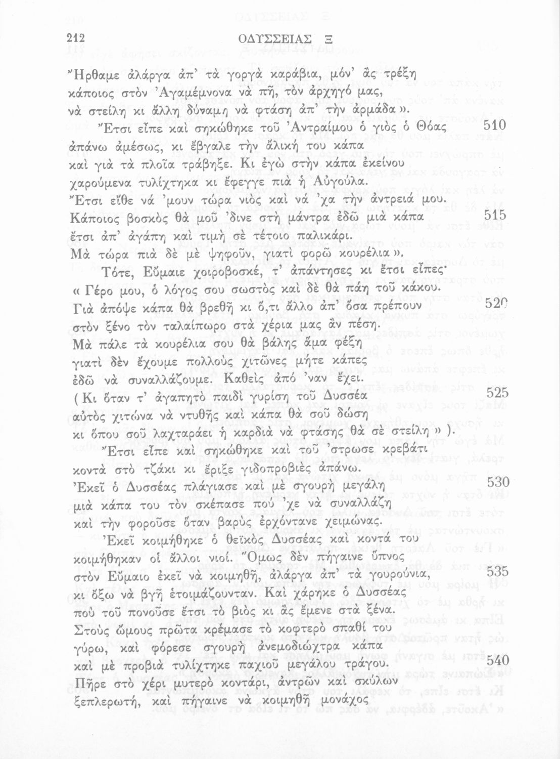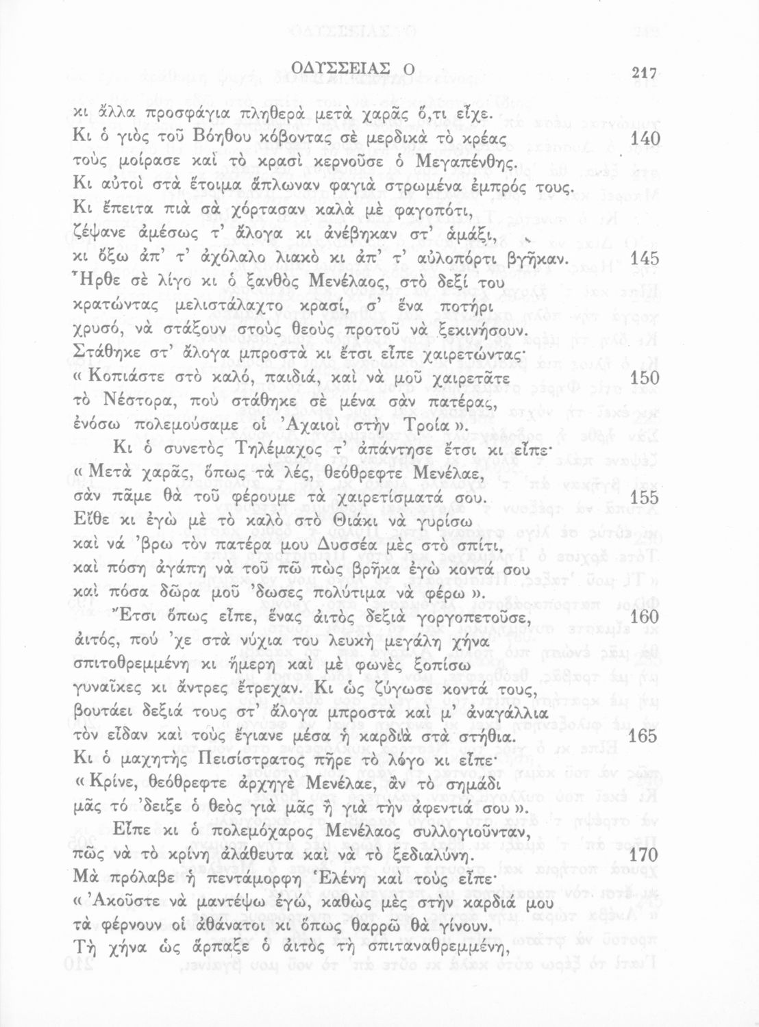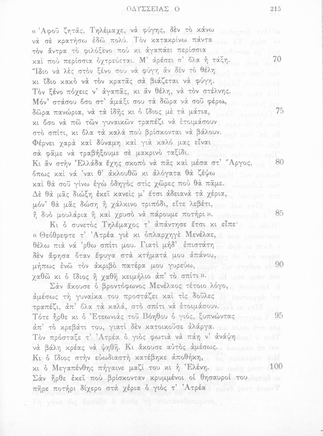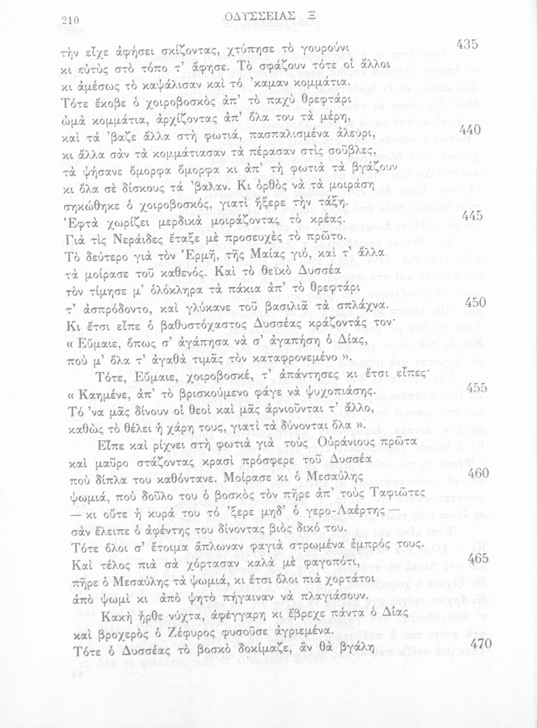 Σχολικό εγχειρίδιο Αρχαίων Ελληνικών. Πρόκειται για "ανάτυπον εμμέτρου μεταφράσεως εκ της σειράς τω ν227 τόμων ΑΡΧΑΙΩΝ ΕΛΛΗΝΩΝ ΣΥΓΓΡΑΦΕΩΝ ιδιοκτησίας του Εκδοτικού Οίκου Ιωάννου Ν. Ζαχαρόπουλου". Το βιβλίο περιλαμβάνει το έπος της Οδύσσειας σε μετάφραση του Ζήσιμου Σιδέρη. Ακολουθεί ενδεικτικό Λεξιλόγιο.