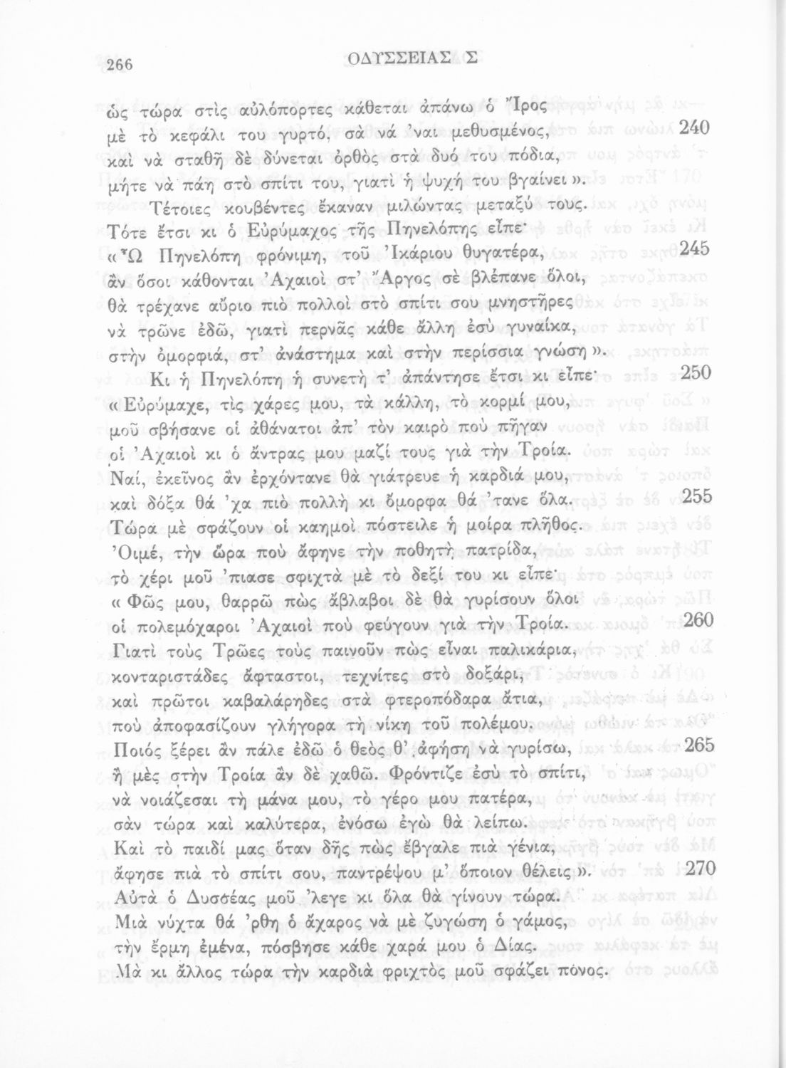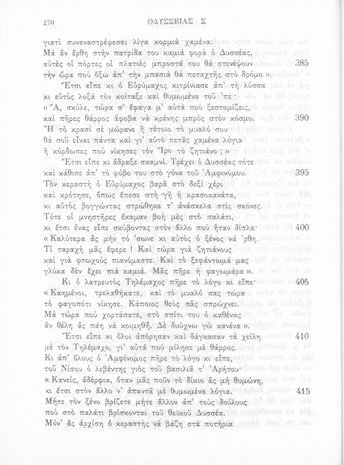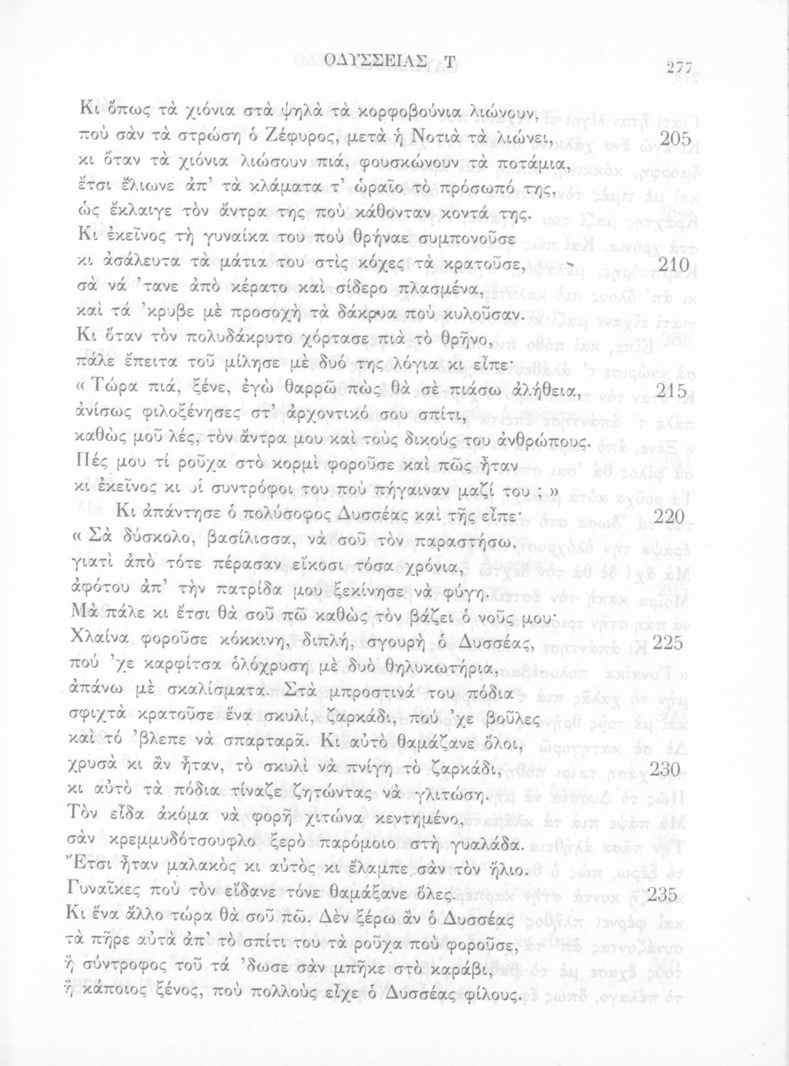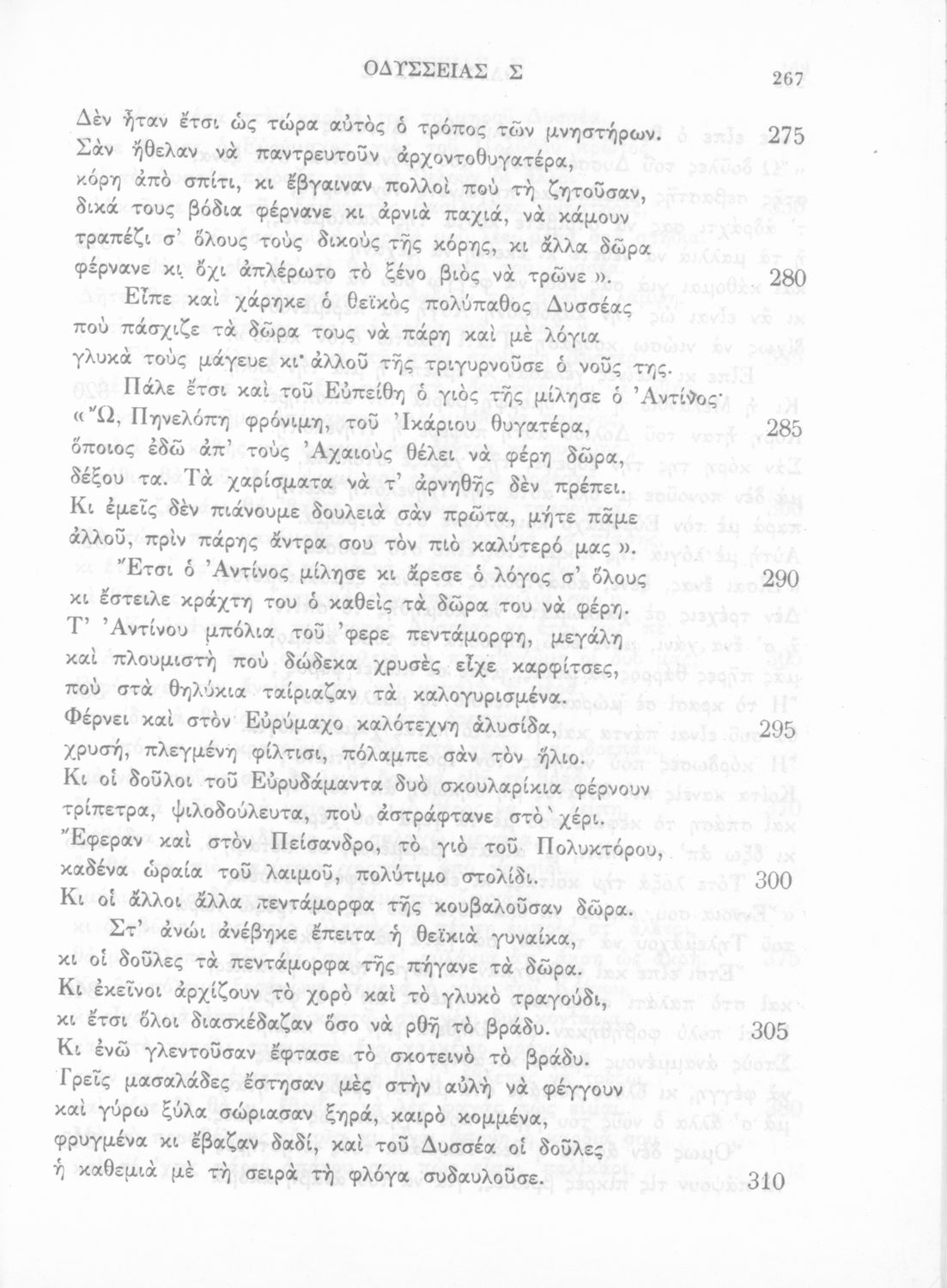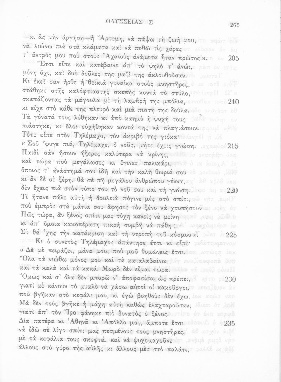 Σχολικό εγχειρίδιο Αρχαίων Ελληνικών. Πρόκειται για "ανάτυπον εμμέτρου μεταφράσεως εκ της σειράς τω ν227 τόμων ΑΡΧΑΙΩΝ ΕΛΛΗΝΩΝ ΣΥΓΓΡΑΦΕΩΝ ιδιοκτησίας του Εκδοτικού Οίκου Ιωάννου Ν. Ζαχαρόπουλου". Το βιβλίο περιλαμβάνει το έπος της Οδύσσειας σε μετάφραση του Ζήσιμου Σιδέρη. Ακολουθεί ενδεικτικό Λεξιλόγιο.
