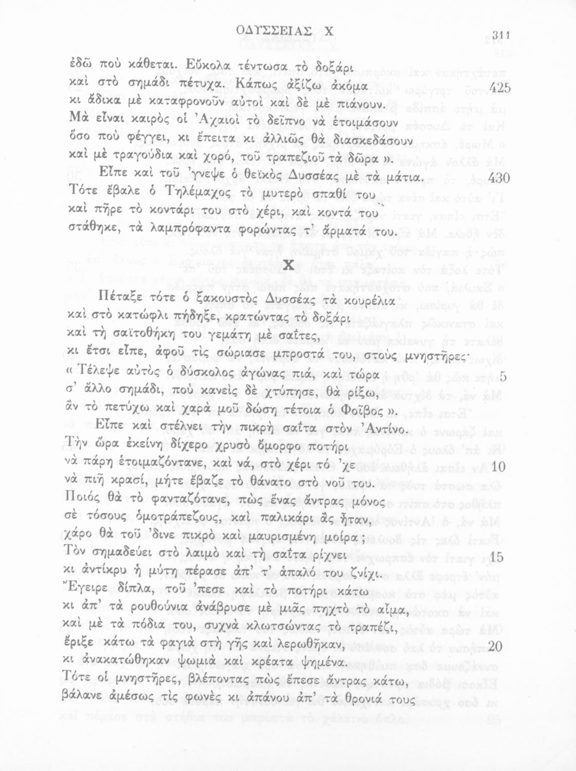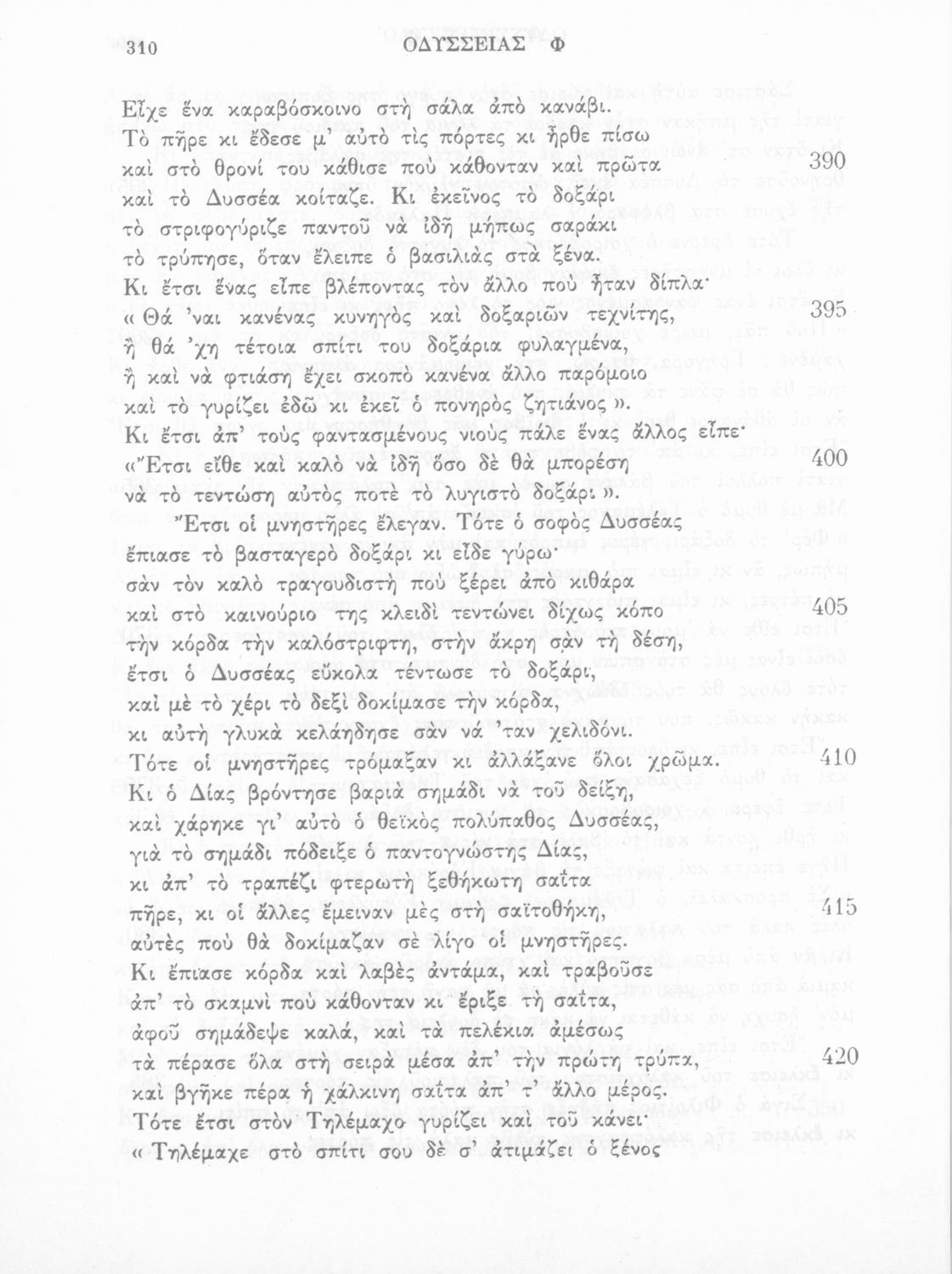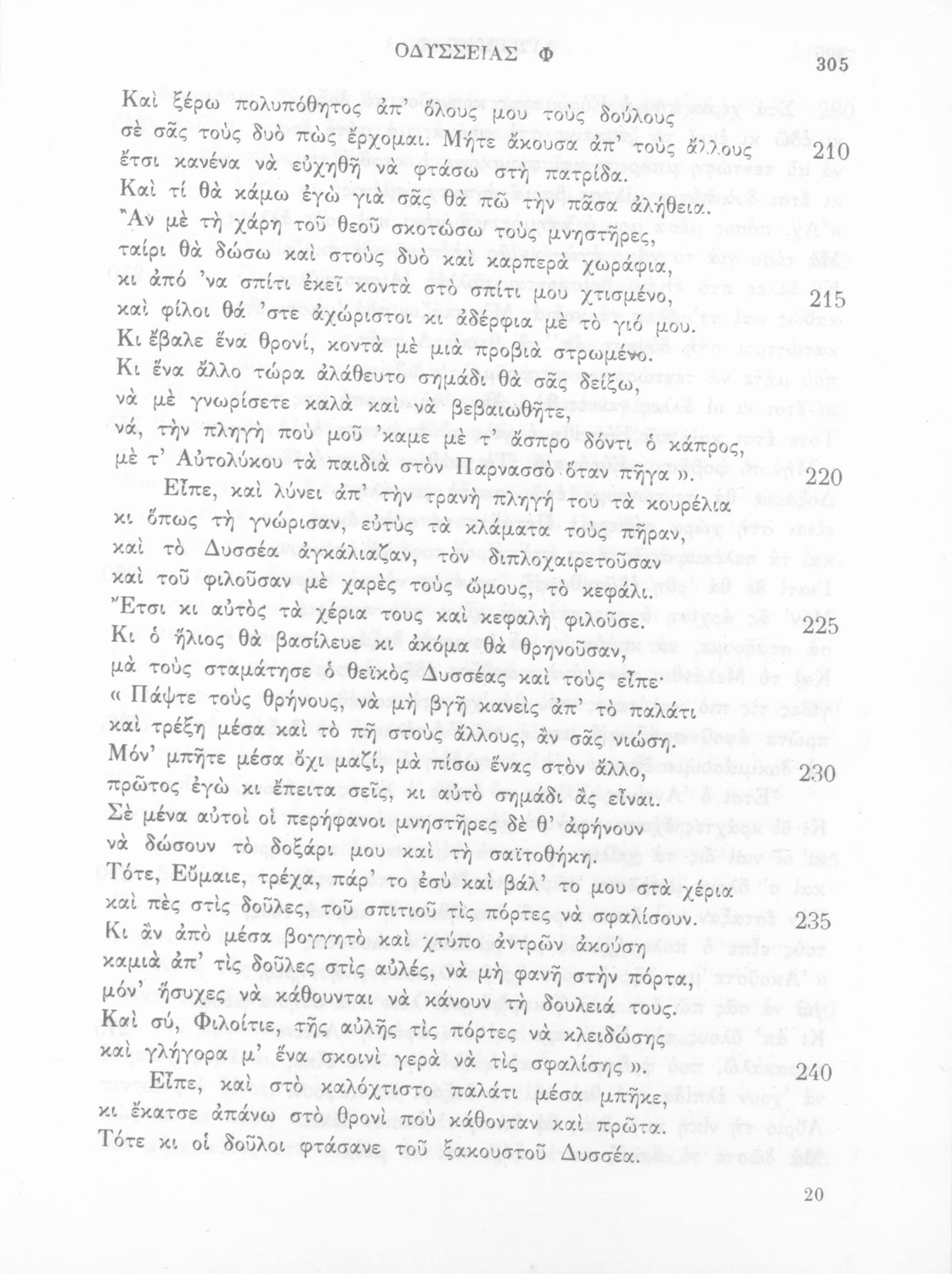 Σχολικό εγχειρίδιο Αρχαίων Ελληνικών. Πρόκειται για "ανάτυπον εμμέτρου μεταφράσεως εκ της σειράς τω ν227 τόμων ΑΡΧΑΙΩΝ ΕΛΛΗΝΩΝ ΣΥΓΓΡΑΦΕΩΝ ιδιοκτησίας του Εκδοτικού Οίκου Ιωάννου Ν. Ζαχαρόπουλου". Το βιβλίο περιλαμβάνει το έπος της Οδύσσειας σε μετάφραση του Ζήσιμου Σιδέρη. Ακολουθεί ενδεικτικό Λεξιλόγιο.