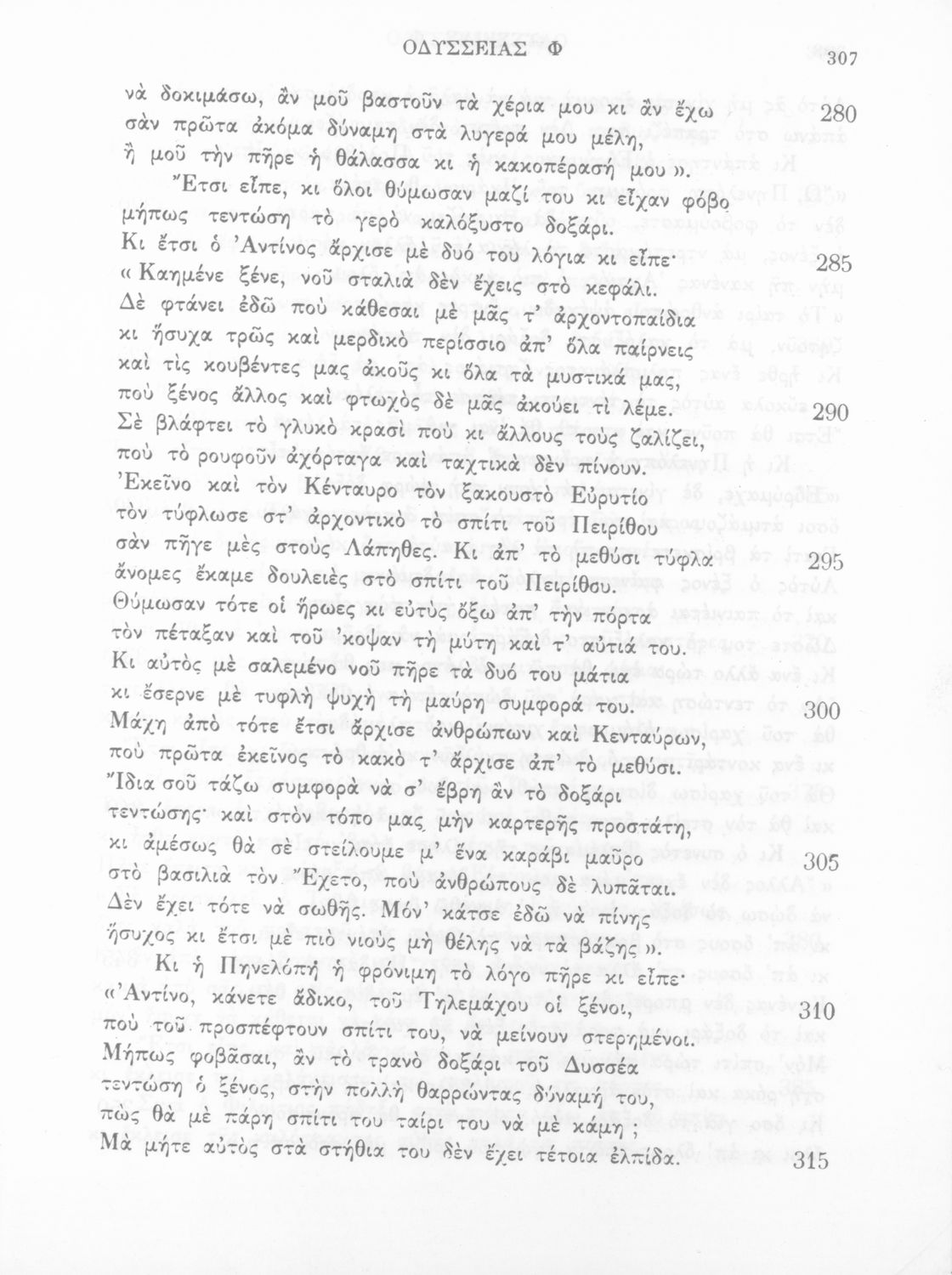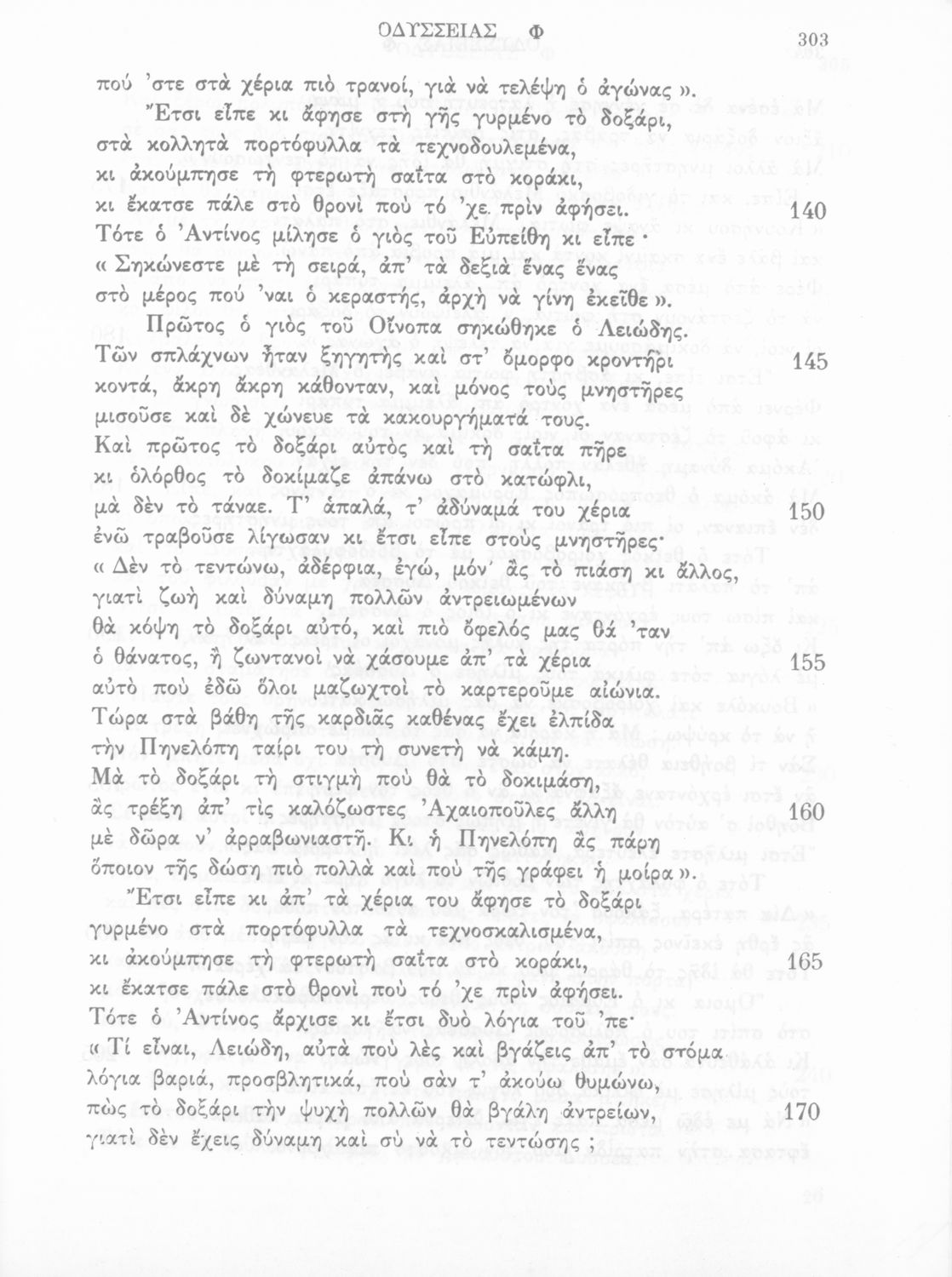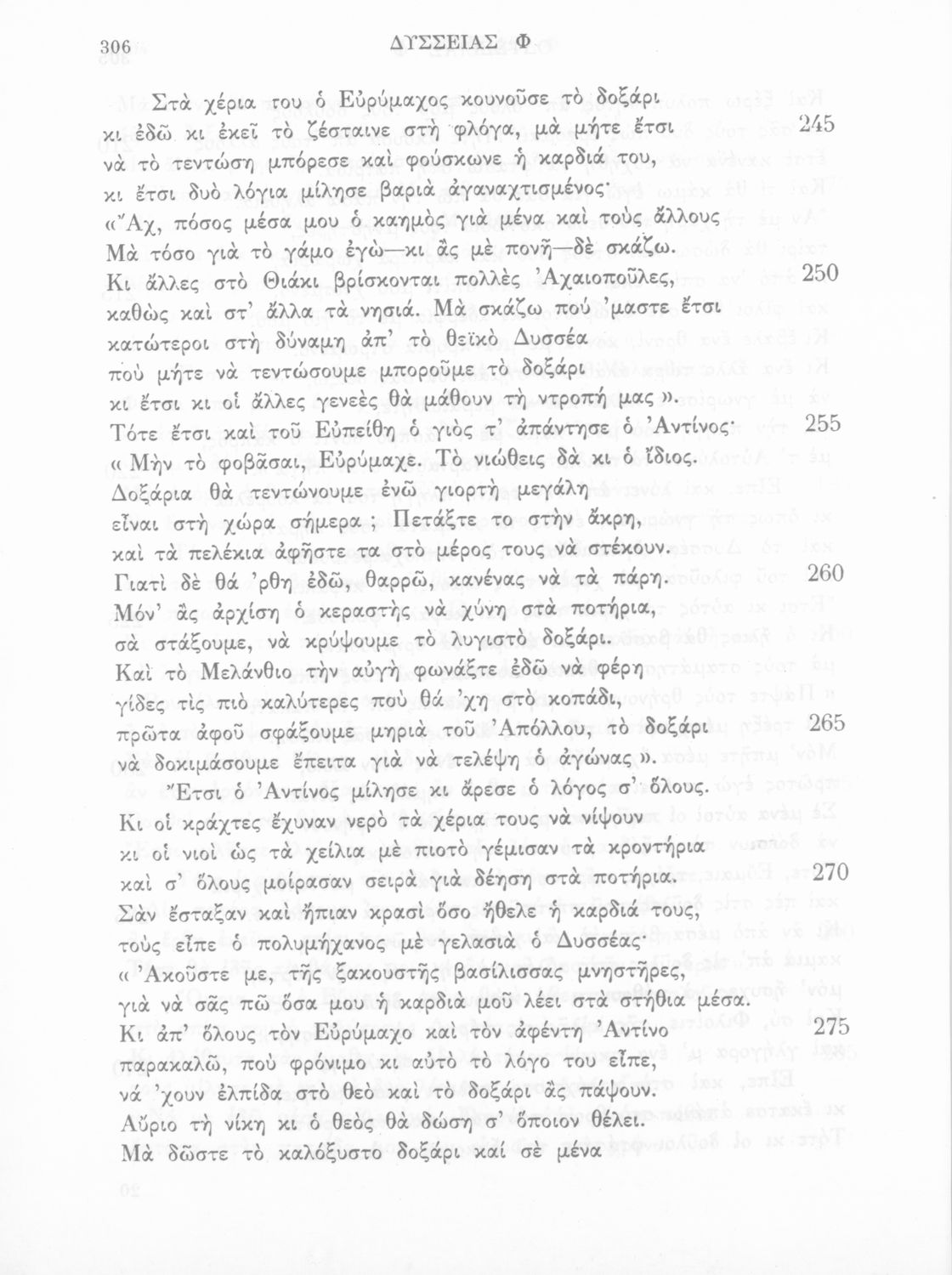 Σχολικό εγχειρίδιο Αρχαίων Ελληνικών. Πρόκειται για "ανάτυπον εμμέτρου μεταφράσεως εκ της σειράς τω ν227 τόμων ΑΡΧΑΙΩΝ ΕΛΛΗΝΩΝ ΣΥΓΓΡΑΦΕΩΝ ιδιοκτησίας του Εκδοτικού Οίκου Ιωάννου Ν. Ζαχαρόπουλου". Το βιβλίο περιλαμβάνει το έπος της Οδύσσειας σε μετάφραση του Ζήσιμου Σιδέρη. Ακολουθεί ενδεικτικό Λεξιλόγιο.