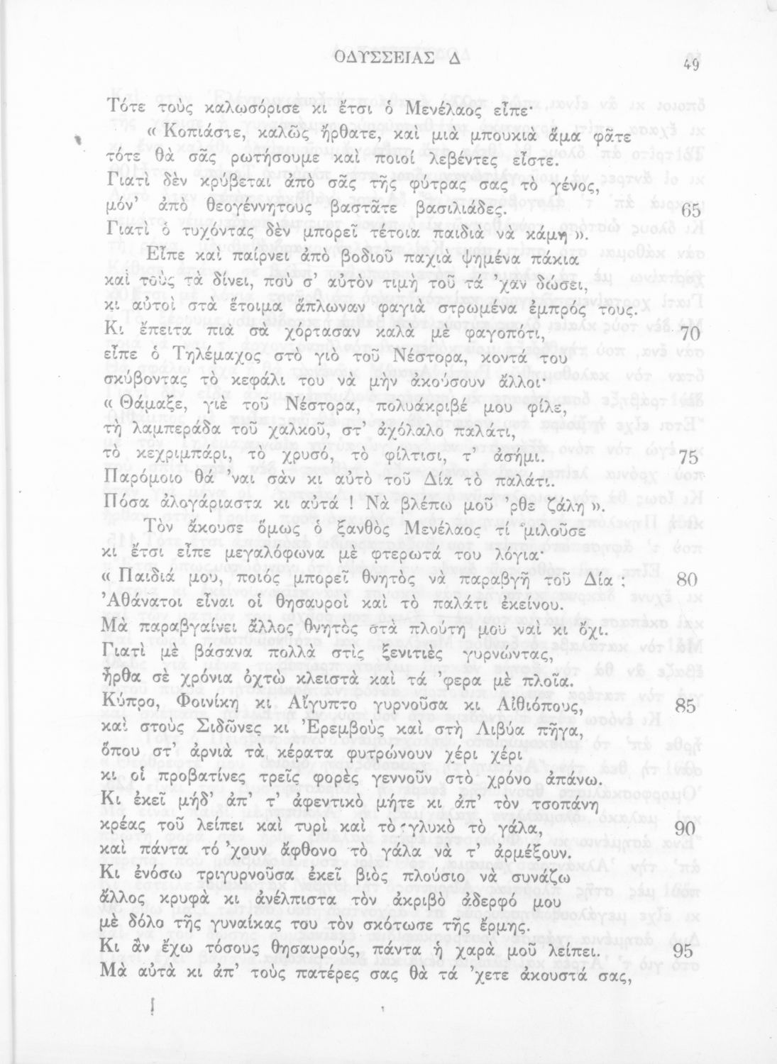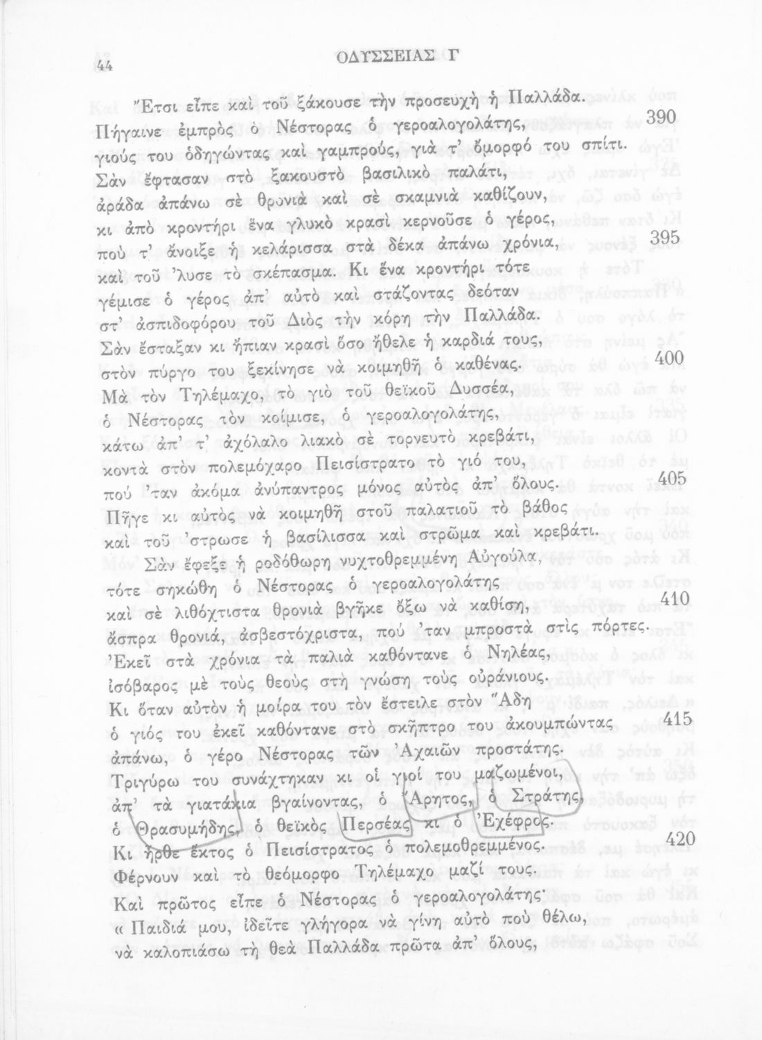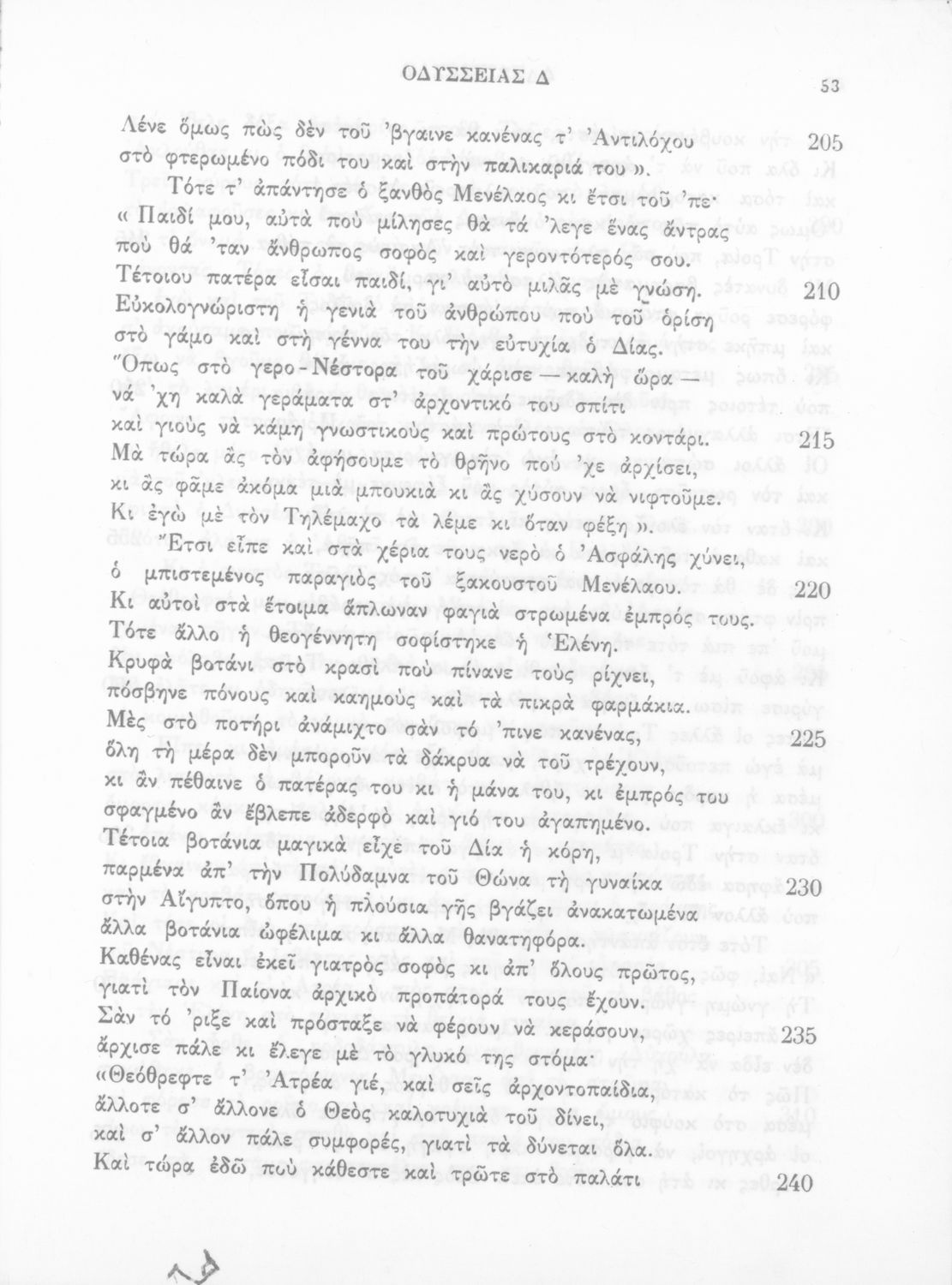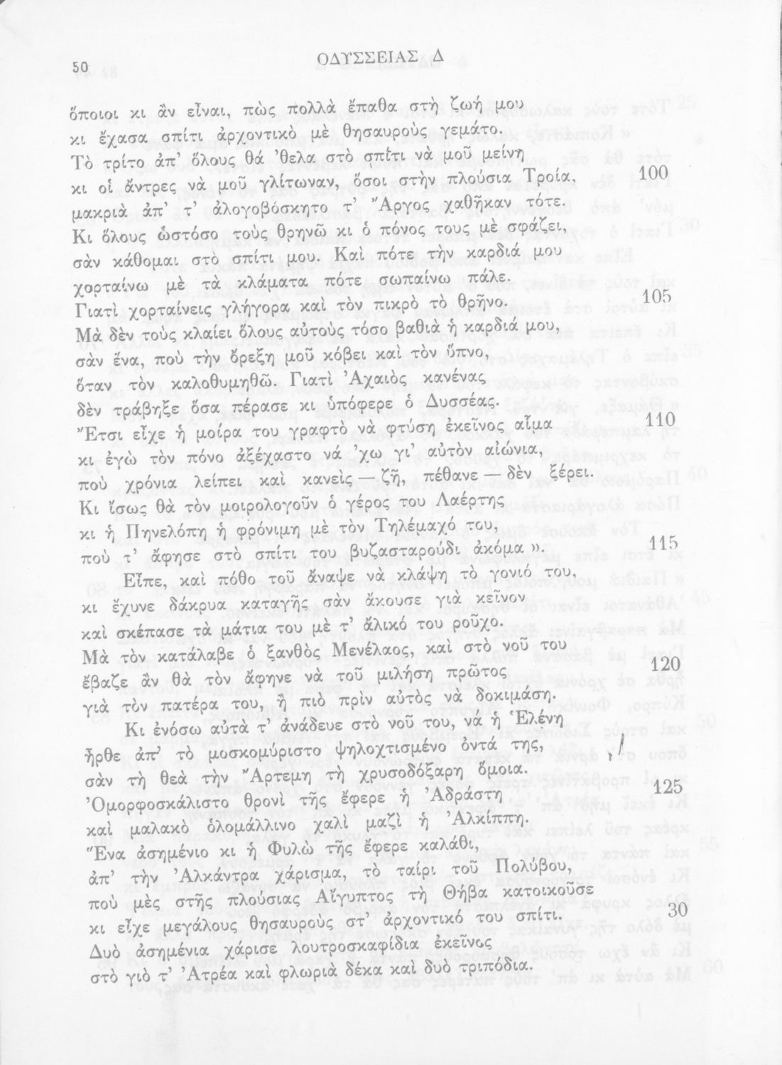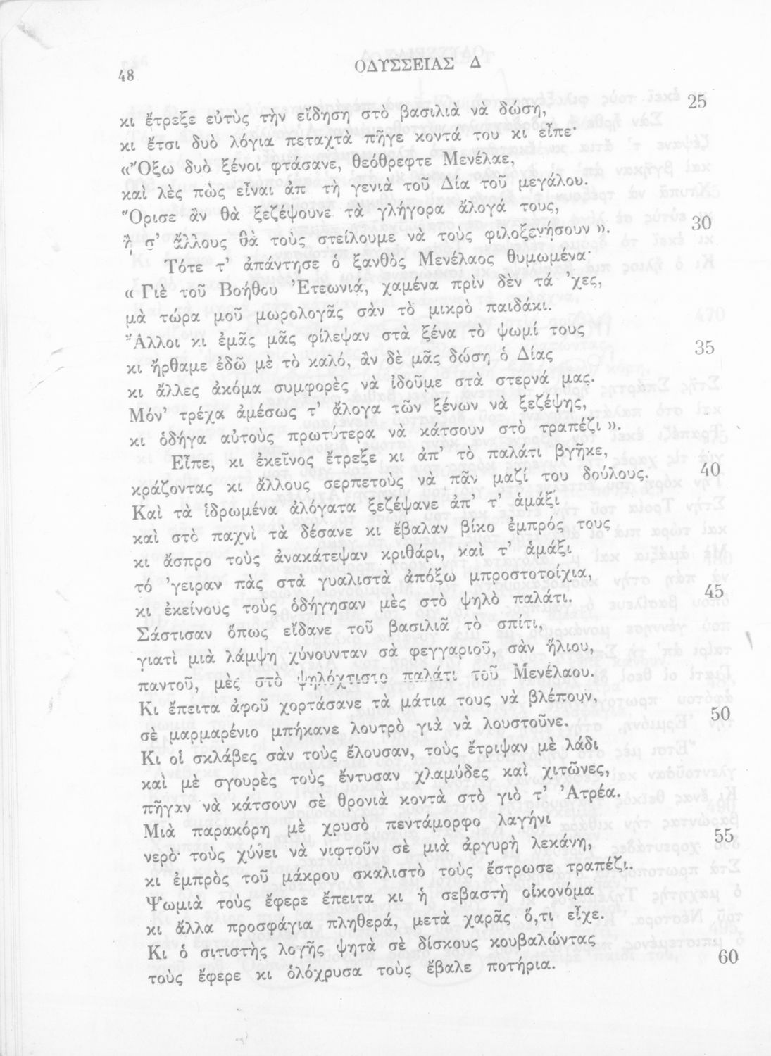 Σχολικό εγχειρίδιο Αρχαίων Ελληνικών. Πρόκειται για "ανάτυπον εμμέτρου μεταφράσεως εκ της σειράς τω ν227 τόμων ΑΡΧΑΙΩΝ ΕΛΛΗΝΩΝ ΣΥΓΓΡΑΦΕΩΝ ιδιοκτησίας του Εκδοτικού Οίκου Ιωάννου Ν. Ζαχαρόπουλου". Το βιβλίο περιλαμβάνει το έπος της Οδύσσειας σε μετάφραση του Ζήσιμου Σιδέρη. Ακολουθεί ενδεικτικό Λεξιλόγιο.