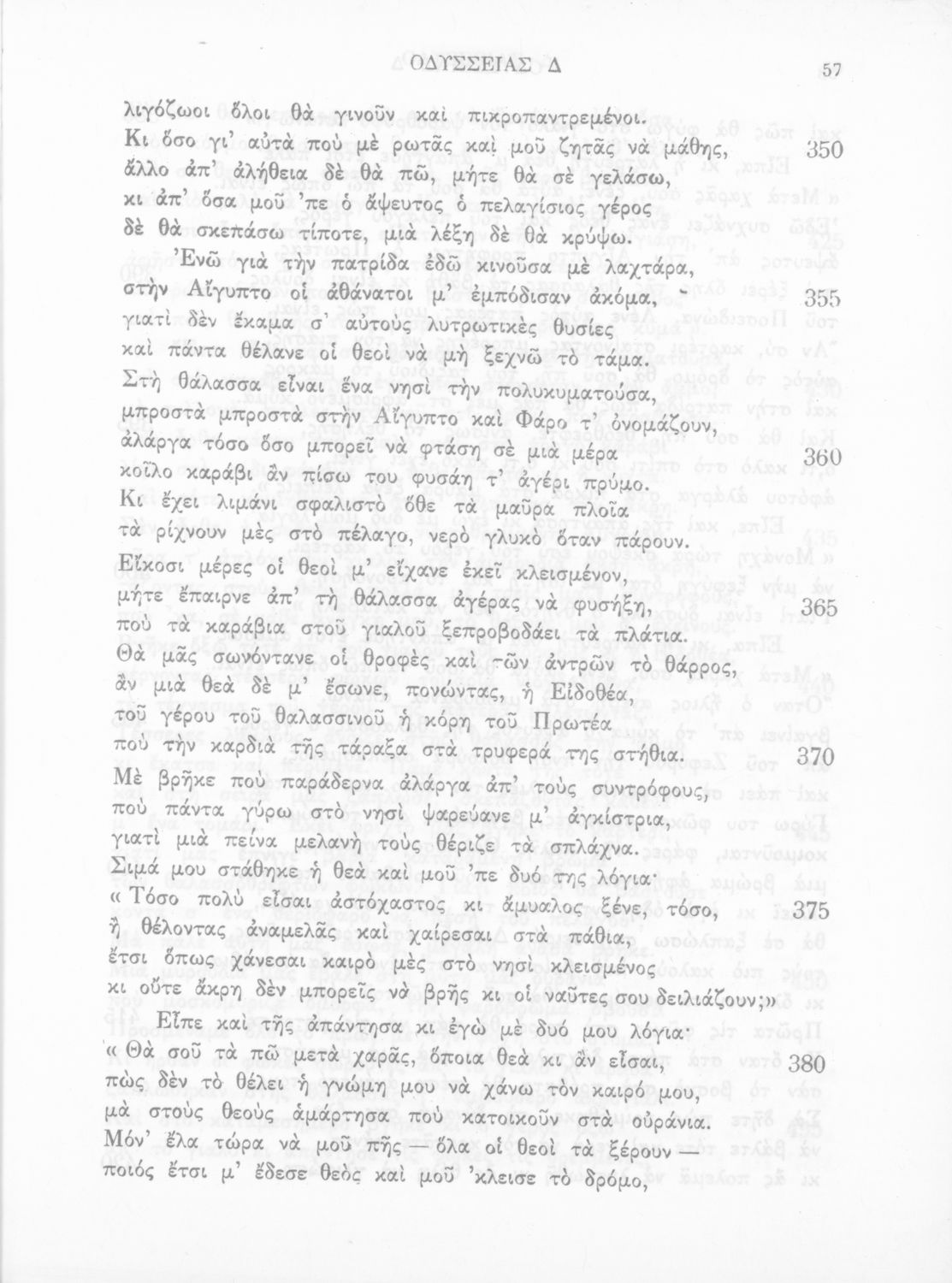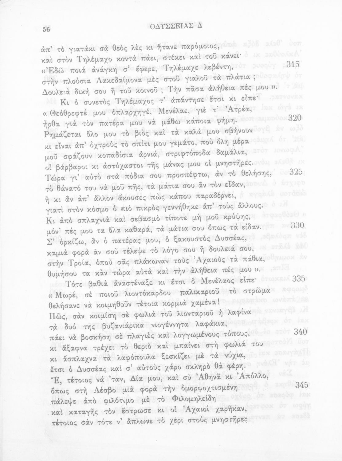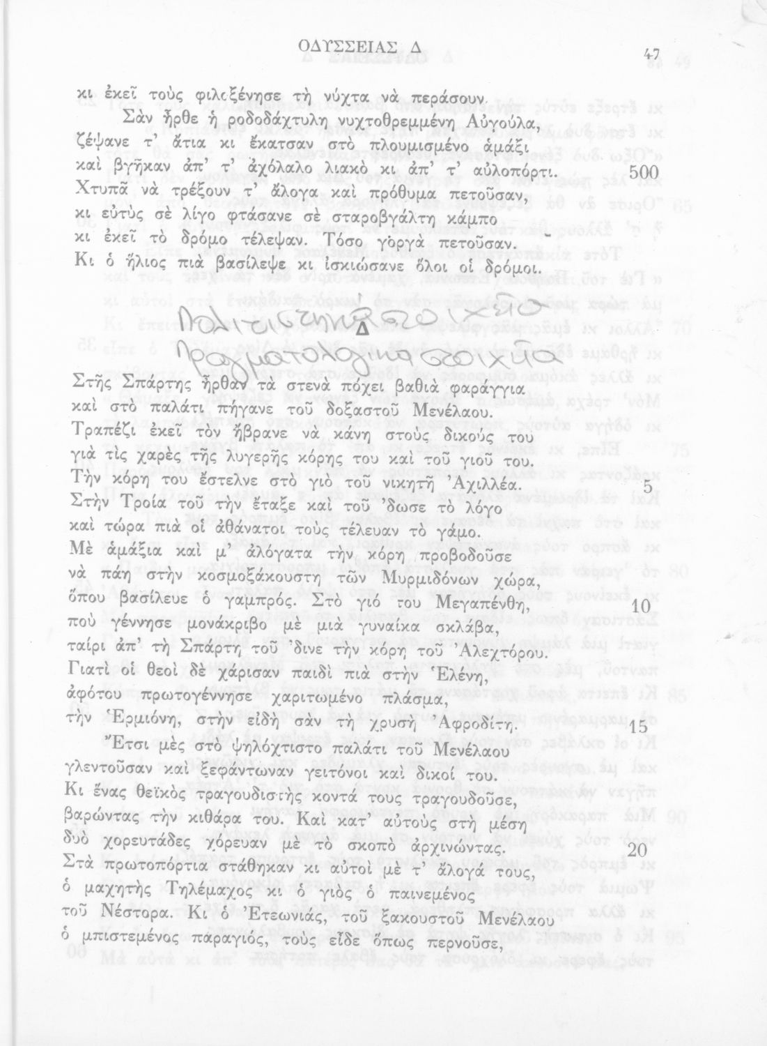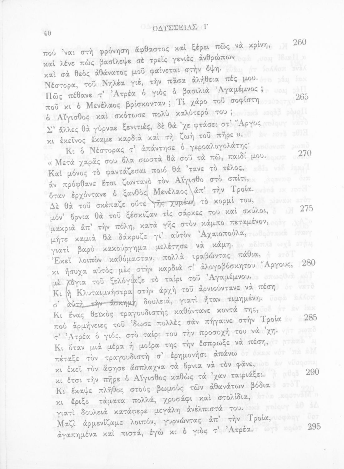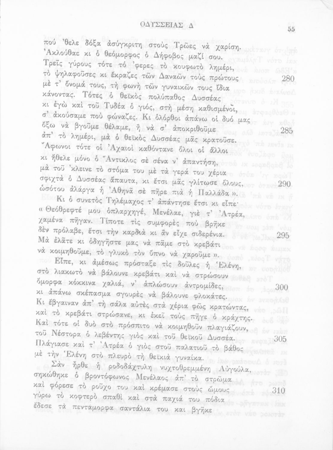 Σχολικό εγχειρίδιο Αρχαίων Ελληνικών. Πρόκειται για "ανάτυπον εμμέτρου μεταφράσεως εκ της σειράς τω ν227 τόμων ΑΡΧΑΙΩΝ ΕΛΛΗΝΩΝ ΣΥΓΓΡΑΦΕΩΝ ιδιοκτησίας του Εκδοτικού Οίκου Ιωάννου Ν. Ζαχαρόπουλου". Το βιβλίο περιλαμβάνει το έπος της Οδύσσειας σε μετάφραση του Ζήσιμου Σιδέρη. Ακολουθεί ενδεικτικό Λεξιλόγιο.