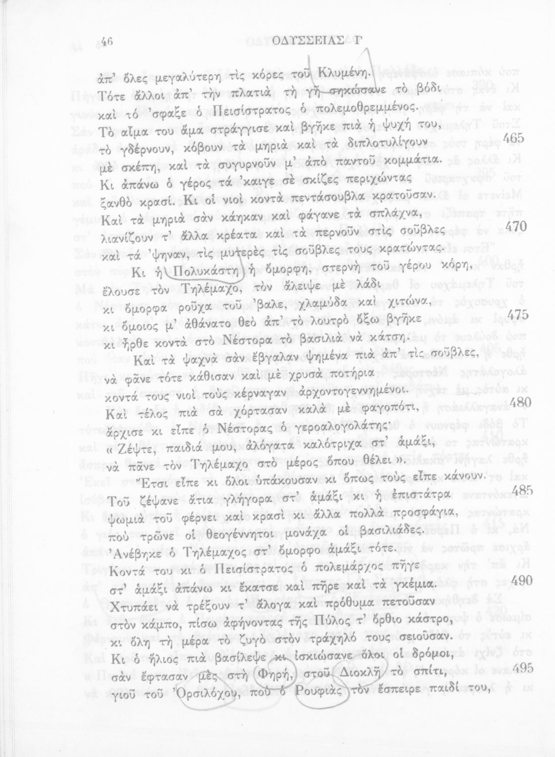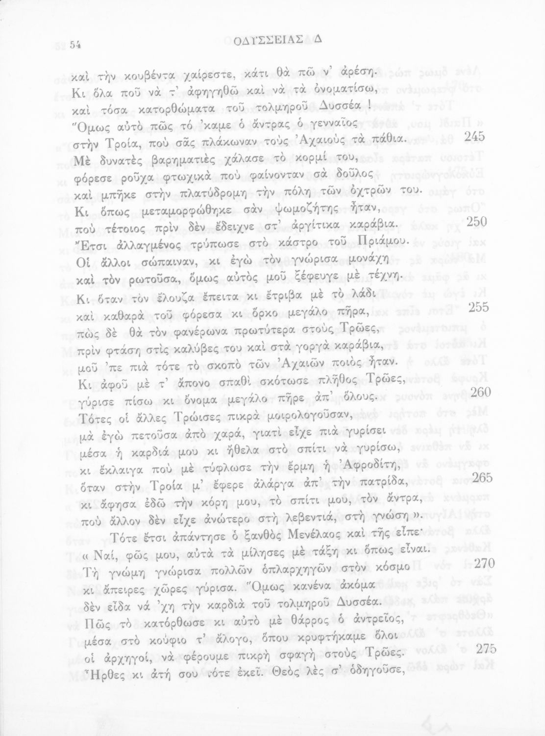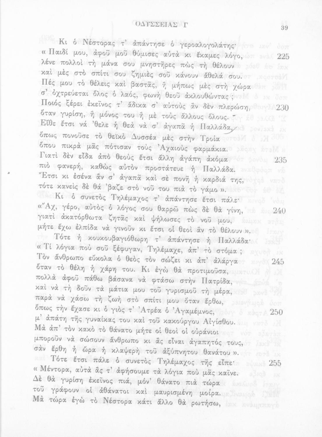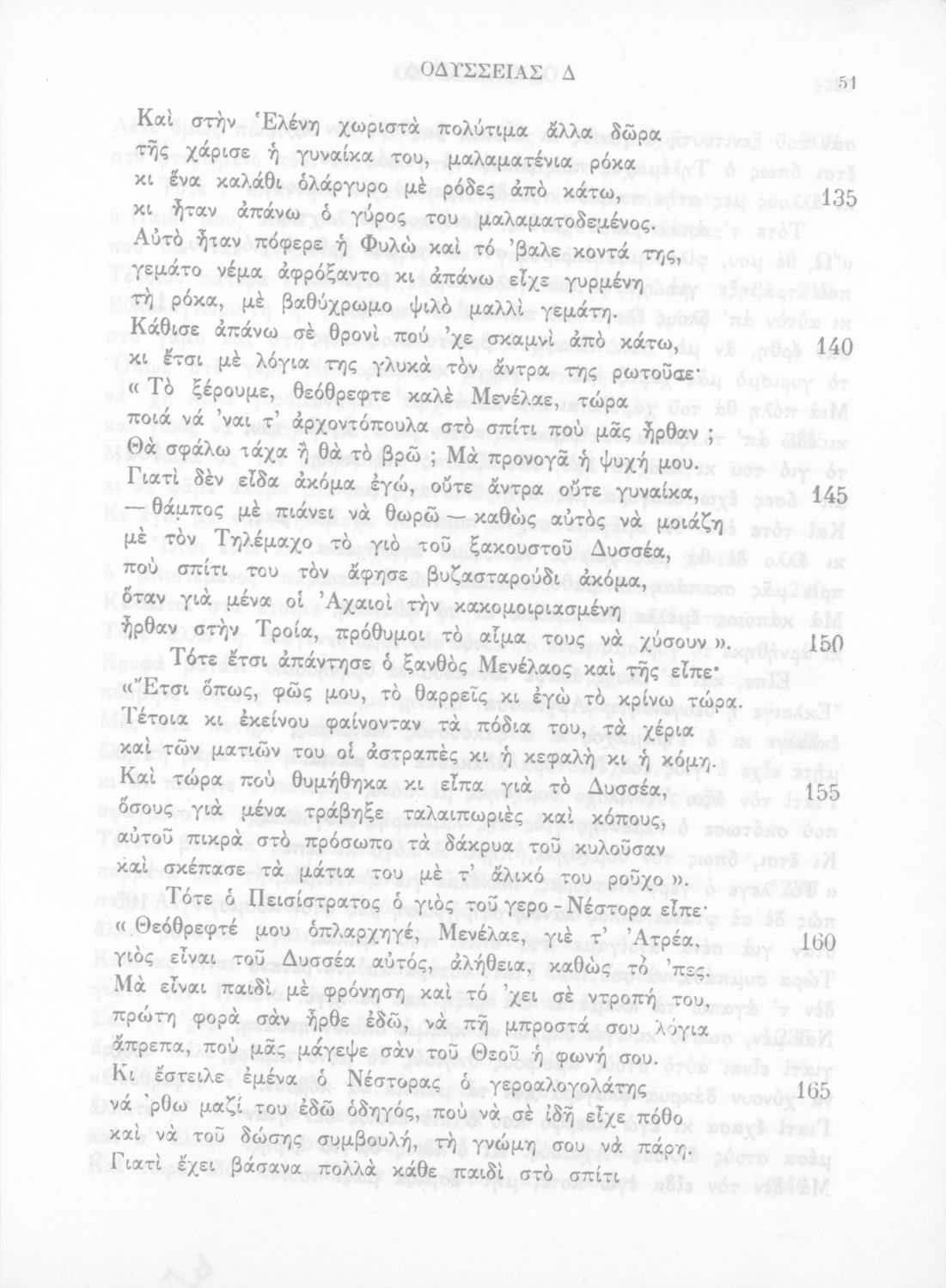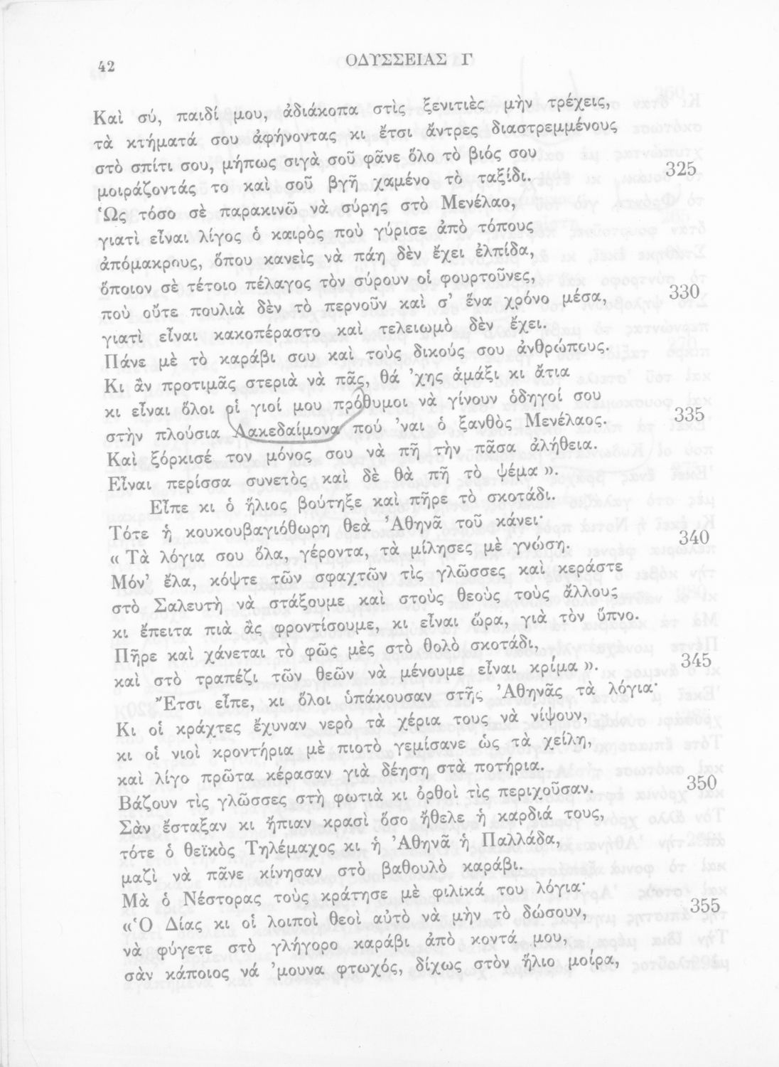 Σχολικό εγχειρίδιο Αρχαίων Ελληνικών. Πρόκειται για "ανάτυπον εμμέτρου μεταφράσεως εκ της σειράς τω ν227 τόμων ΑΡΧΑΙΩΝ ΕΛΛΗΝΩΝ ΣΥΓΓΡΑΦΕΩΝ ιδιοκτησίας του Εκδοτικού Οίκου Ιωάννου Ν. Ζαχαρόπουλου". Το βιβλίο περιλαμβάνει το έπος της Οδύσσειας σε μετάφραση του Ζήσιμου Σιδέρη. Ακολουθεί ενδεικτικό Λεξιλόγιο.