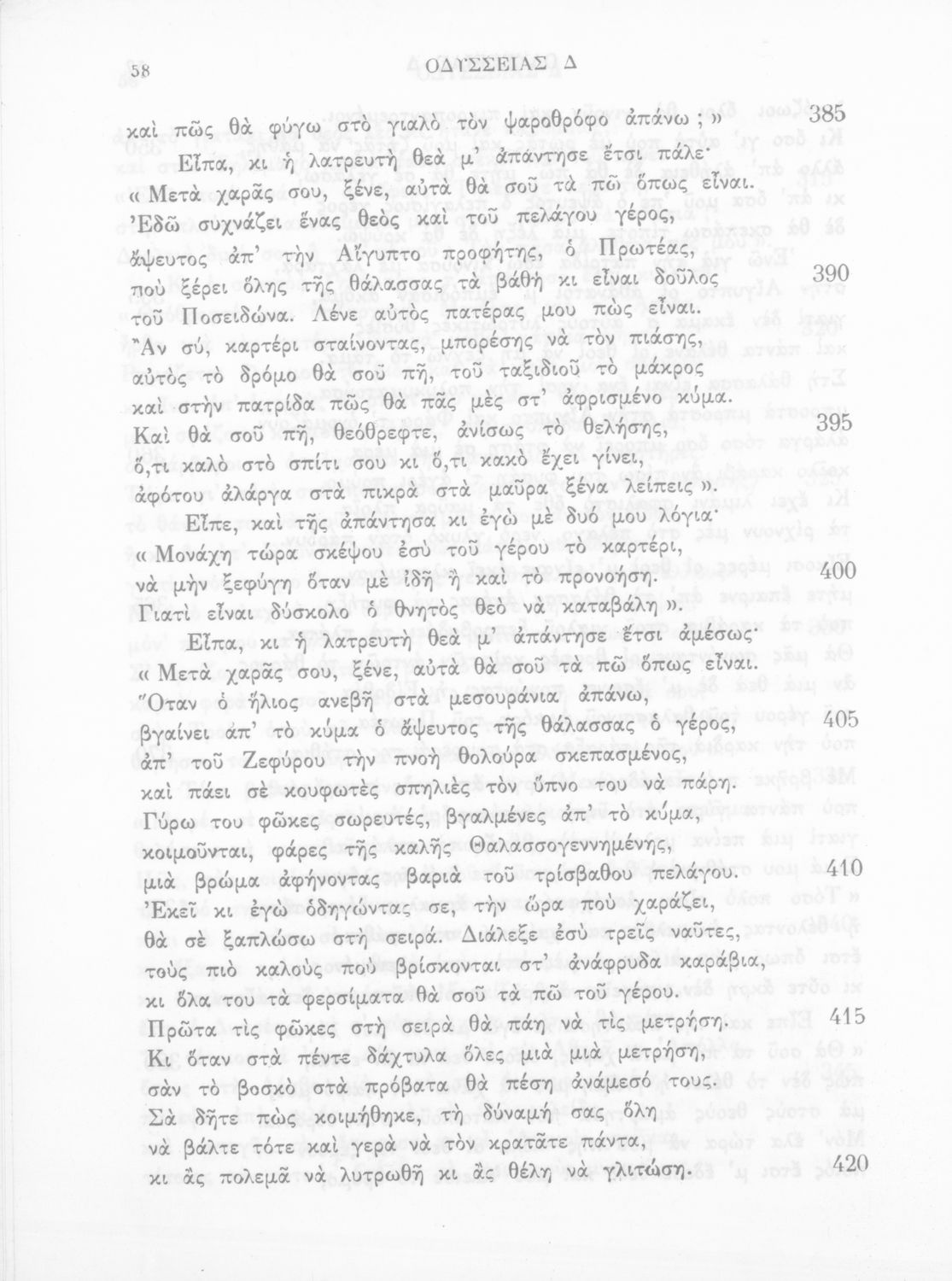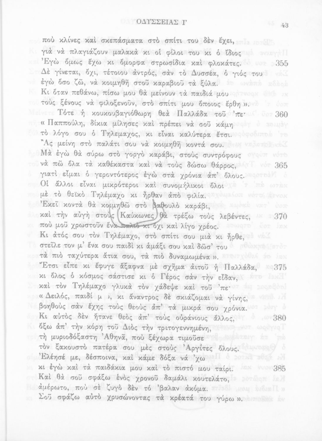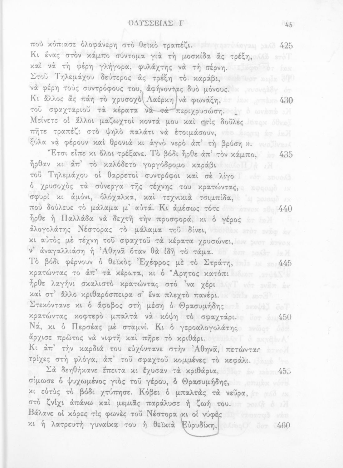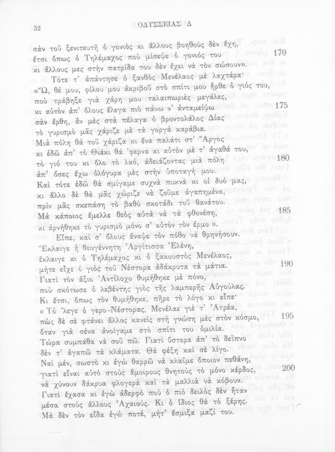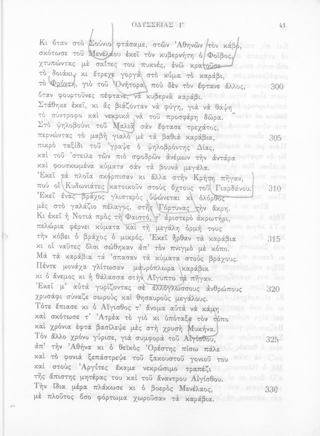 Σχολικό εγχειρίδιο Αρχαίων Ελληνικών. Πρόκειται για "ανάτυπον εμμέτρου μεταφράσεως εκ της σειράς τω ν227 τόμων ΑΡΧΑΙΩΝ ΕΛΛΗΝΩΝ ΣΥΓΓΡΑΦΕΩΝ ιδιοκτησίας του Εκδοτικού Οίκου Ιωάννου Ν. Ζαχαρόπουλου". Το βιβλίο περιλαμβάνει το έπος της Οδύσσειας σε μετάφραση του Ζήσιμου Σιδέρη. Ακολουθεί ενδεικτικό Λεξιλόγιο.
