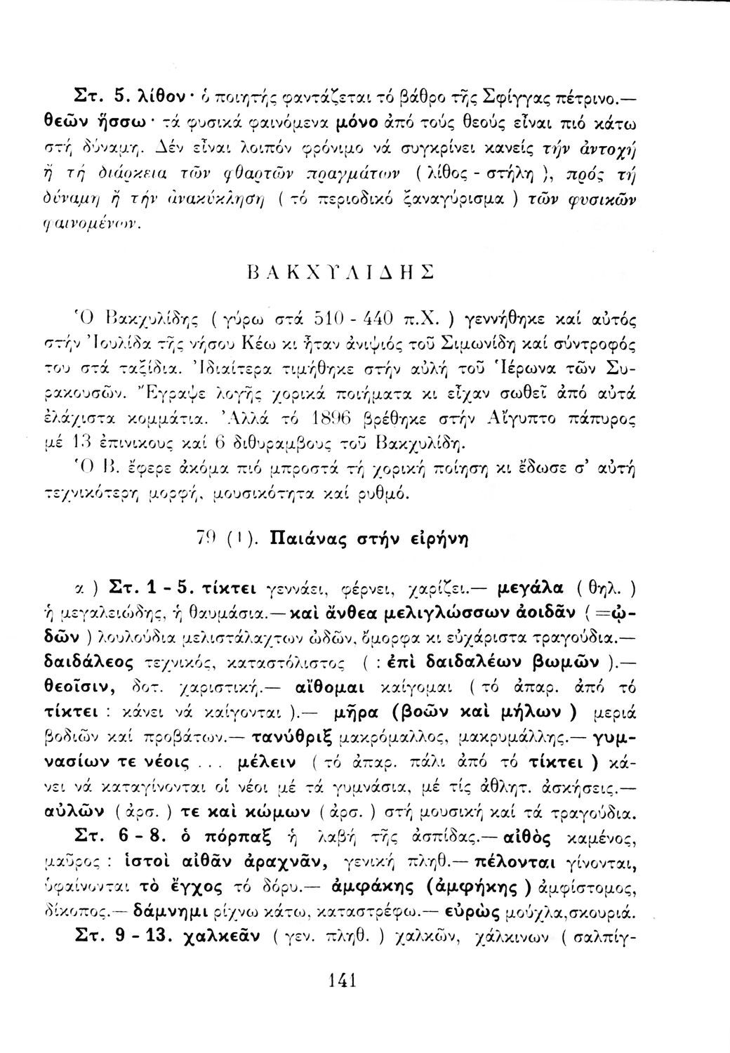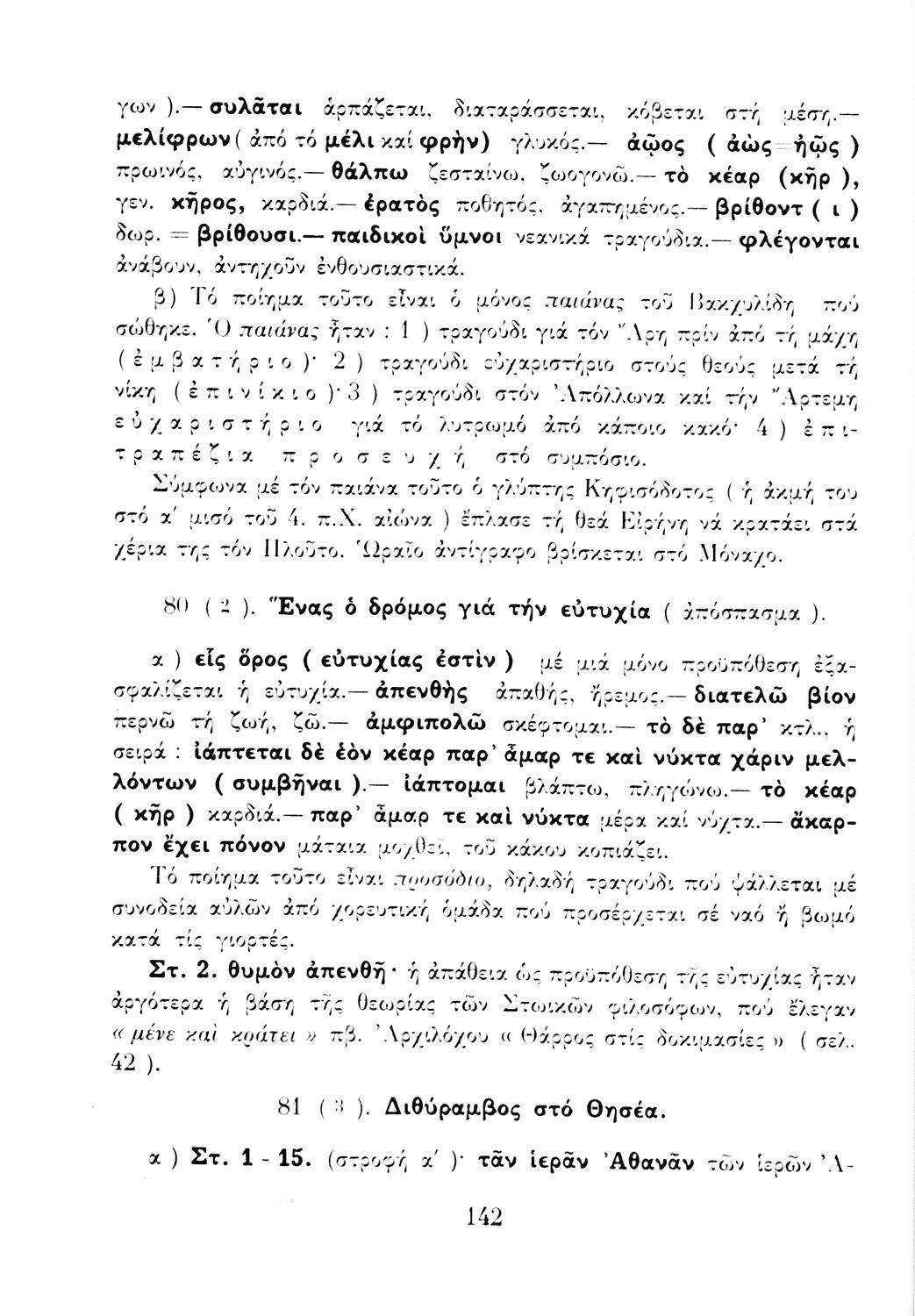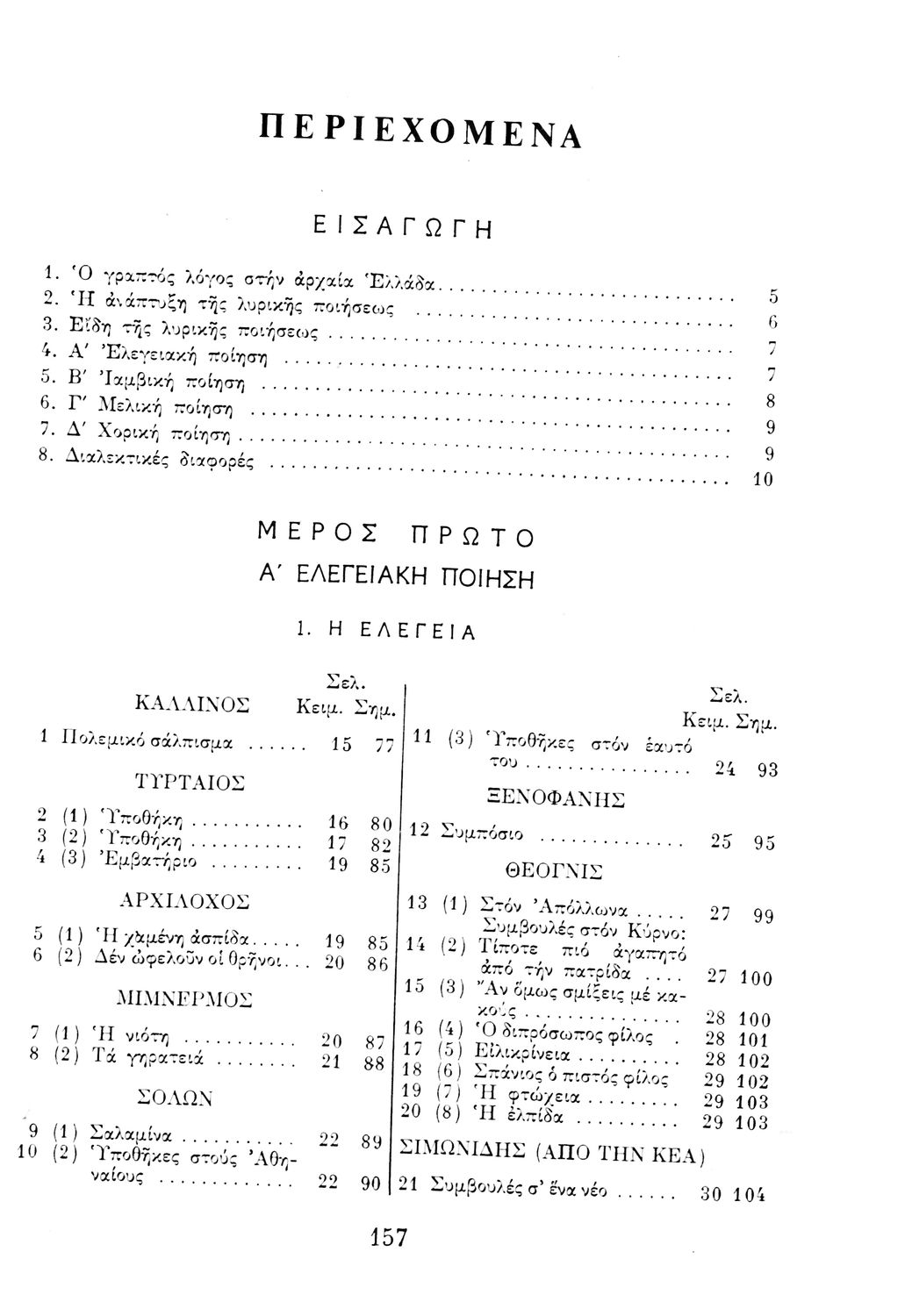 Σχολικό εγχειρίδιο Αρχαίων Ελληνικών Γ΄ Λυκείου που περιλαμβάνει εισαγωγή στη λυρική ποίηση, έργα αρχαίων Ελλήνων ποιητών, ερμηνευτικά και πραγματολογικά σχόλια, και λεξιλογικές παρατηρήσεις. Η εισαγωγή, τα σημειώματα και οι ερμηνευτικές σημειώσεις μεταγλωττίστηκαν από τον επ. Γεν. Επιθεωρητή Μ.Ε. Δορμπαράκη.