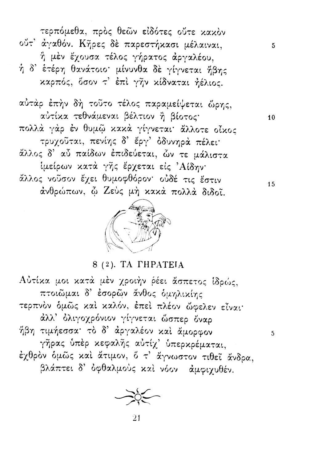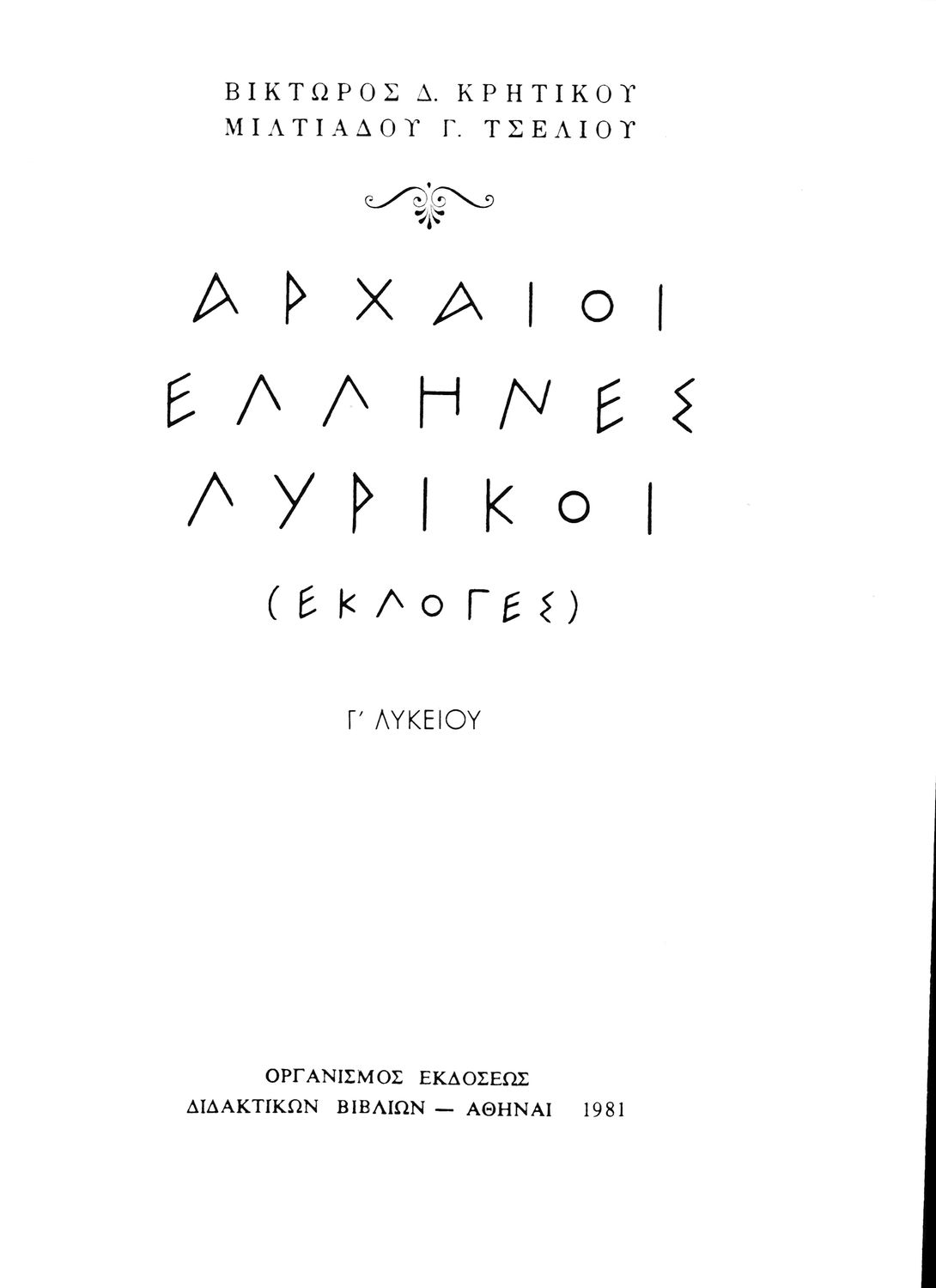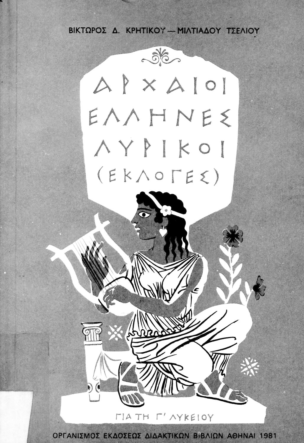 Σχολικό εγχειρίδιο Αρχαίων Ελληνικών Γ΄ Λυκείου που περιλαμβάνει εισαγωγή στη λυρική ποίηση, έργα αρχαίων Ελλήνων ποιητών, ερμηνευτικά και πραγματολογικά σχόλια, και λεξιλογικές παρατηρήσεις. Η εισαγωγή, τα σημειώματα και οι ερμηνευτικές σημειώσεις μεταγλωττίστηκαν από τον επ. Γεν. Επιθεωρητή Μ.Ε. Δορμπαράκη.