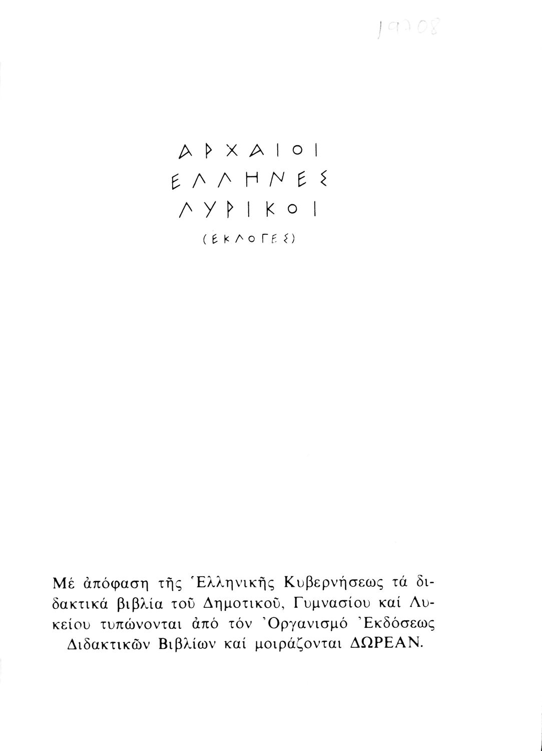 Βαθμίδα εκπαίδευσης: Δευτεροβάθμια Τάξη: Γ' Λυκείου Μάθημα: Αρχαία Ελληνικά Γλώσσα: Δημοτική Παρουσίαση περιεχομένου: Σχολικό εγχειρίδιο Αρχαίων Ελληνικών Γ΄ Λυκείου που περιλαμβάνει εισαγωγή στη λυρική ποίηση, έργα αρχαίων Ελλήνων ποιητών, ερμηνευτικά και πραγματολογικά σχόλια, και λεξιλογικές παρατηρήσεις. Η εισαγωγή, τα σημειώματα και οι ερμηνευτικές σημειώσεις μεταγλωττίστηκαν από τον επ. Γεν. Επιθεωρητή Μ.Ε. Δορμπαράκη. |