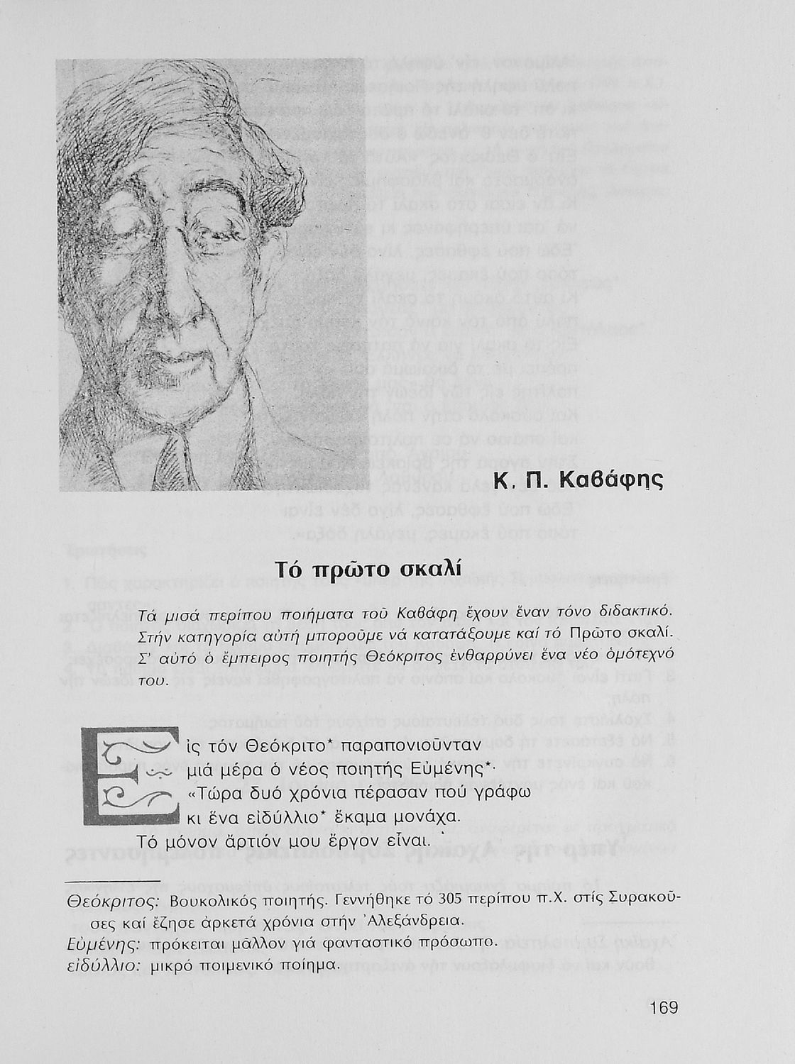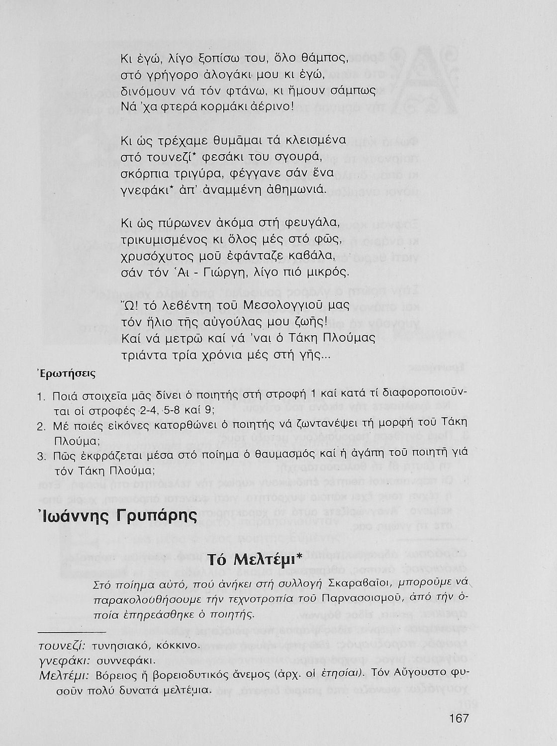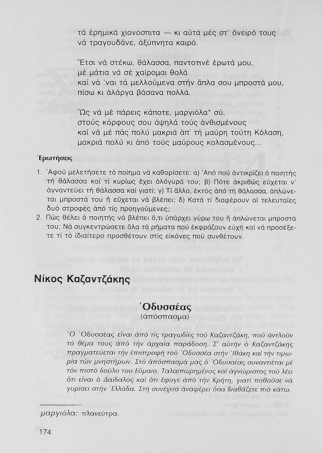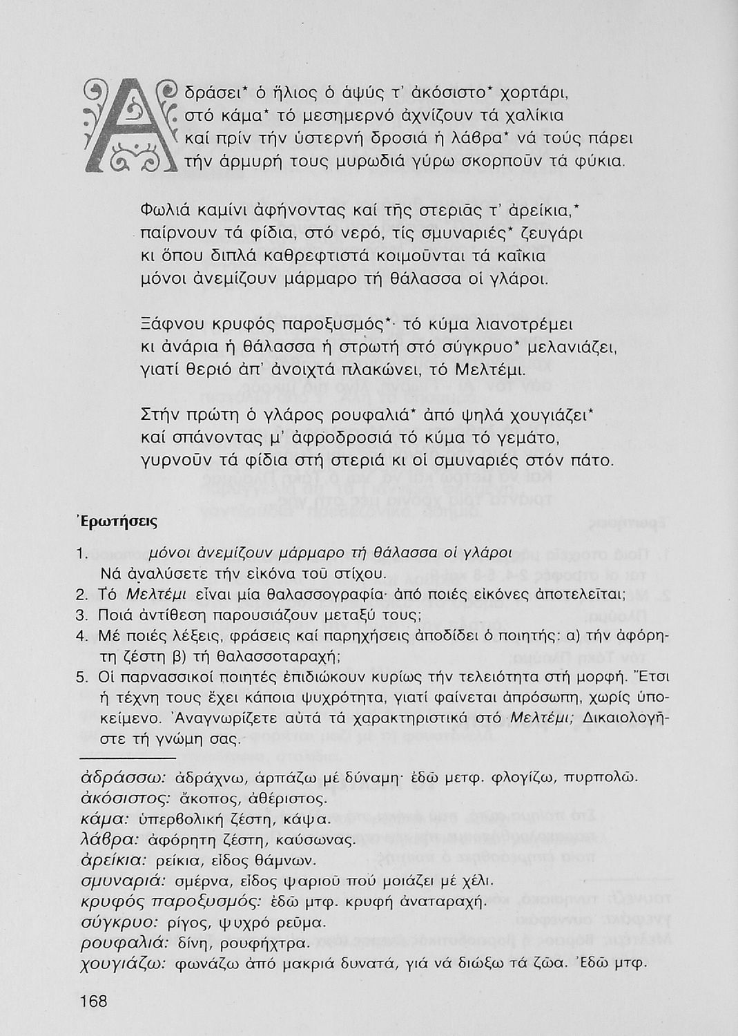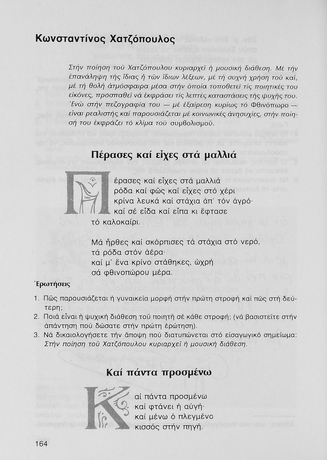 Σχολικό εγχειρίδιο Νέων Ελληνικών Γ΄ Γυμνασίου που περιλαμβάνει δημοτικά τραγούδια, και χαρακτηριστικά δείγματα της κρητικής λογοτεχνίας, της επτανησιακής και ρομαντικής σχολής, της Νέας Αθηναϊκής Σχολής και της νεότερης και μεταπολεμικής λογοτεχνίας. Περιέχει και έργα σύγχρονων ξένων συγγραφέων, βιογραφικά και εισαγωγικά σημειώματα.